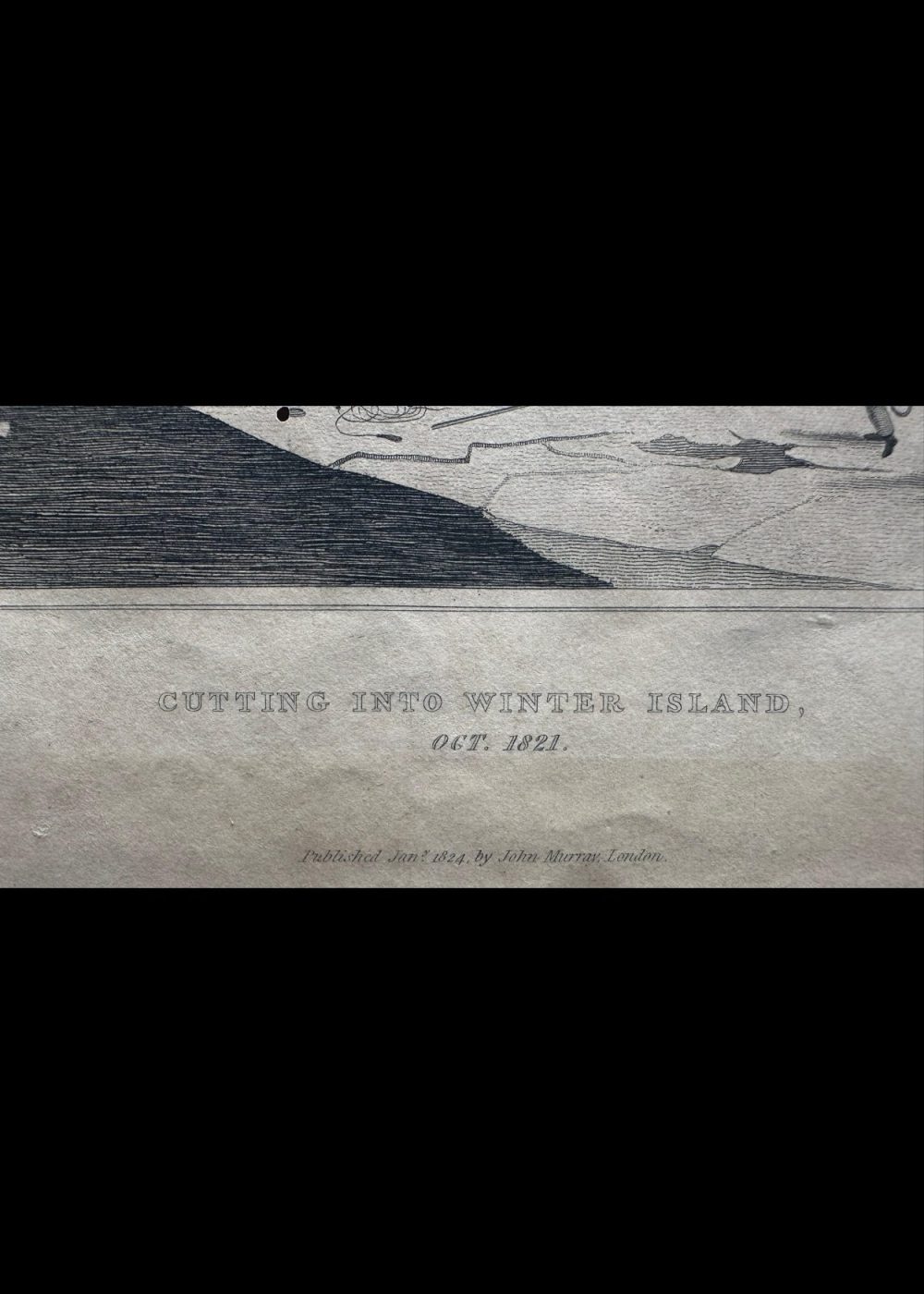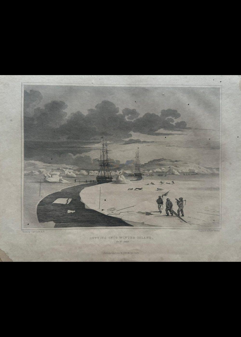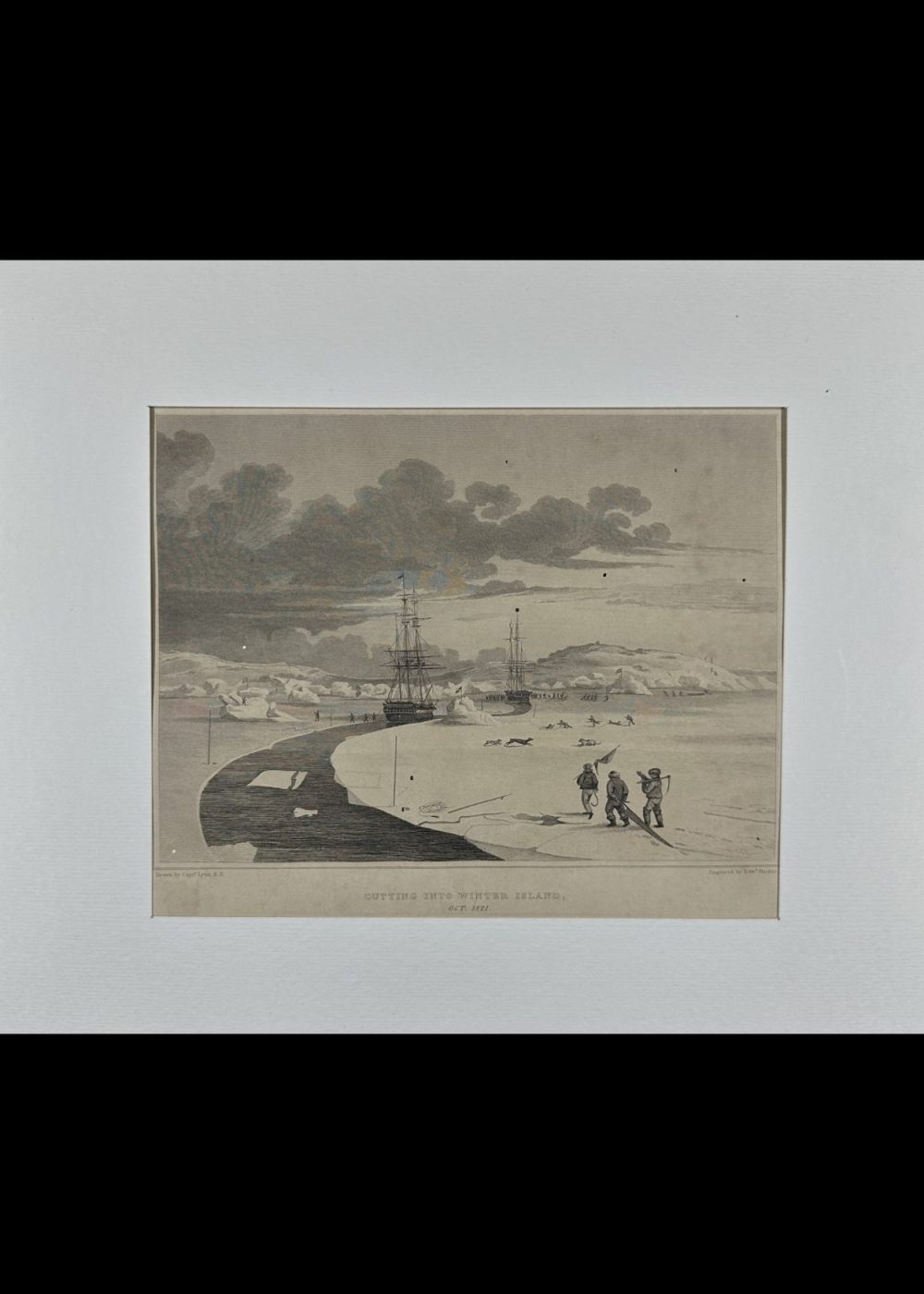 This hand-colored engraving, drawn by Captain Lyon R.N. and engraved by Edward Finden, illustrates a dramatic Arctic scene of early 19th-century exploration. The artwork captures British expedition ships anchored in the frozen expanse of Winter Island as crew members labor to cut a path through the ice. In the foreground, figures signal and interact amid the icy terrain, while sled dogs and distant figures emphasize the scale and isolation of the environment. The sky, dark and foreboding, enhances the sense of impending winter and the harsh conditions faced by polar explorers.