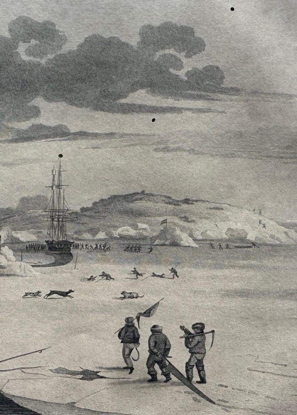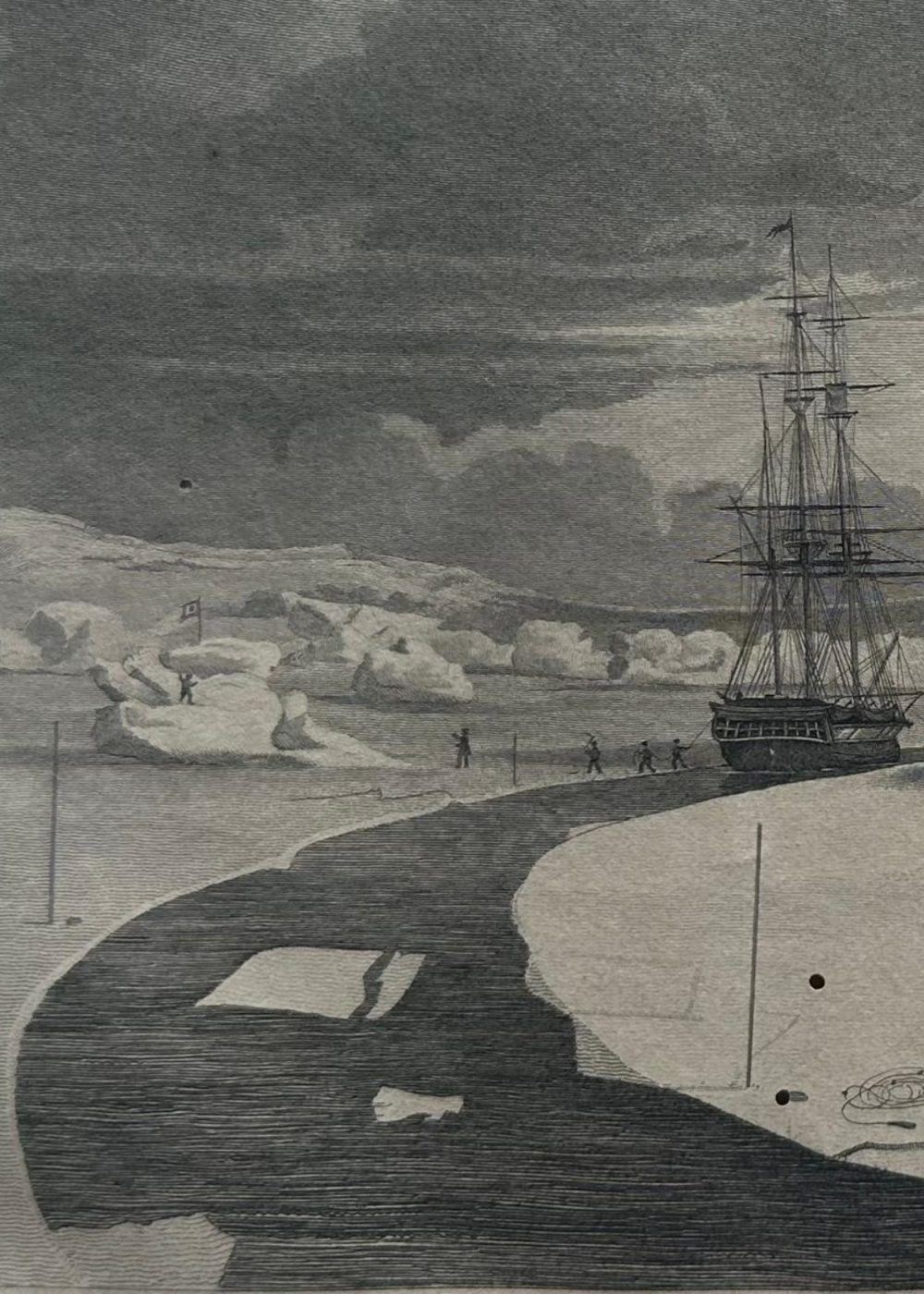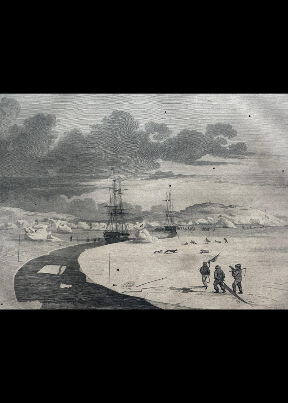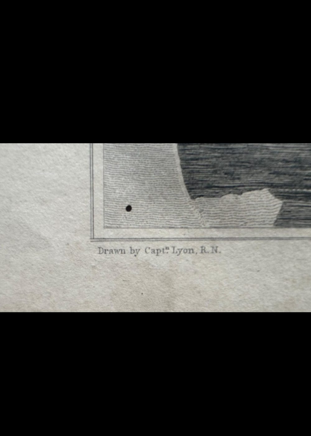 This hand-colored engraving, drawn by Captain Lyon R.N. and engraved by Edward Finden, illustrates a dramatic Arctic scene of early 19th-century exploration. The artwork captures British expedition ships anchored in the frozen expanse of Winter Island as crew members labor to cut a path through the ice. In the foreground, figures signal and interact amid the icy terrain, while sled dogs and distant figures emphasize the scale and isolation of the environment. The sky, dark and foreboding, enhances the sense of impending winter and the harsh conditions faced by polar explorers.
