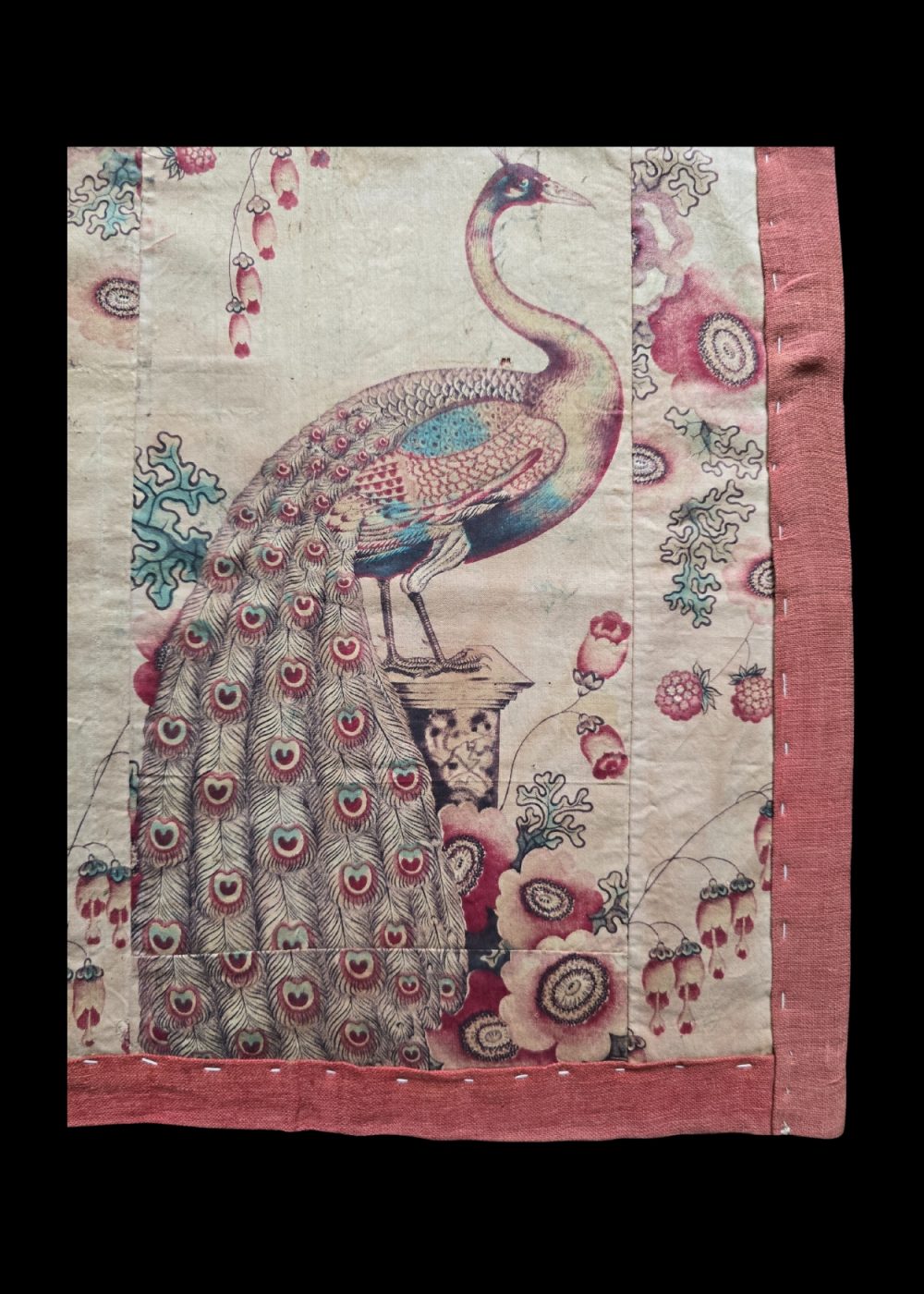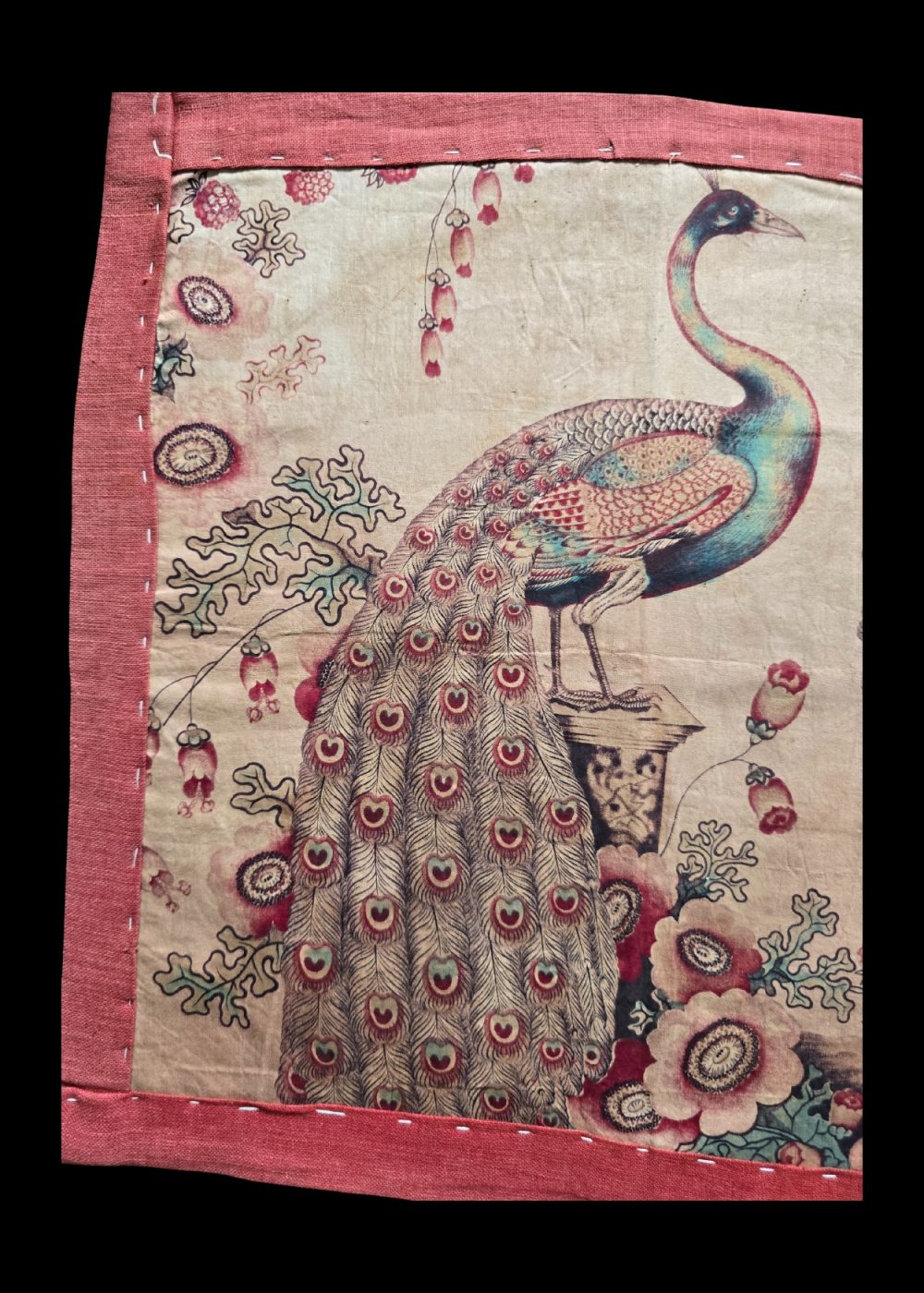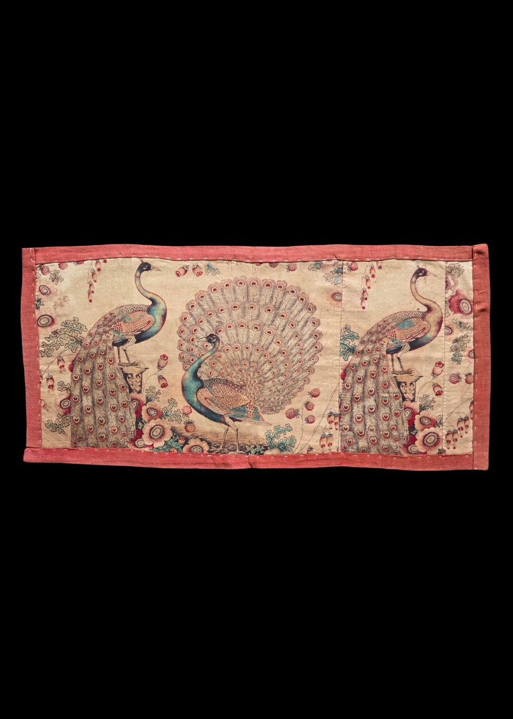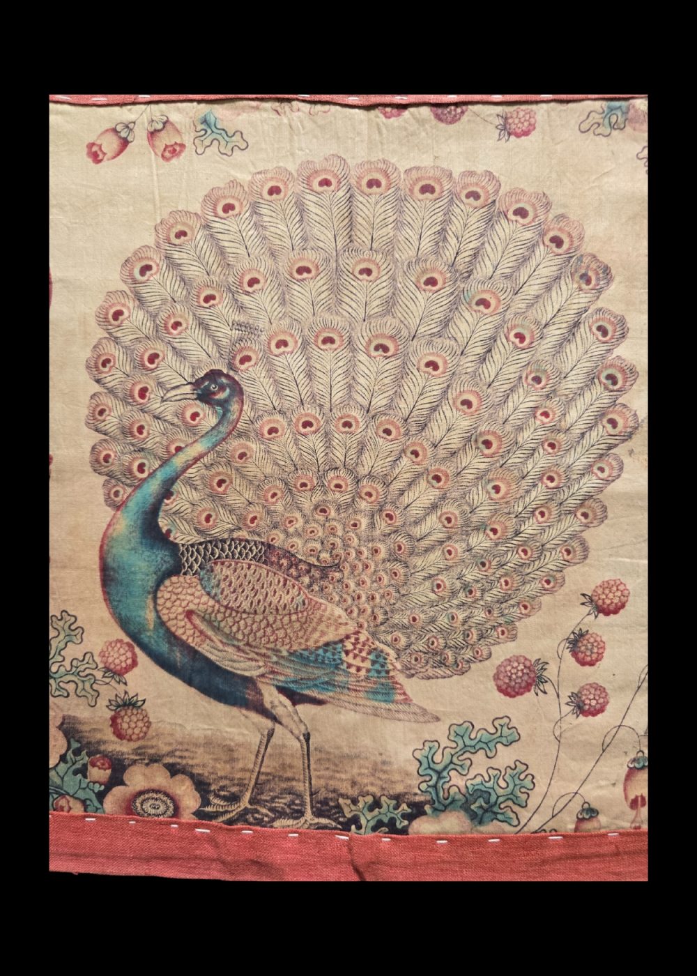 This exquisite roller print textile from Manchester features a striking composition of three peacocks, two perched gracefully on floral-adorned pedestals and one in the center with its magnificent plumage fully displayed. The fine detailing of the feathers, highlighted in shades of teal, emerald, and crimson, is complemented by an intricate background of stylized flowers and foliage. Bordered in a soft red frame, the textile reflects the elegance of 19th-century British textile design, where industrial printing techniques captured the richness of hand-painted motifs with precision and vibrancy.