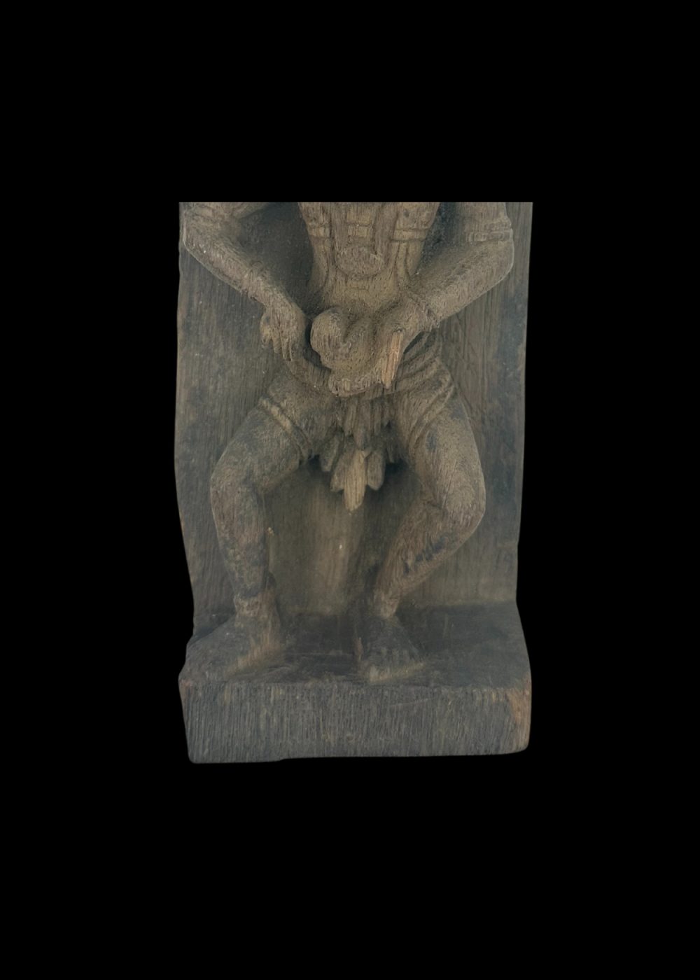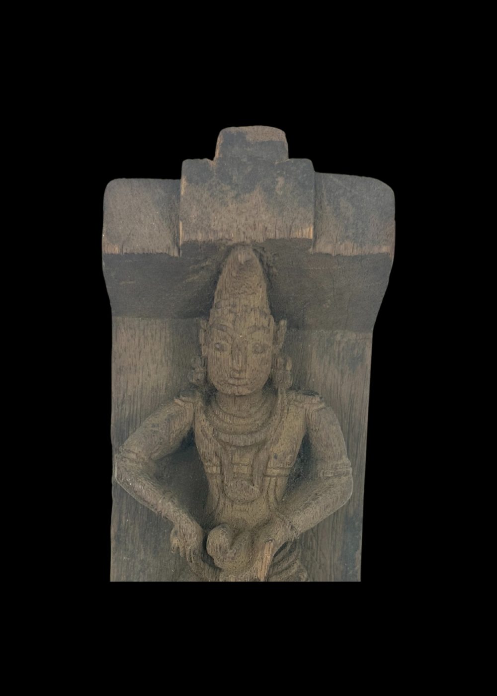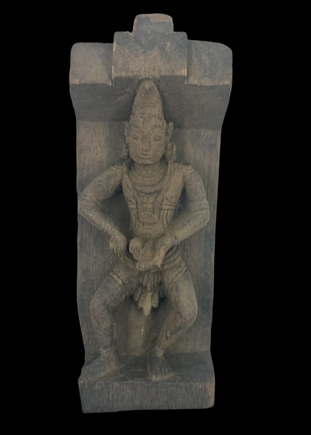 This wooden sculpture from Tamil Nadu, approximately 60–70 years old, represents a traditionally adorned figure seated in a poised, alert posture—possibly a guardian or divine attendant. Carved with intricate jewelry and garment detailing, the figure is framed within a niche-like structure, suggesting its origin from a temple or ceremonial setting. The piece reflects Tamil Nadu’s rich heritage of skilled woodcarving and religious artistry, preserving cultural values through enduring craftsmanship.
