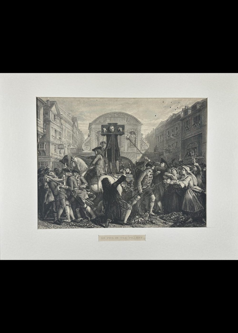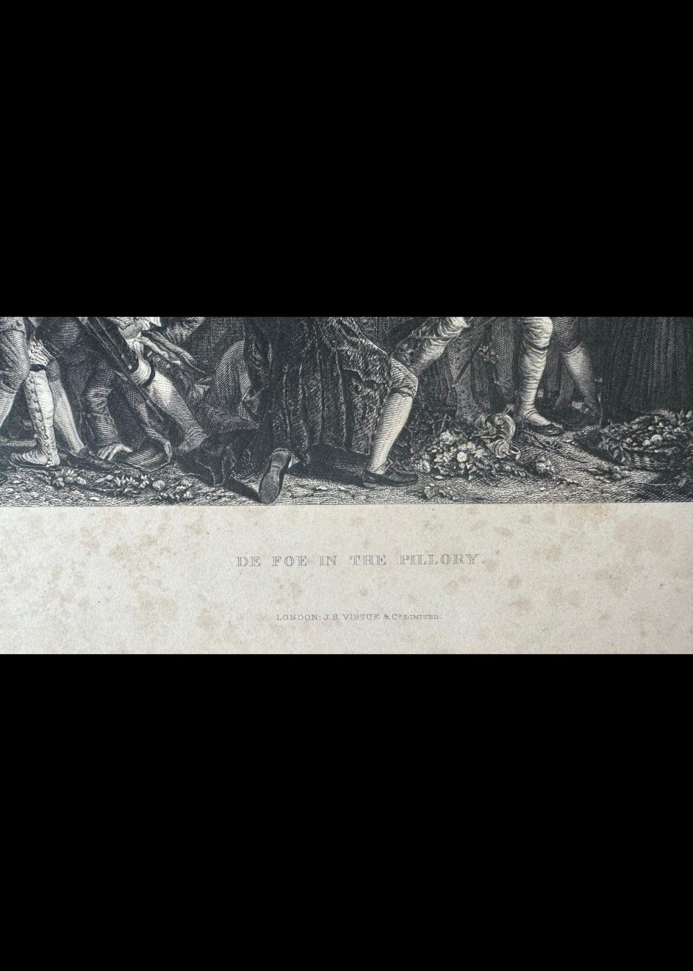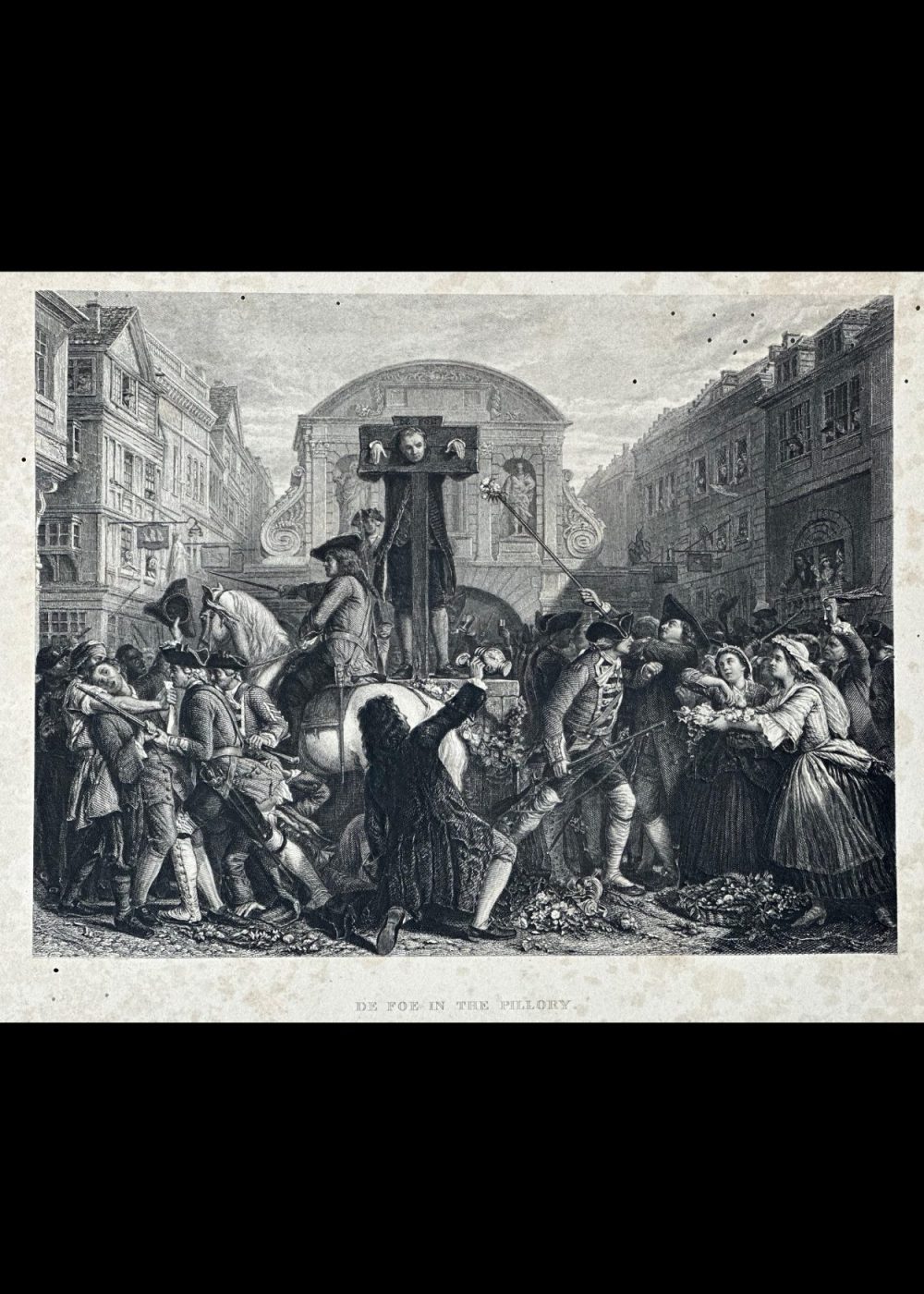 This dramatic engraving by John Carr Armytage, after a painting by Eyre Crowe, captures the historic and defiant moment when Daniel Defoe, the famed English writer and pamphleteer, stood in the pillory in 1703. Rather than being shamed, Defoe was met with surprising public admiration, a sentiment powerfully conveyed in this bustling street scene. At the center of the composition, Defoe stands elevated in the pillory, calm and dignified despite the wooden frame that binds his head and hands. Surrounding him is a vibrant crowd — not of jeering tormentors, but of sympathetic onlookers who shower him with flowers instead of abuse. The engraving brilliantly contrasts chaos and reverence, with dynamic figures gesturing, shouting, and pressing forward, creating a sense of tightly packed energy. The architecture of the surrounding buildings, complete with onlookers in windows and shop signs, adds authenticity and atmosphere, situating the event firmly in early 18th-century London. The theater in the background may symbolize the public spectacle of the pillory, which Defoe transcended through his eloquence and public support. This image is not only a portrait of a moment in Defoe’s life but also a statement on freedom of speech, resilience, and the power of public opinion. It speaks to the enduring influence of the author of Robinson Crusoe, who turned punishment into triumph.