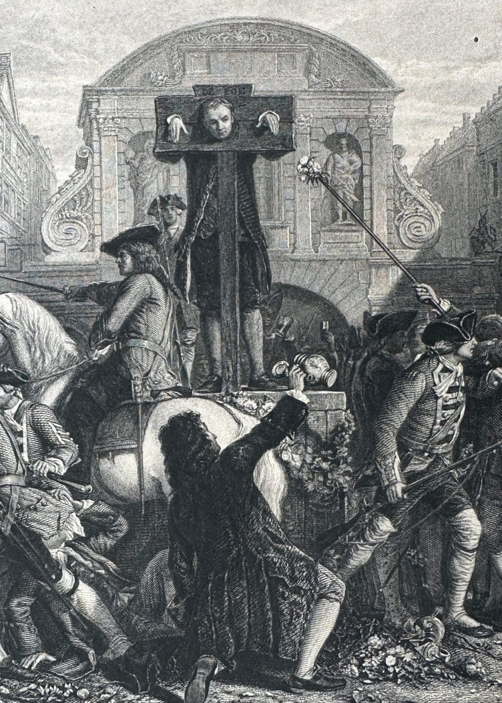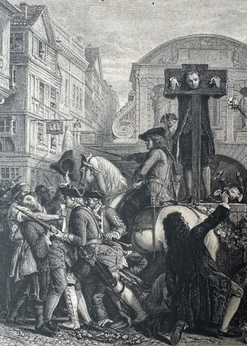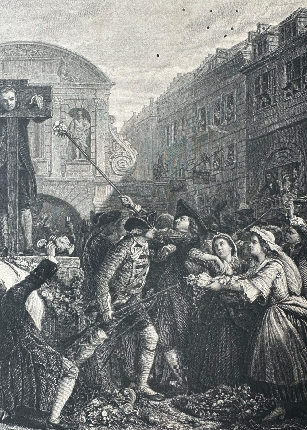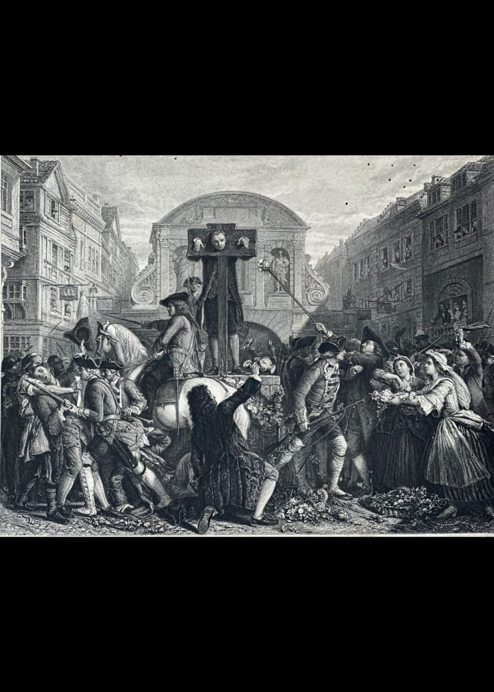 This dramatic engraving by John Carr Armytage, after a painting by Eyre Crowe, captures the historic and defiant moment when Daniel Defoe, the famed English writer and pamphleteer, stood in the pillory in 1703. Rather than being shamed, Defoe was met with surprising public admiration, a sentiment powerfully conveyed in this bustling street scene. At the center of the composition, Defoe stands elevated in the pillory, calm and dignified despite the wooden frame that binds his head and hands. Surrounding him is a vibrant crowd — not of jeering tormentors, but of sympathetic onlookers who shower him with flowers instead of abuse. The engraving brilliantly contrasts chaos and reverence, with dynamic figures gesturing, shouting, and pressing forward, creating a sense of tightly packed energy. The architecture of the surrounding buildings, complete with onlookers in windows and shop signs, adds authenticity and atmosphere, situating the event firmly in early 18th-century London. The theater in the background may symbolize the public spectacle of the pillory, which Defoe transcended through his eloquence and public support. This image is not only a portrait of a moment in Defoe’s life but also a statement on freedom of speech, resilience, and the power of public opinion. It speaks to the enduring influence of the author of Robinson Crusoe, who turned punishment into triumph.