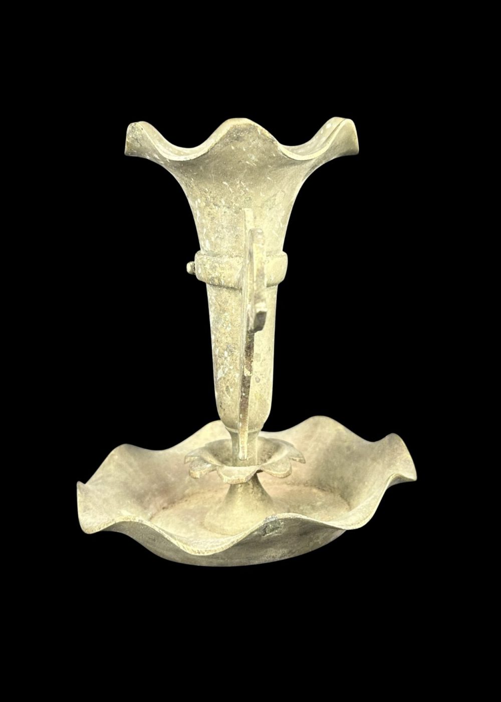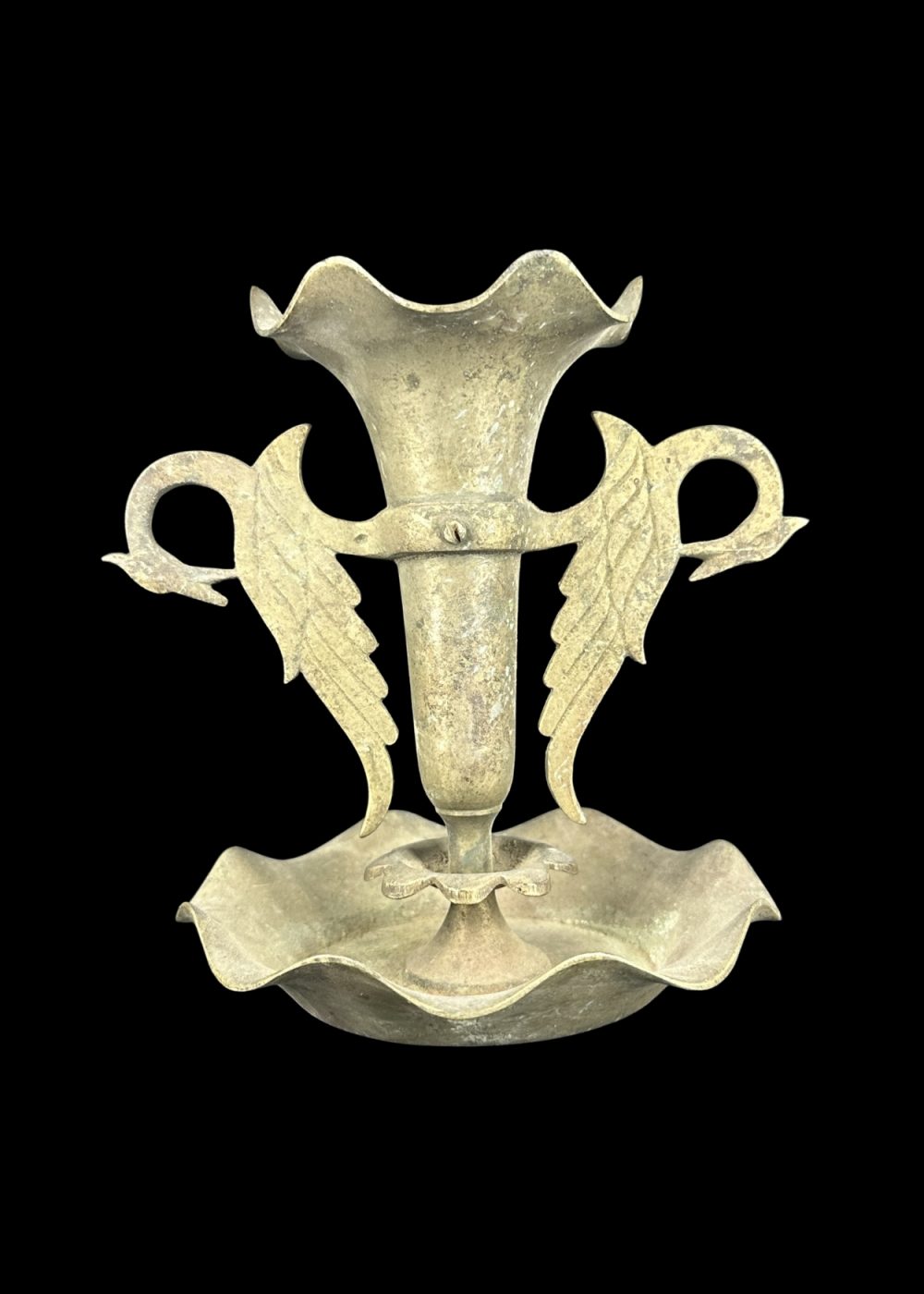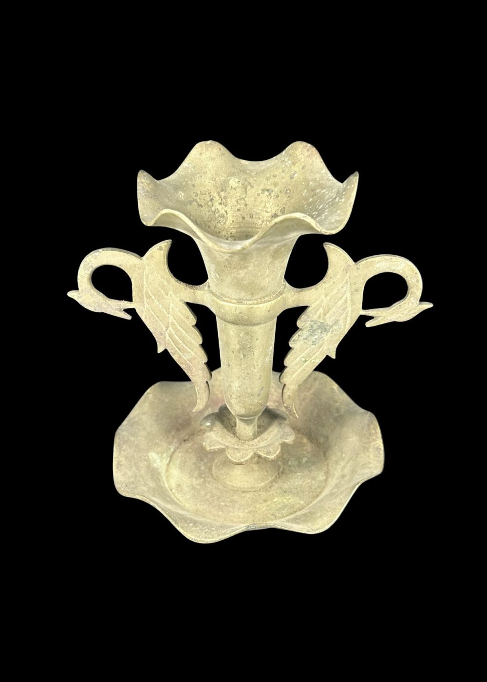 This ornamental garman silver vase features a flared, petal-like mouth and is elegantly adorned with twin swan-shaped handles, their wings curving downward in a stylized fashion. The vase stands in a broad, rippled basin-like base, possibly intended to catch water or offer stability. Rich in symbolic detail and graceful in form, this piece exemplifies traditional Indian metal artistry, blending beauty with functionality.
