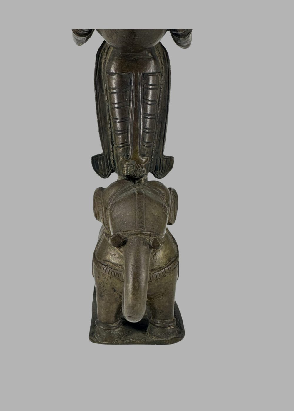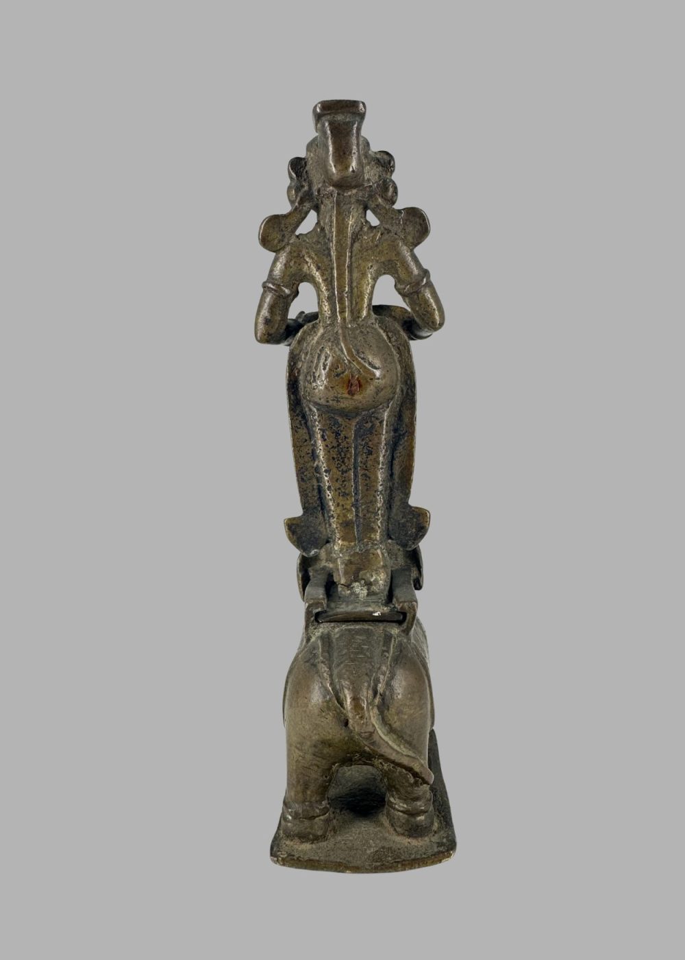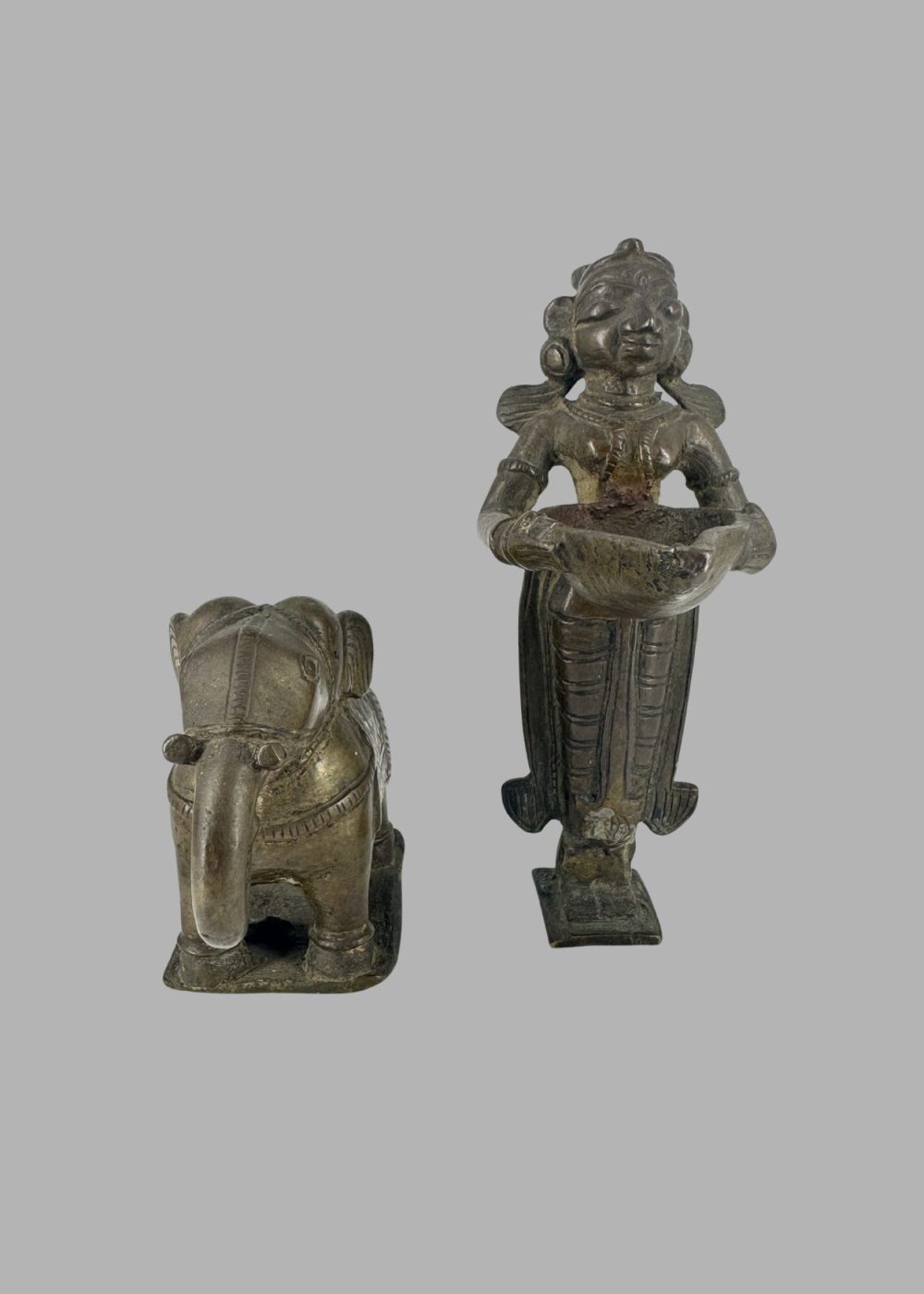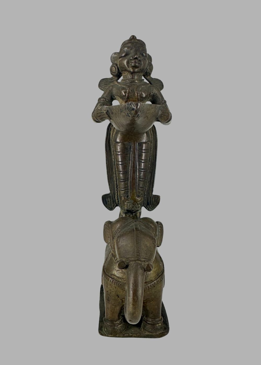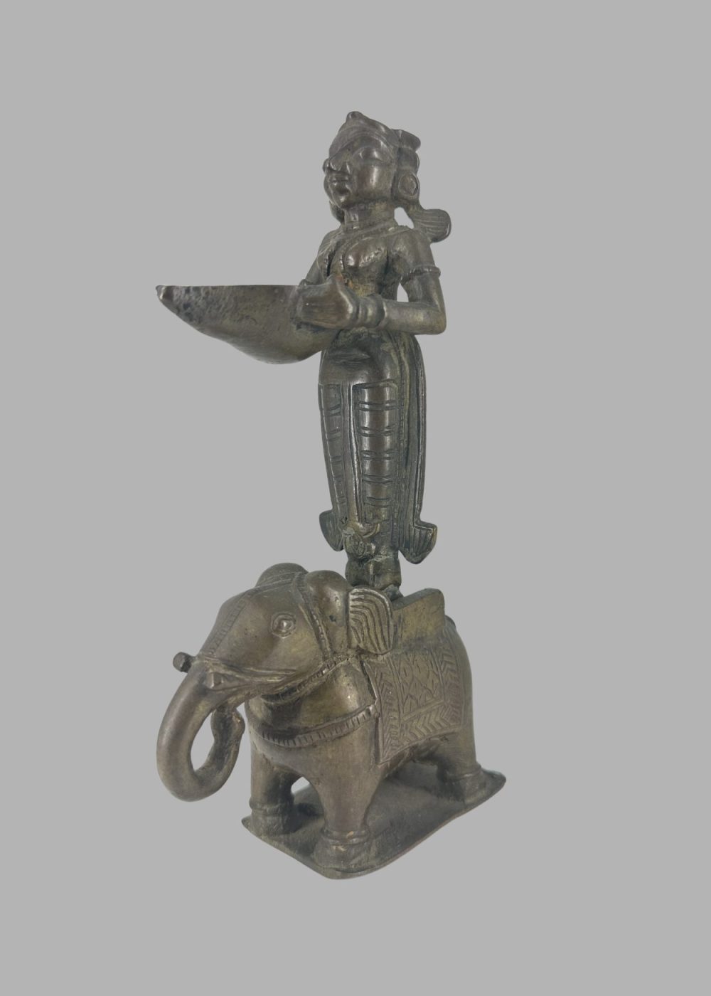This unique bronze artifact from Gujarat features Deepalakshmi, the goddess of light, standing atop a stylized elephant. Holding a lamp in her hands, she symbolizes prosperity and illumination. The combination of human and animal forms reflects the vibrant imagination and fine craftsmanship of Gujarati artisans, making this piece a remarkable representation of the region’s rich cultural and devotional art.