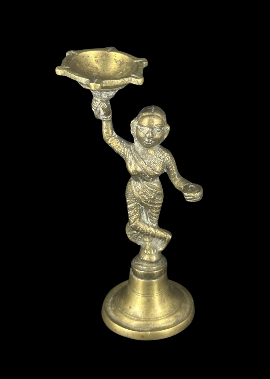 This unique bronze artifact from Gujarat features Deepalakshmi, the goddess of light, standing atop a stylized elephant. Holding a lamp in her hands, she symbolizes prosperity and illumination. The combination of human and animal forms reflects the vibrant imagination and fine craftsmanship of Gujarati artisans, making this piece a remarkable representation of the region’s rich cultural and devotional art.