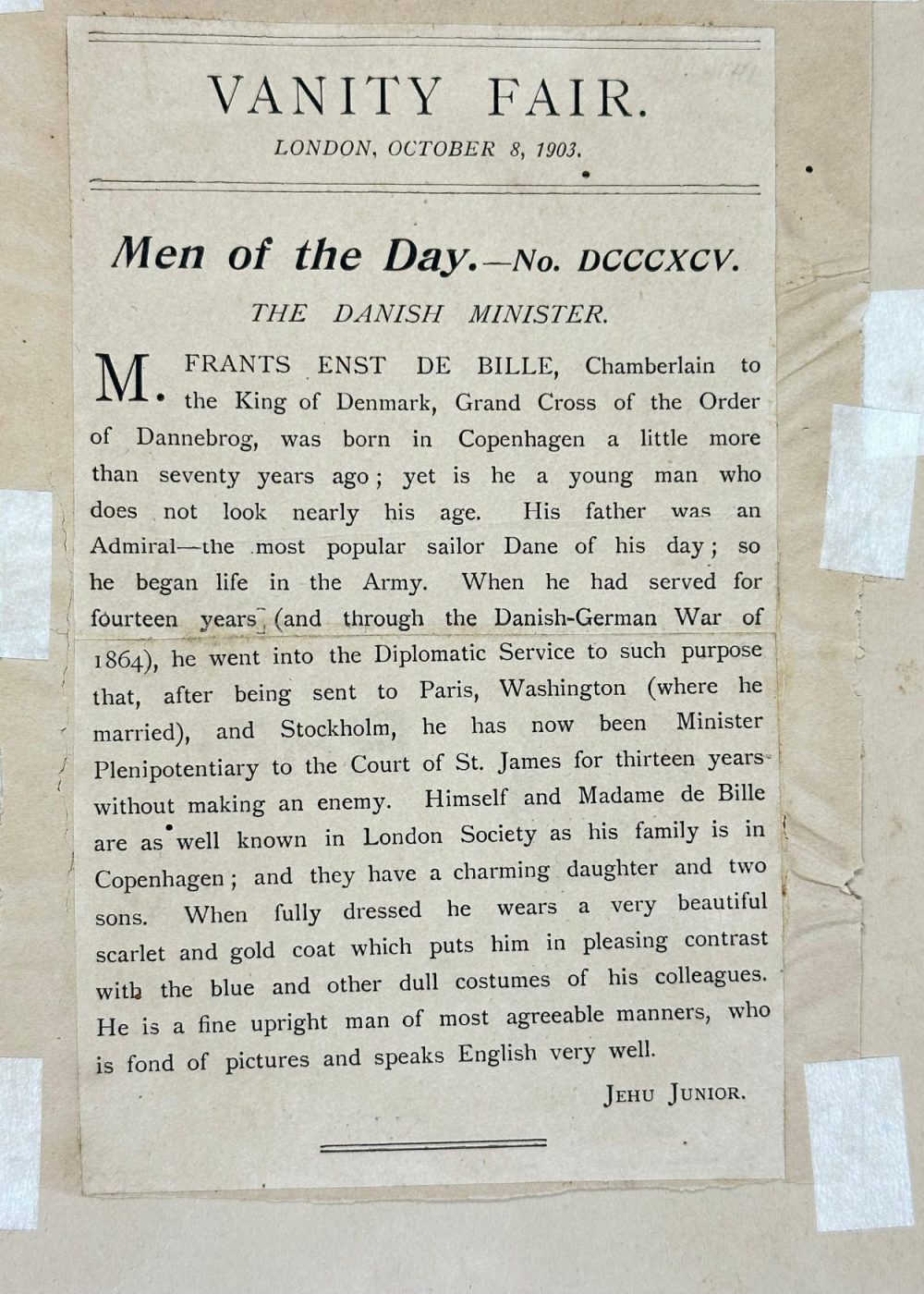FRANTS ENST DE BILLE, Chamberlain to the King of Denmark, Grand Cross of the Order of Dannebrog, was born in Copenhagen a little more than seventy years ago; yet is he a young man who does not look nearly his age. His father was an Admiral-the most popular sailor Dane of his day; so he began life in the Army. When he had served for fourteen years (and through the Danish-German War of 1864), he went into the Diplomatic Service to such purpose that, after being sent to Paris, Washington (where he been Minister married), and Stockholm, he has now Plenipotentiary to the Court of St. James for thirteen years without making an enemy. Himself and Madame de Bille are as well known in London Society as his family is in Copenhagen; and they have a charming daughter and two sons. When fully dressed he a very beautiful scarlet and gold coat which puts him in pleasing contrast with the blue and other dull costumes of his colleagues. He is a fine upright man of most agreeable manners, who is fond of pictures and speaks English very well.