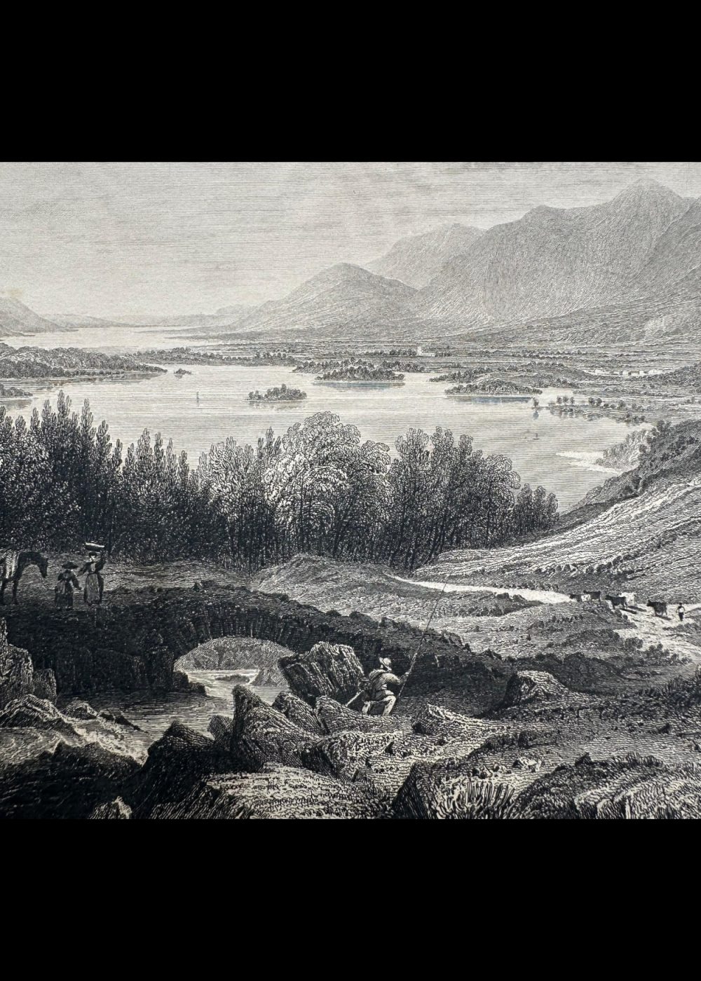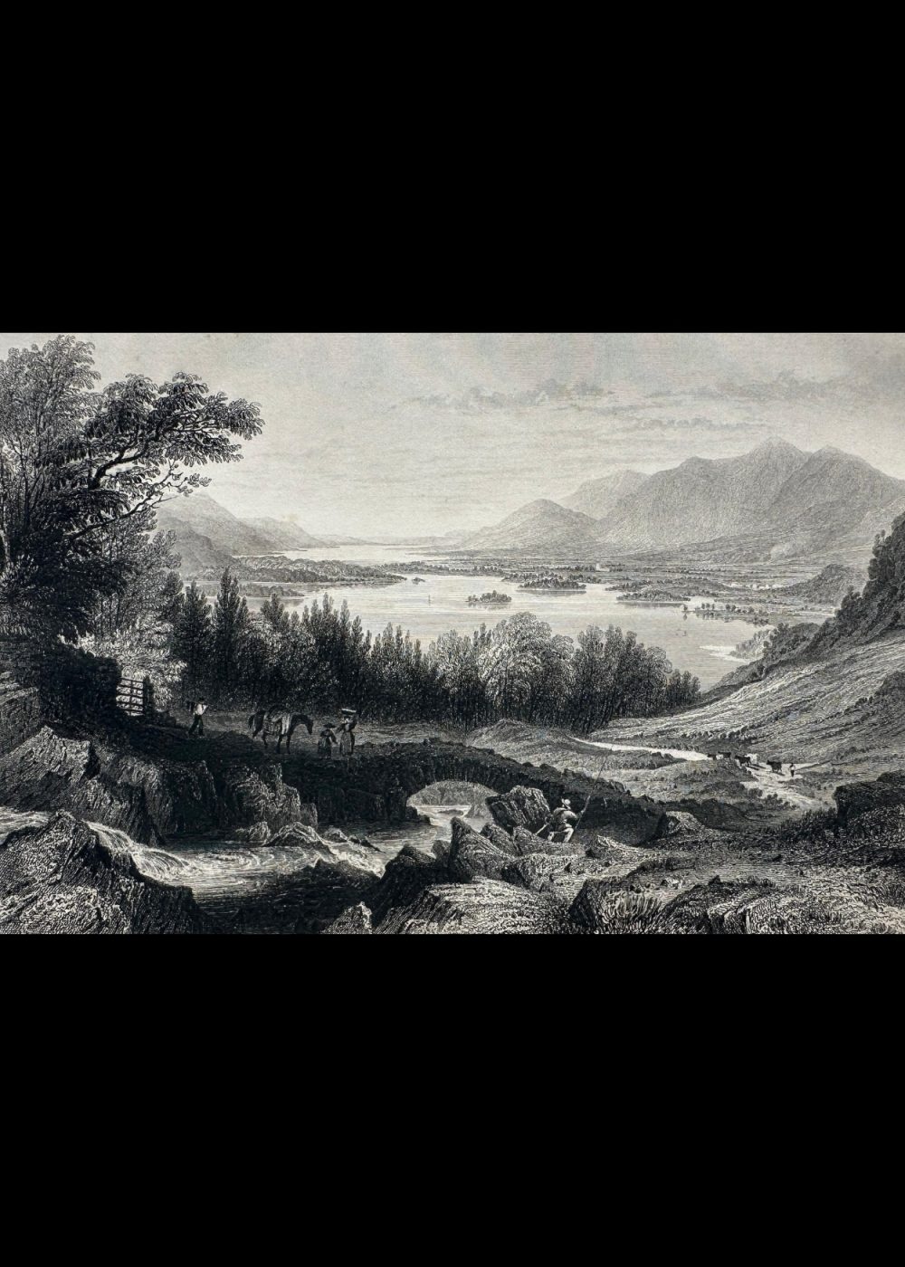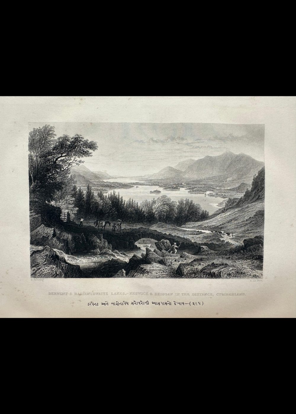 This engraving, featured in The Crystal Palace book, beautifully depicts the serene landscape of Derwent and Bassenthwaite Lakes with Keswick and Skiddaw in the distance, located in Cumberland, England. The scene captures the harmony between nature and rural life—lush trees and calm waters framed by distant mountains, while travelers and animals occupy the foreground. The intricate detailing and fine shading convey both depth and tranquility, reflecting the 19th-century artistic fascination with the picturesque beauty of the English countryside.