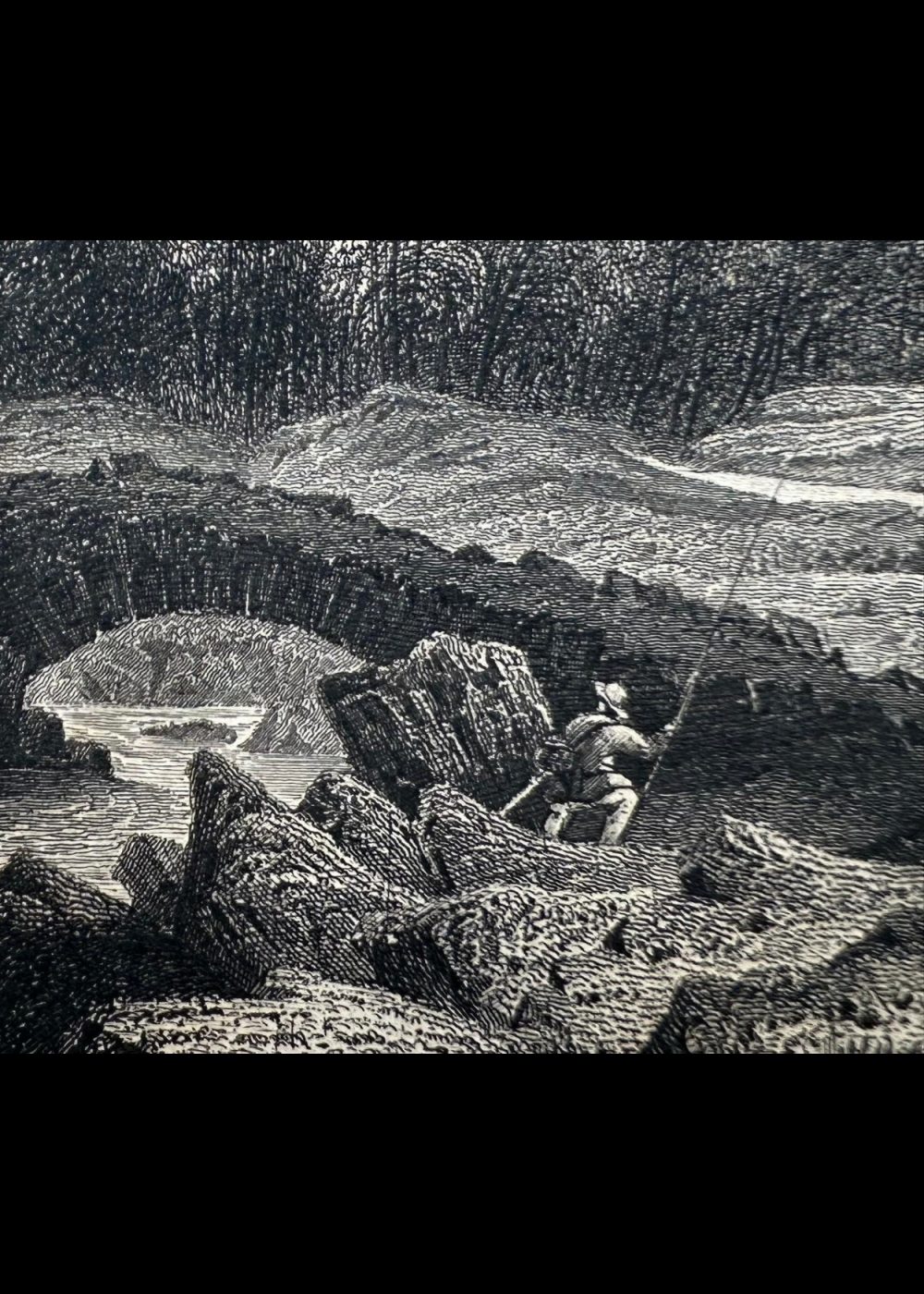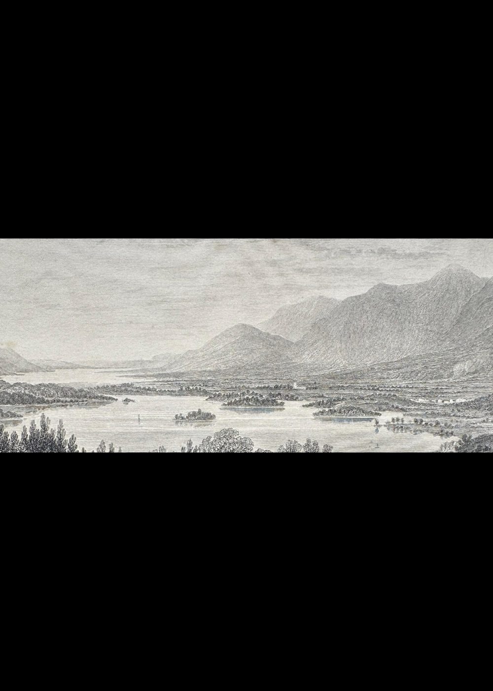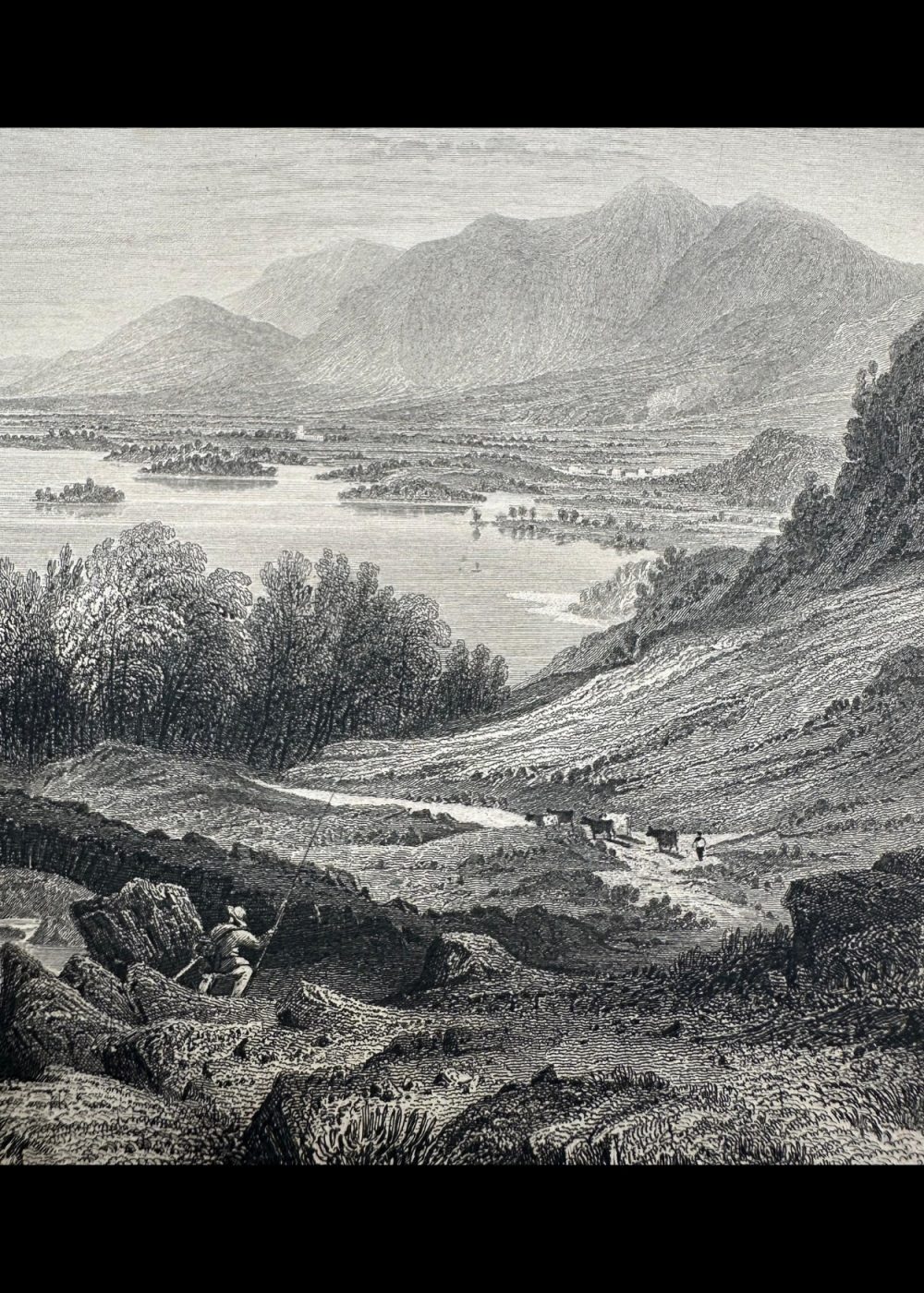 This engraving, featured in The Crystal Palace book, beautifully depicts the serene landscape of Derwent and Bassenthwaite Lakes with Keswick and Skiddaw in the distance, located in Cumberland, England. The scene captures the harmony between nature and rural life—lush trees and calm waters framed by distant mountains, while travelers and animals occupy the foreground. The intricate detailing and fine shading convey both depth and tranquility, reflecting the 19th-century artistic fascination with the picturesque beauty of the English countryside.