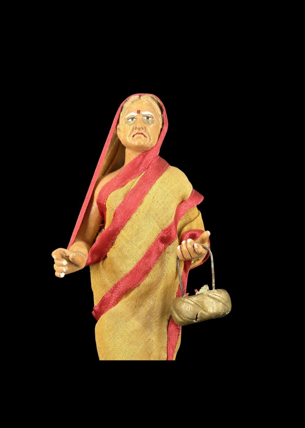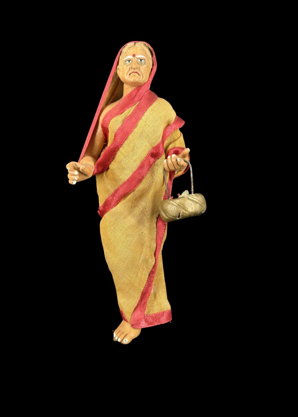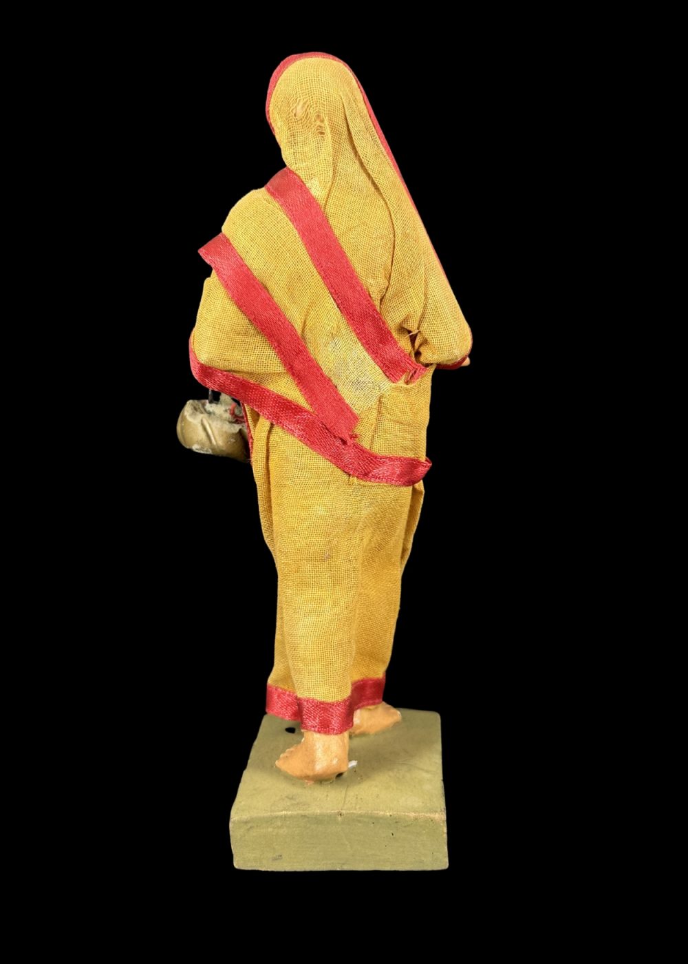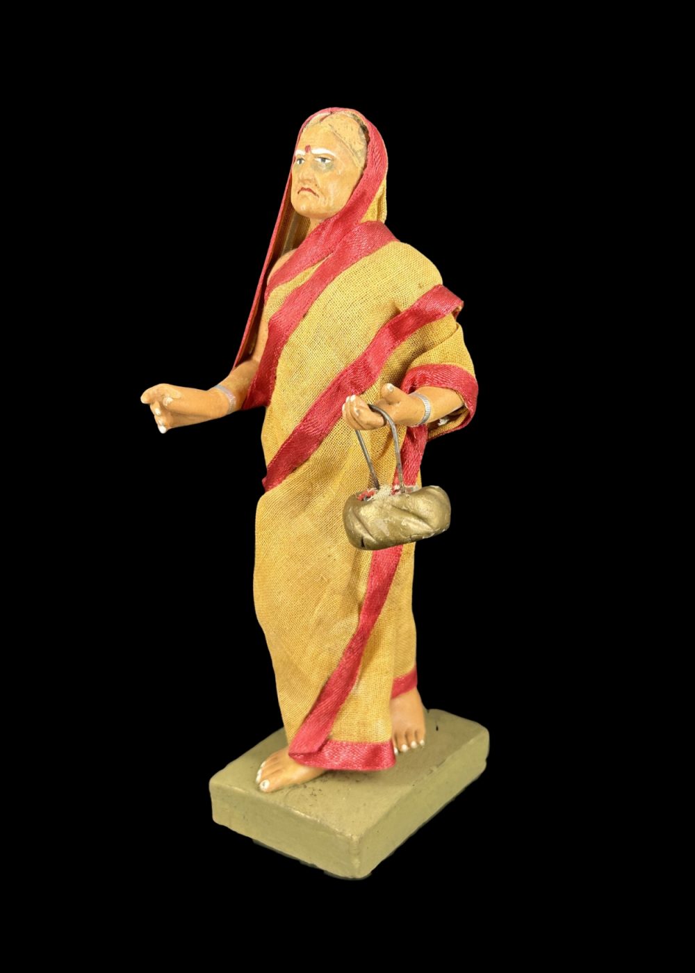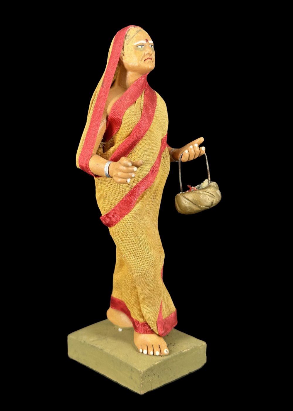 This figurine depicts a traditionally dressed woman in a yellow sari with red borders, holding a pair of kartals (hand cymbals), symbolizing her participation in devotional singing or bhajan. Her poised expression and raised hand reflect active engagement in a religious procession or communal worship. Representing female devotion in the Bhakti tradition, the figure honors the role of women in preserving and performing spiritual practices through music and prayer.