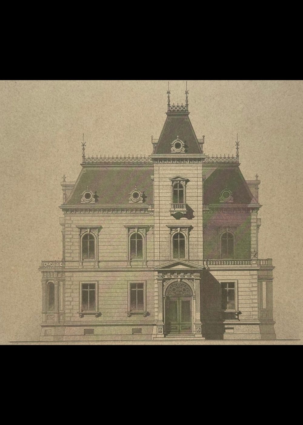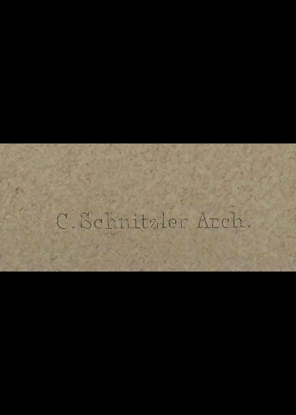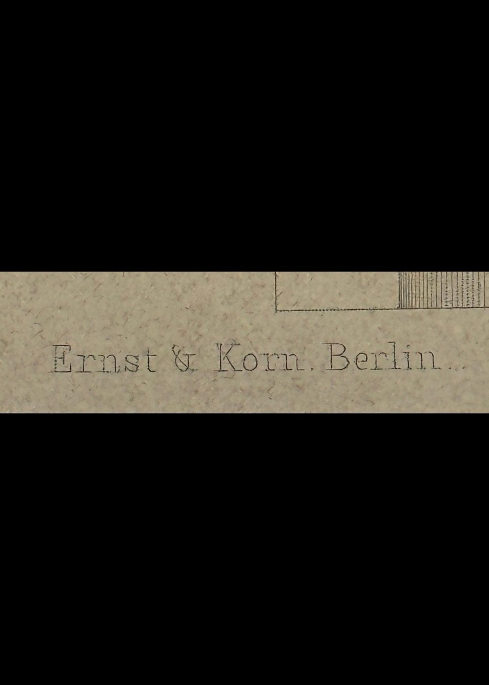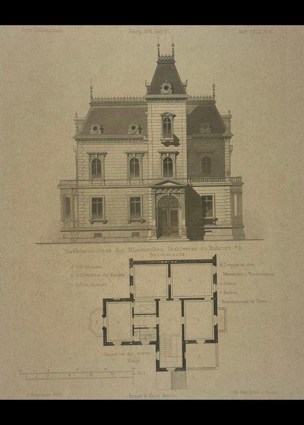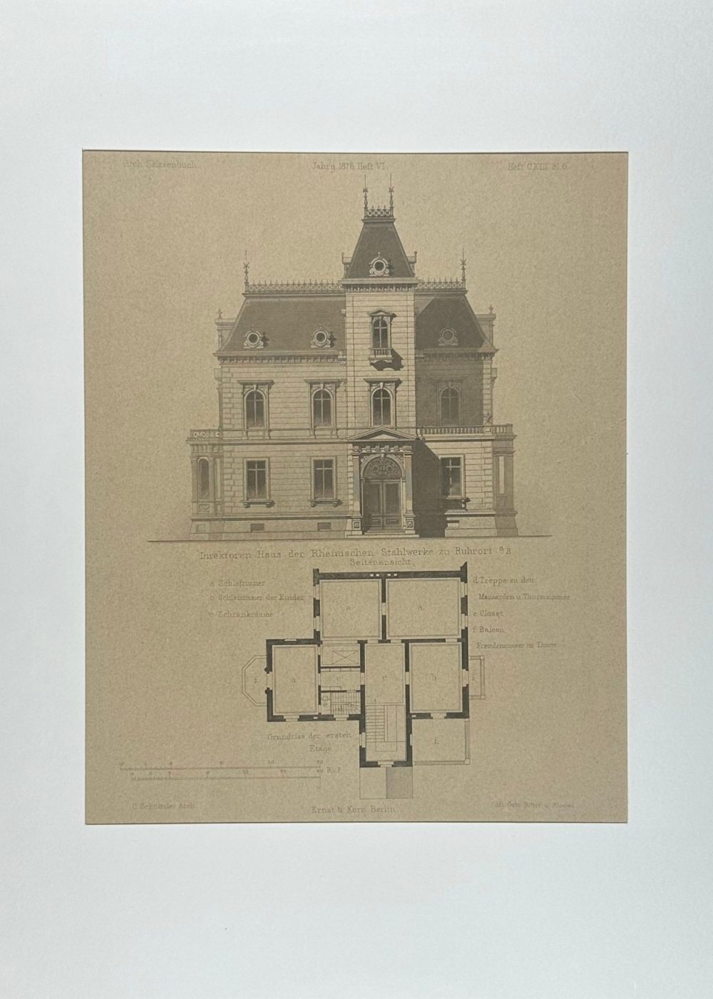 This 1876 architectural lithograph presents the side elevation and first-floor plan of the Director’s House of the Rhenish Steelworks in Ruhrort, Germany. The grand facade reflects the ornate style of late 19th-century industrial elite residences, featuring decorative gables, dormers, and a central tower. Below, the floor plan details the internal layout with labeled rooms such as bedrooms, children’s rooms, a balcony, and staircases. Created by architect C. Schneider and published by Ernst & Korn, Berlin, this drawing exemplifies the blend of elegance and practicality in industrial-era domestic architecture.