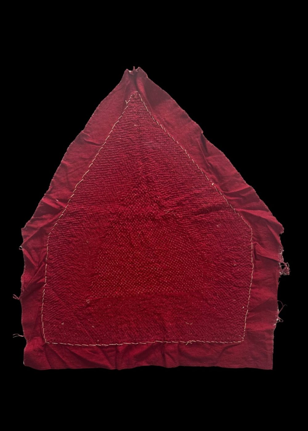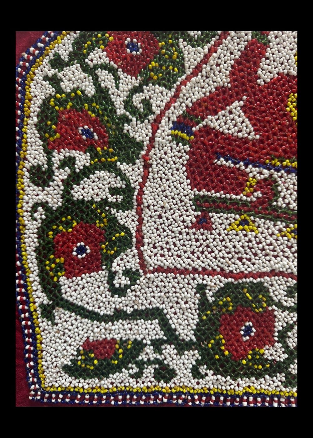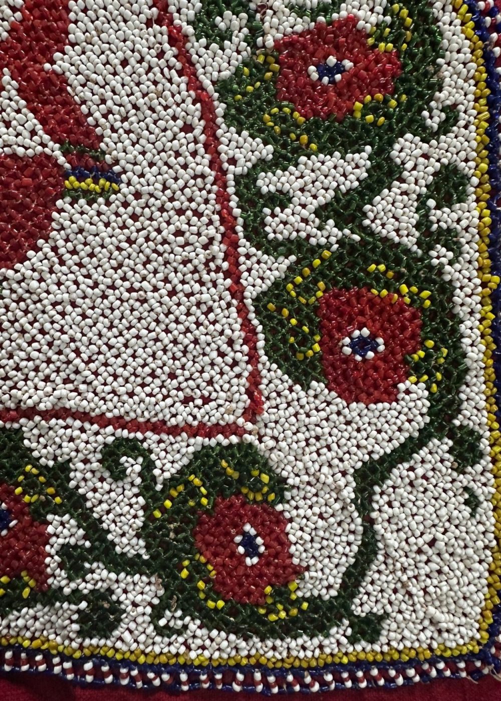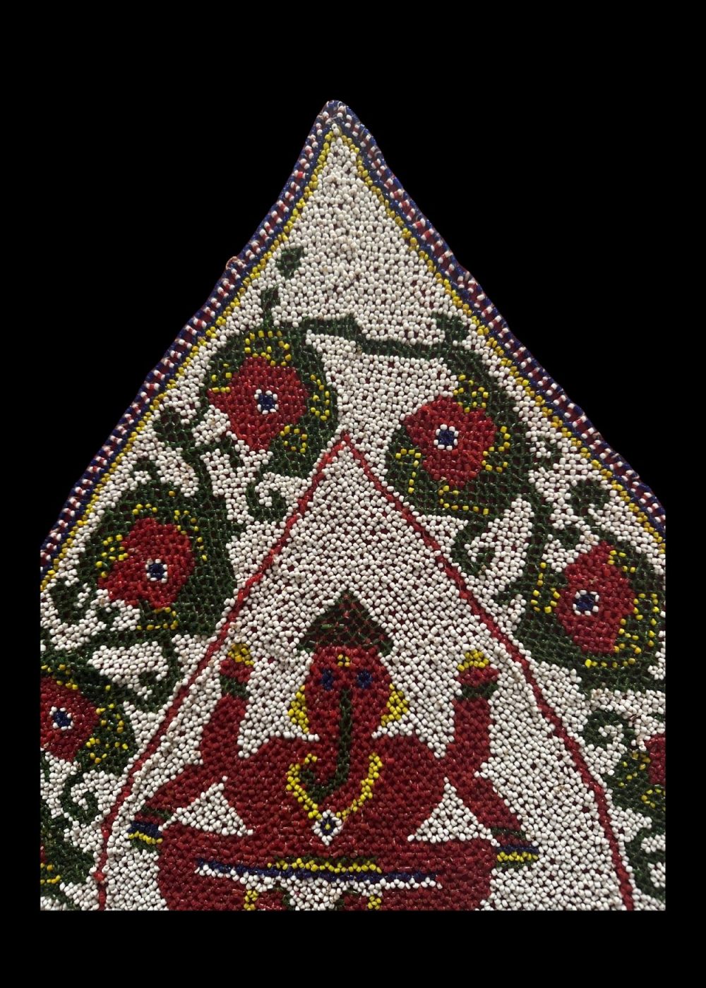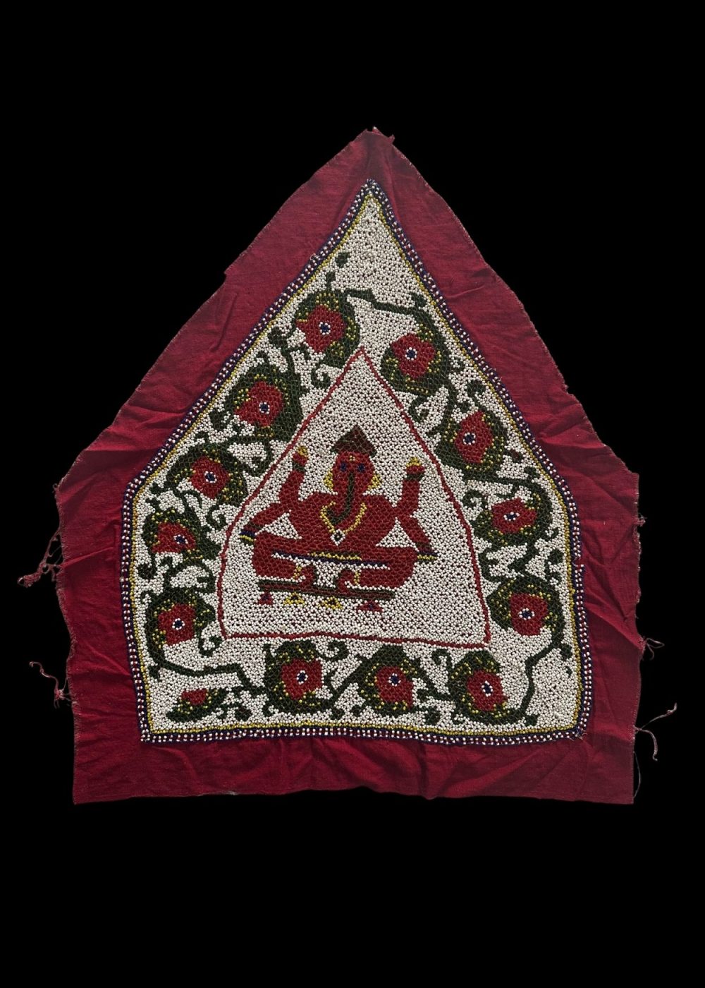 This is a handcrafted beaded artwork on a deep red fabric, depicting Lord Ganesha, a revered deity in Indian culture, known as the remover of obstacles and symbol of prosperity. The central figure of Ganesha is created with red, yellow, and white beads, enclosed within a triangular frame. Surrounding the deity is an ornate floral border with red flowers and green vines, all intricately beaded on a white background. The border is finished with multicolored beadwork, adding a decorative frame to the piece.