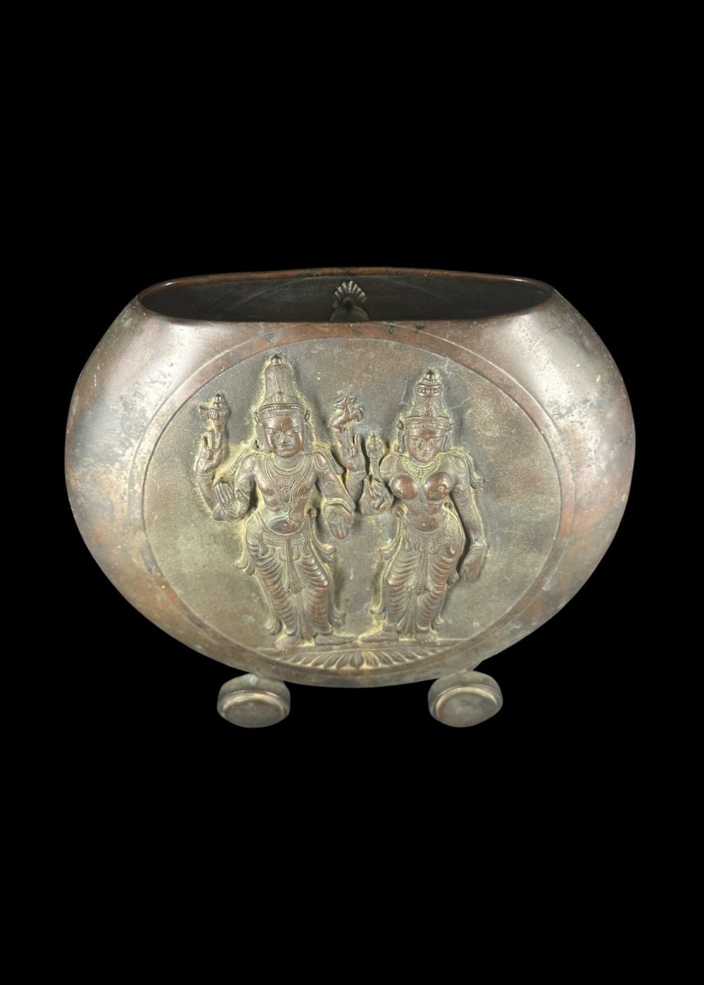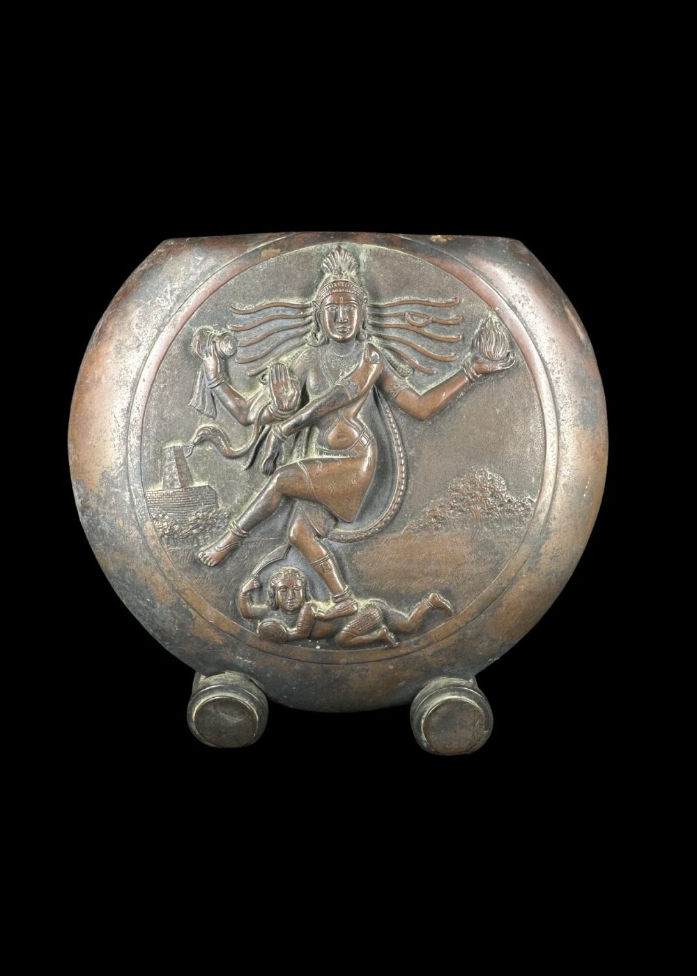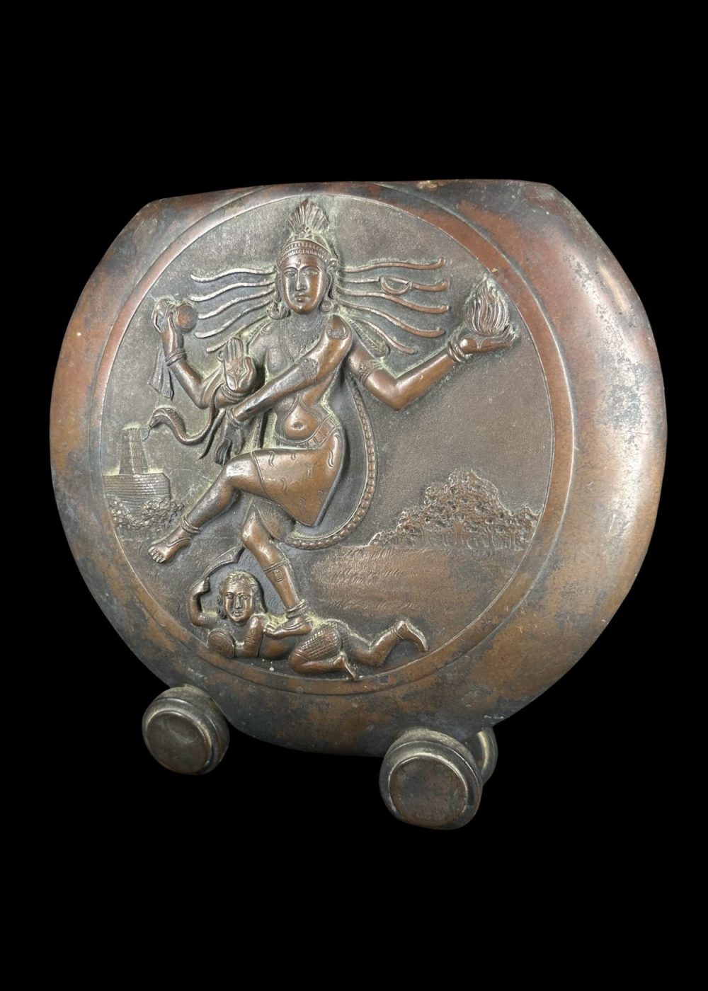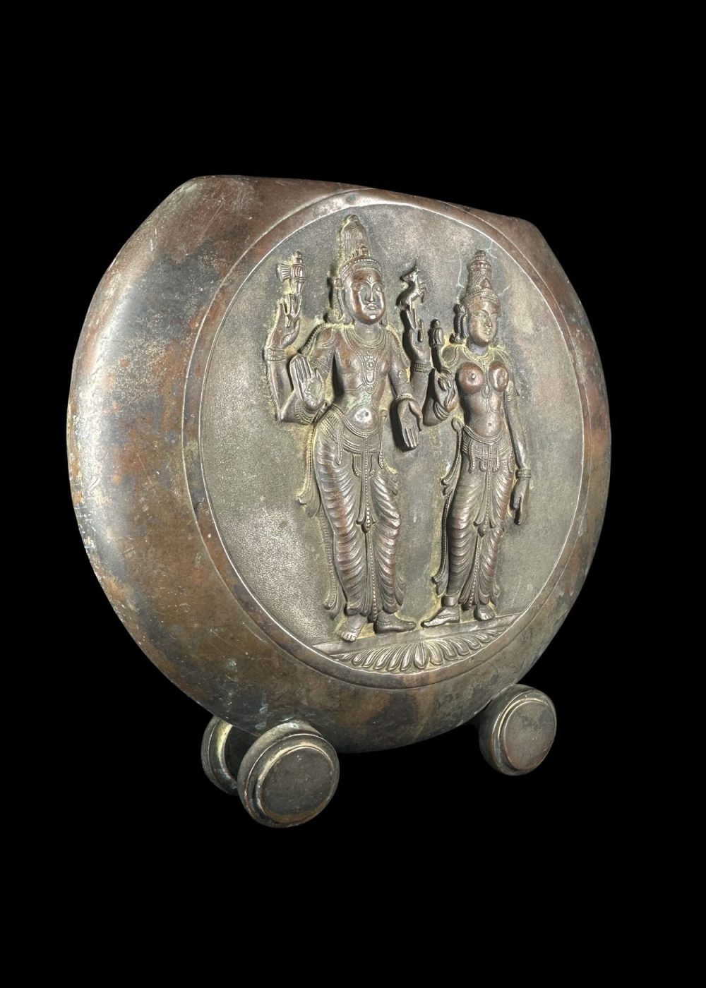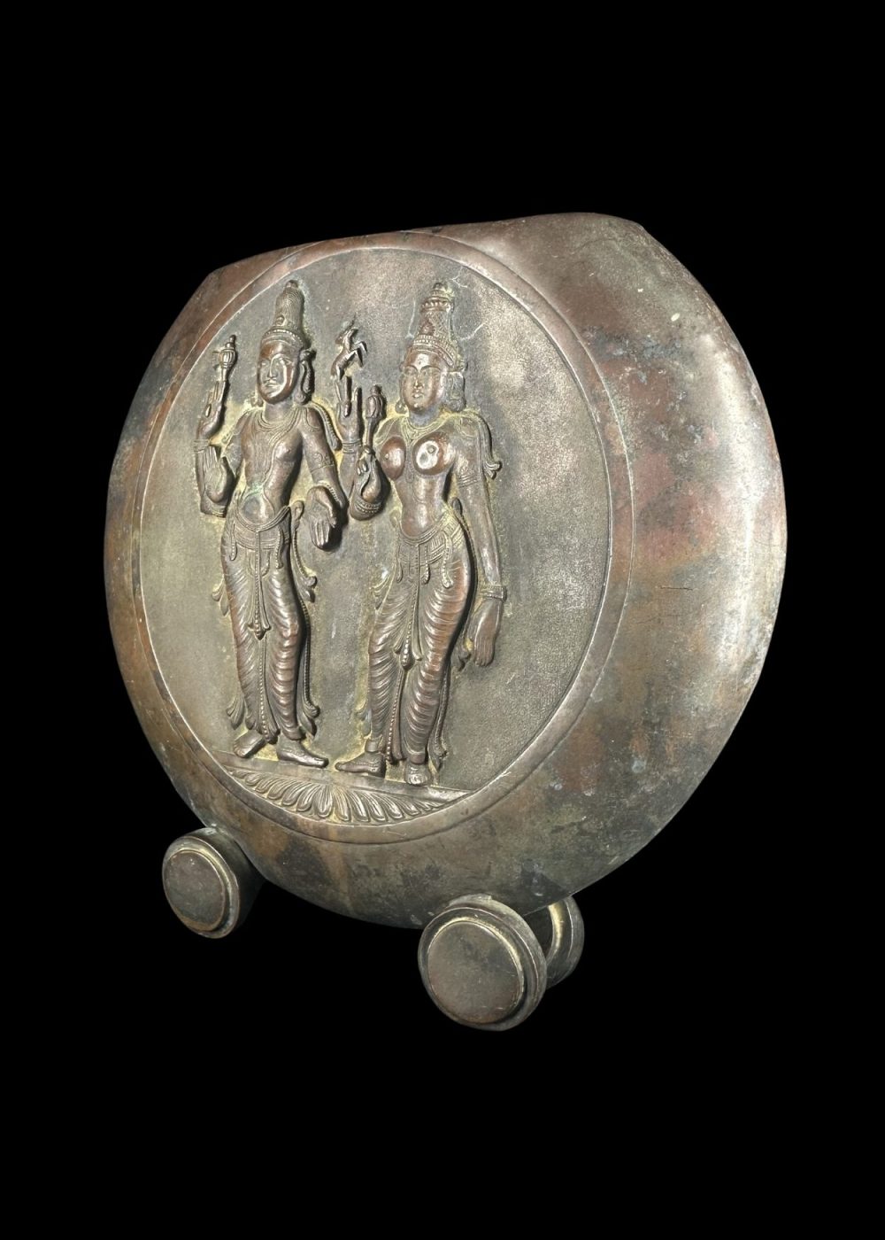 This circular relief features dual representations of Shiva in distinct divine forms. On one side, Shiva stands beside Parvati, symbolizing conjugal harmony and divine union. Adorned with elaborate crowns and jewelry, the figures share balanced postures and reciprocal gestures beneath stylized arches. The reverse presents Shiva as Nataraja, the cosmic dancer, encircled by a prabhavali. With dynamic posture and rhythmic movement, he embodies the eternal cycle of creation and dissolution. Executed in high-relief bronze, the panel exemplifies devotional artistry and the duality of spiritual roles within Shaiva tradition.