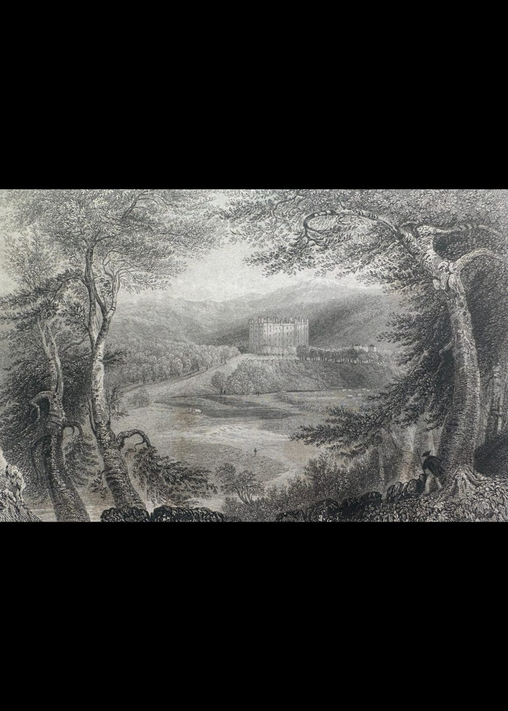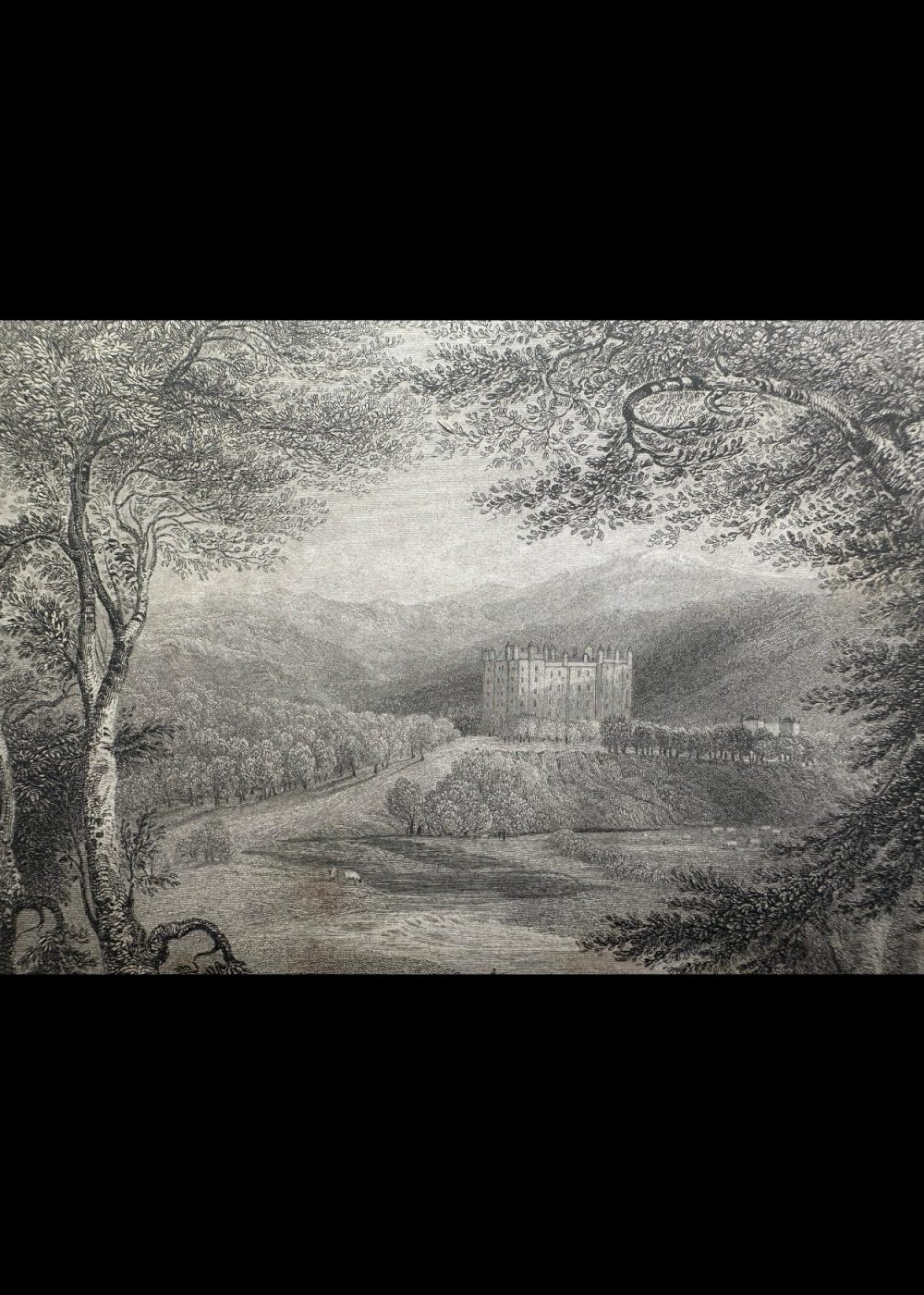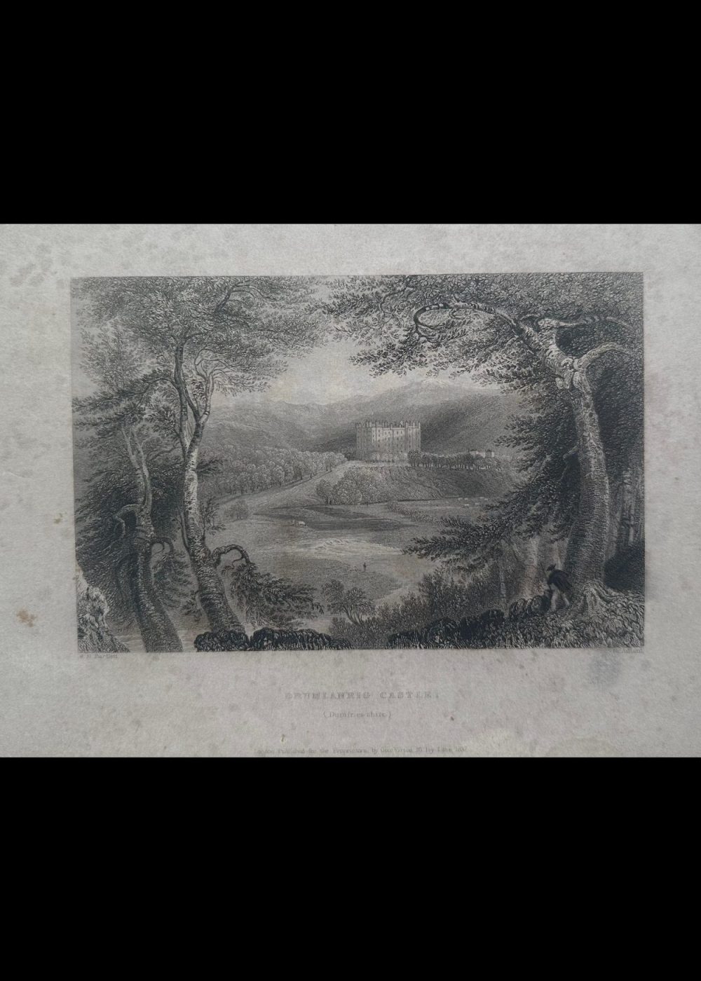 This exquisite 19th-century engraving presents Drumlanrig Castle in all its stately glory, nestled amid the rolling landscapes of Dumfriesshire, Scotland. The castle’s grand façade rises with symmetrical elegance—its towers and battlements embodying centuries of aristocratic architecture and history. In the foreground, immense trees with finely etched foliage frame the scene, giving depth and contrast to the open fields and gentle hills surrounding the castle. The eye is led naturally to the estate’s impressive silhouette, which blends harmoniously with the natural setting—an embodiment of romanticism in stone. Published in London in 1837 for the proprietors by George Virtue of 26 Ivy Lane, this artwork isn’t just visually captivating—it’s a historical window into the grandeur of Scottish nobility