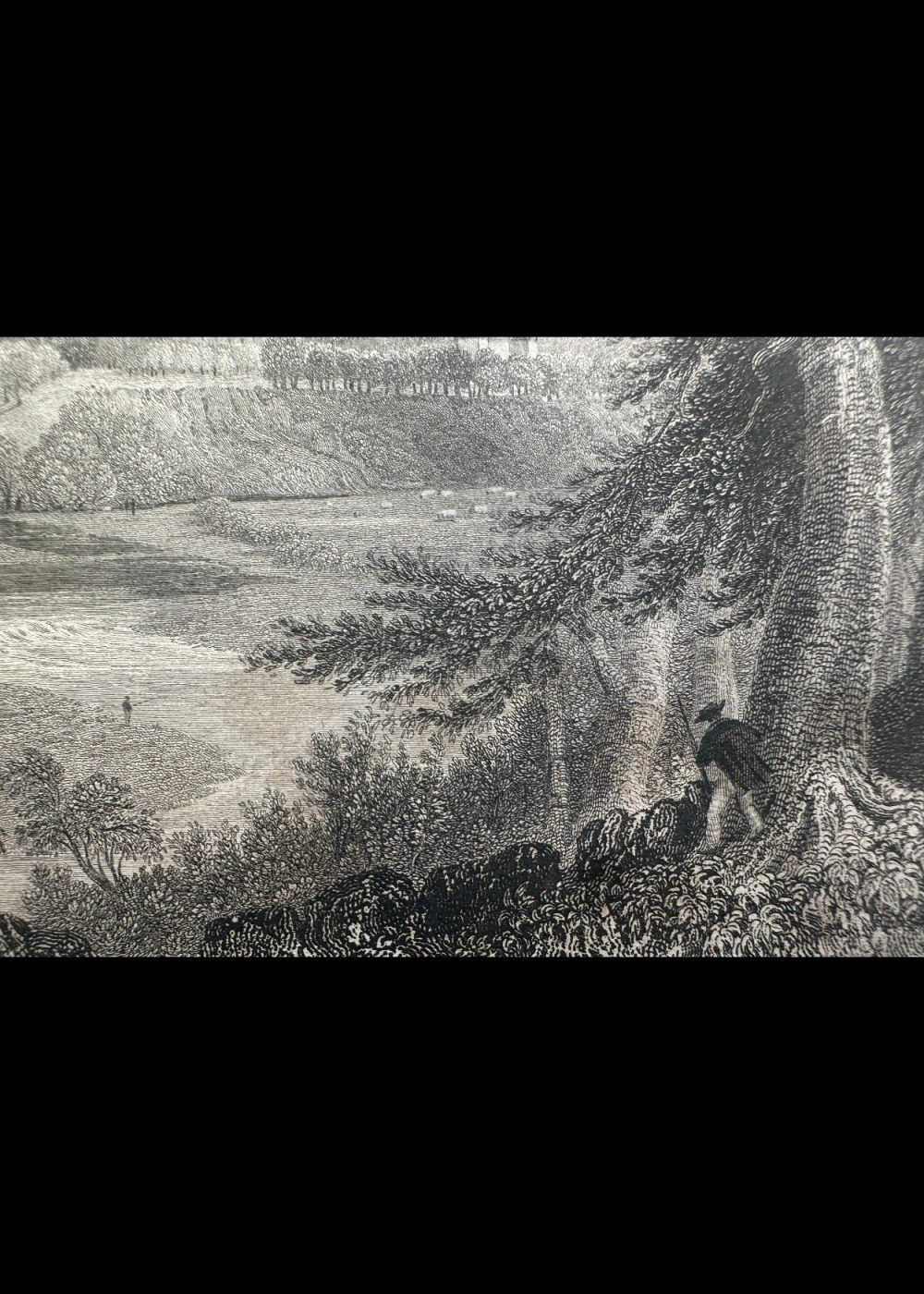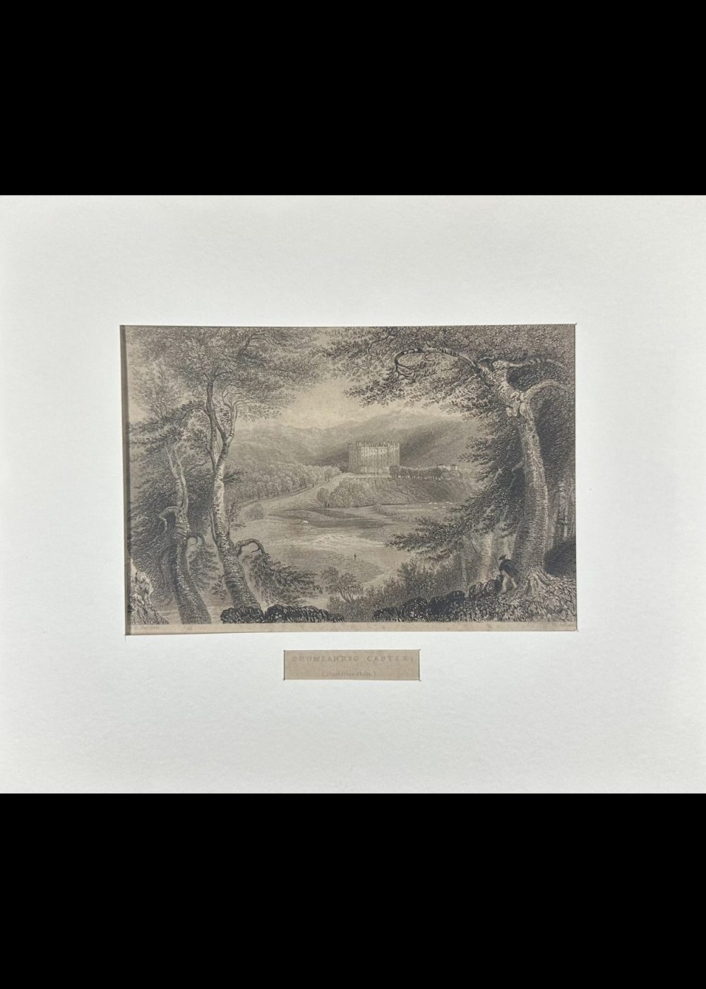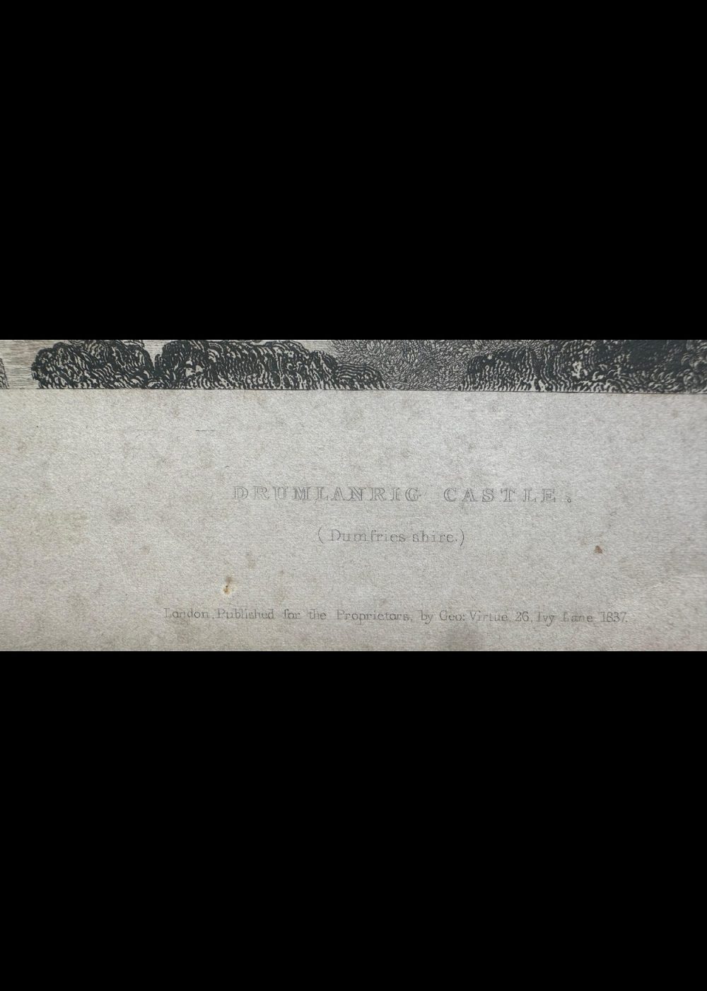 This exquisite 19th-century engraving presents Drumlanrig Castle in all its stately glory, nestled amid the rolling landscapes of Dumfriesshire, Scotland. The castle’s grand façade rises with symmetrical elegance—its towers and battlements embodying centuries of aristocratic architecture and history. In the foreground, immense trees with finely etched foliage frame the scene, giving depth and contrast to the open fields and gentle hills surrounding the castle. The eye is led naturally to the estate’s impressive silhouette, which blends harmoniously with the natural setting—an embodiment of romanticism in stone. Published in London in 1837 for the proprietors by George Virtue of 26 Ivy Lane, this artwork isn’t just visually captivating—it’s a historical window into the grandeur of Scottish nobility