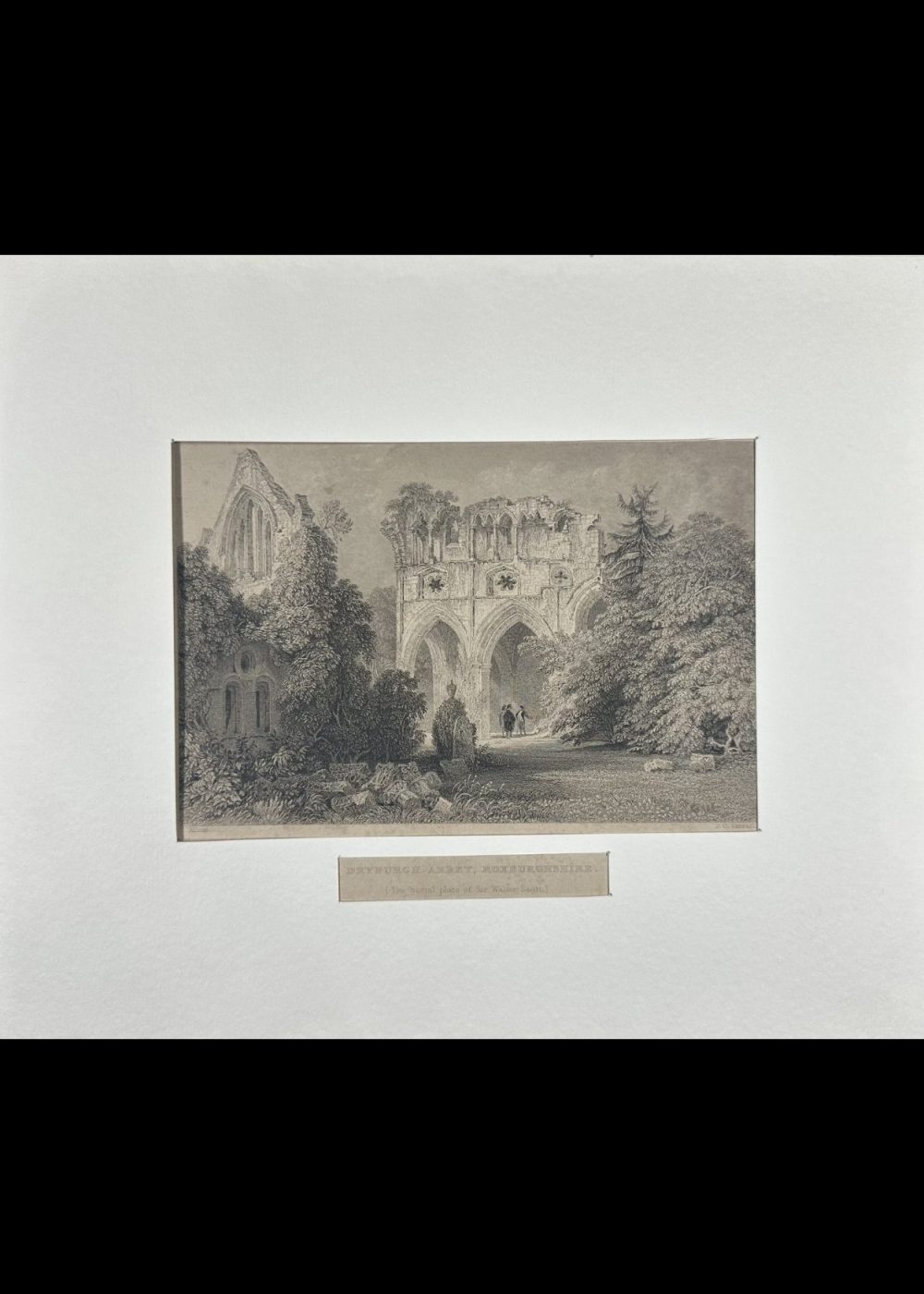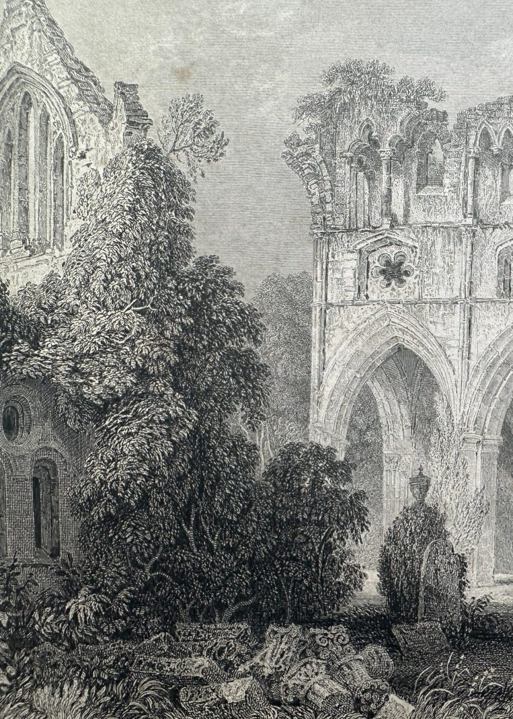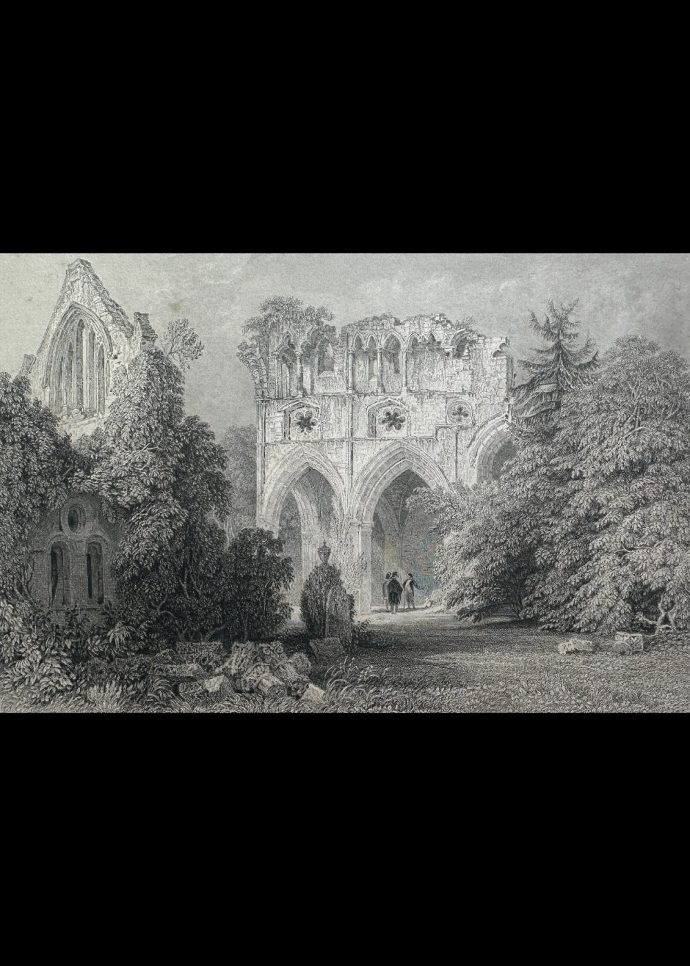 This evocative engraving depicts the ruins of Dryburgh Abbey, located in Roxburghshire, Scotland, and famously known as the burial place of Sir Walter Scott. The view captures the haunting beauty of the Gothic abbey, partially reclaimed by nature and framed by lush, overgrown trees and ivy. The central structure is a tall, arched ruin—its once-soaring windows and elegant stonework now broken and weathered, yet still conveying the architectural grace of medieval monastic design. Delicate rose windows and carved details hint at the abbey’s former grandeur. In the background, several small human figures stroll beneath the archway, lending a sense of scale and human presence to the timeless scene. To the left, thick vegetation clings to the crumbling walls, creating a romantic interplay between the natural world and the decaying monument. The composition is serene yet melancholic, evoking themes of loss, memory, and the passage of time—fitting for a site that holds the remains of one of Scotland’s most beloved literary figures.