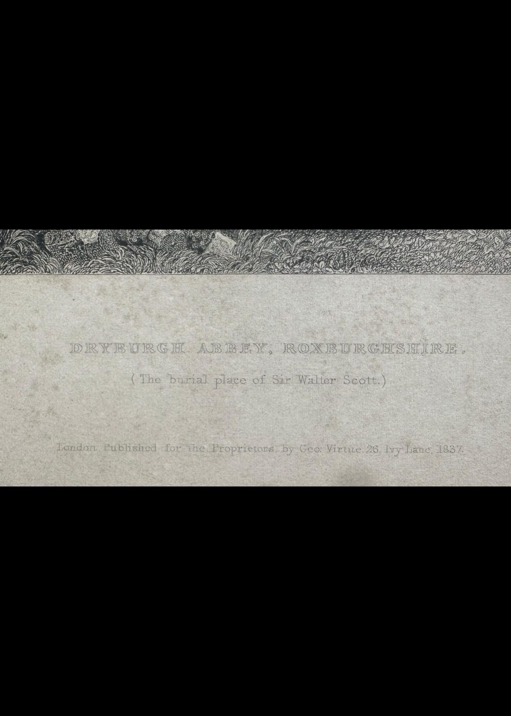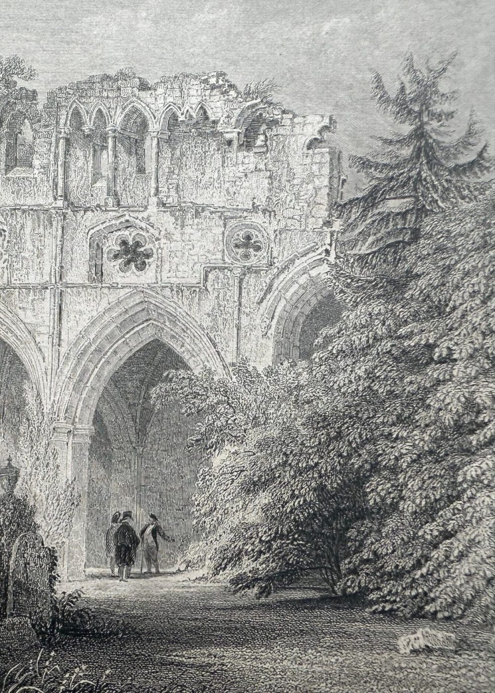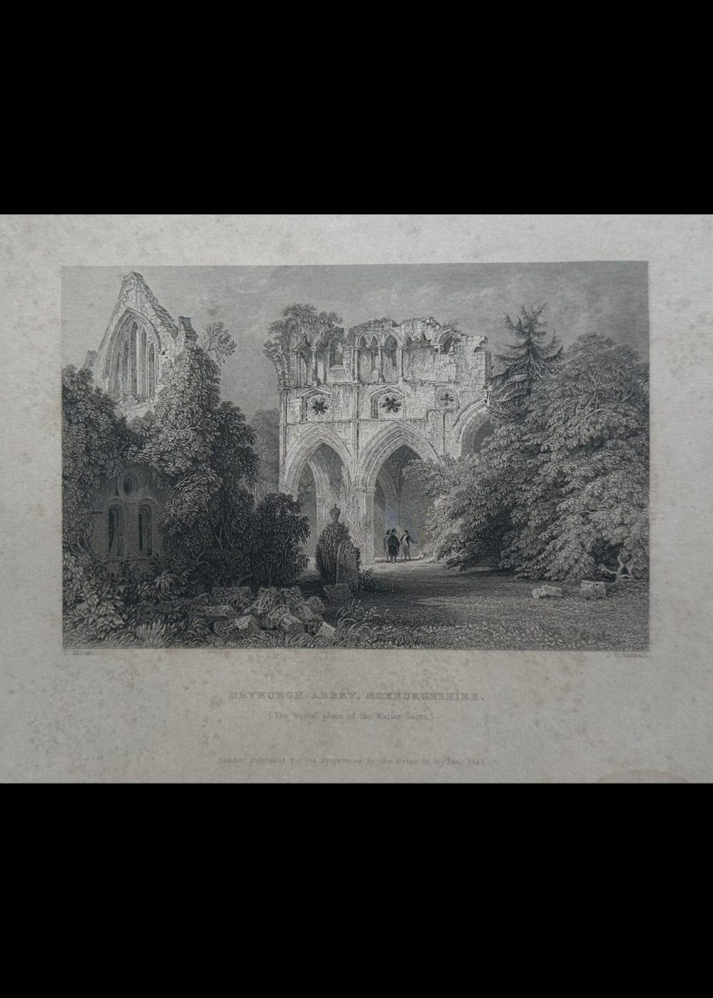 This evocative engraving depicts the ruins of Dryburgh Abbey, located in Roxburghshire, Scotland, and famously known as the burial place of Sir Walter Scott. The view captures the haunting beauty of the Gothic abbey, partially reclaimed by nature and framed by lush, overgrown trees and ivy. The central structure is a tall, arched ruin—its once-soaring windows and elegant stonework now broken and weathered, yet still conveying the architectural grace of medieval monastic design. Delicate rose windows and carved details hint at the abbey’s former grandeur. In the background, several small human figures stroll beneath the archway, lending a sense of scale and human presence to the timeless scene. To the left, thick vegetation clings to the crumbling walls, creating a romantic interplay between the natural world and the decaying monument. The composition is serene yet melancholic, evoking themes of loss, memory, and the passage of time—fitting for a site that holds the remains of one of Scotland’s most beloved literary figures.