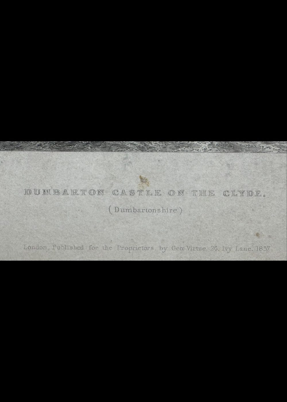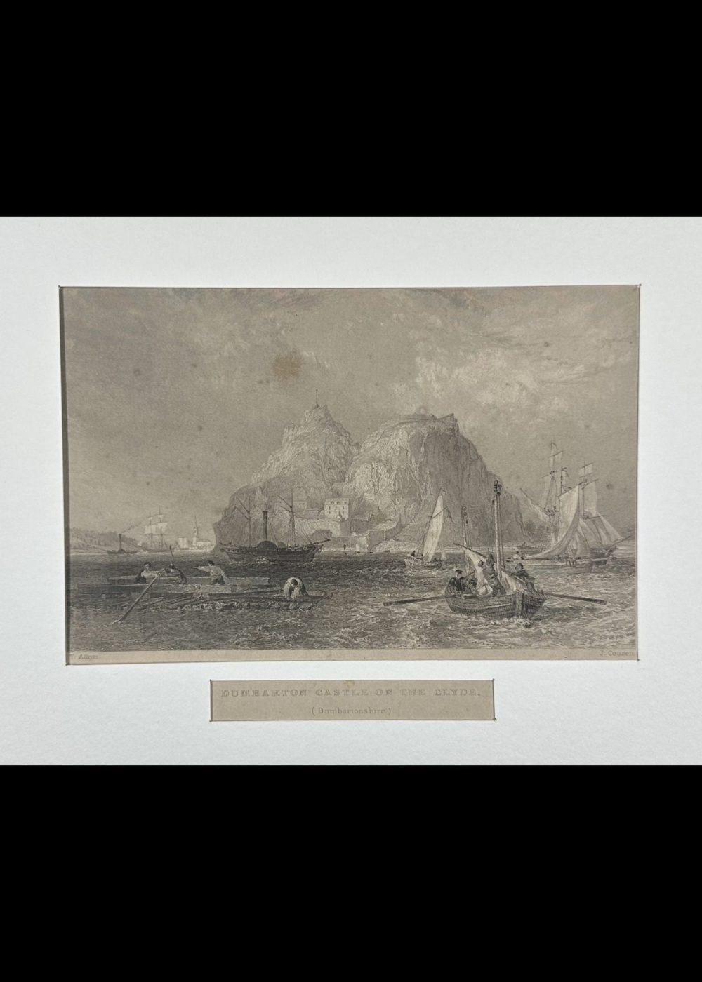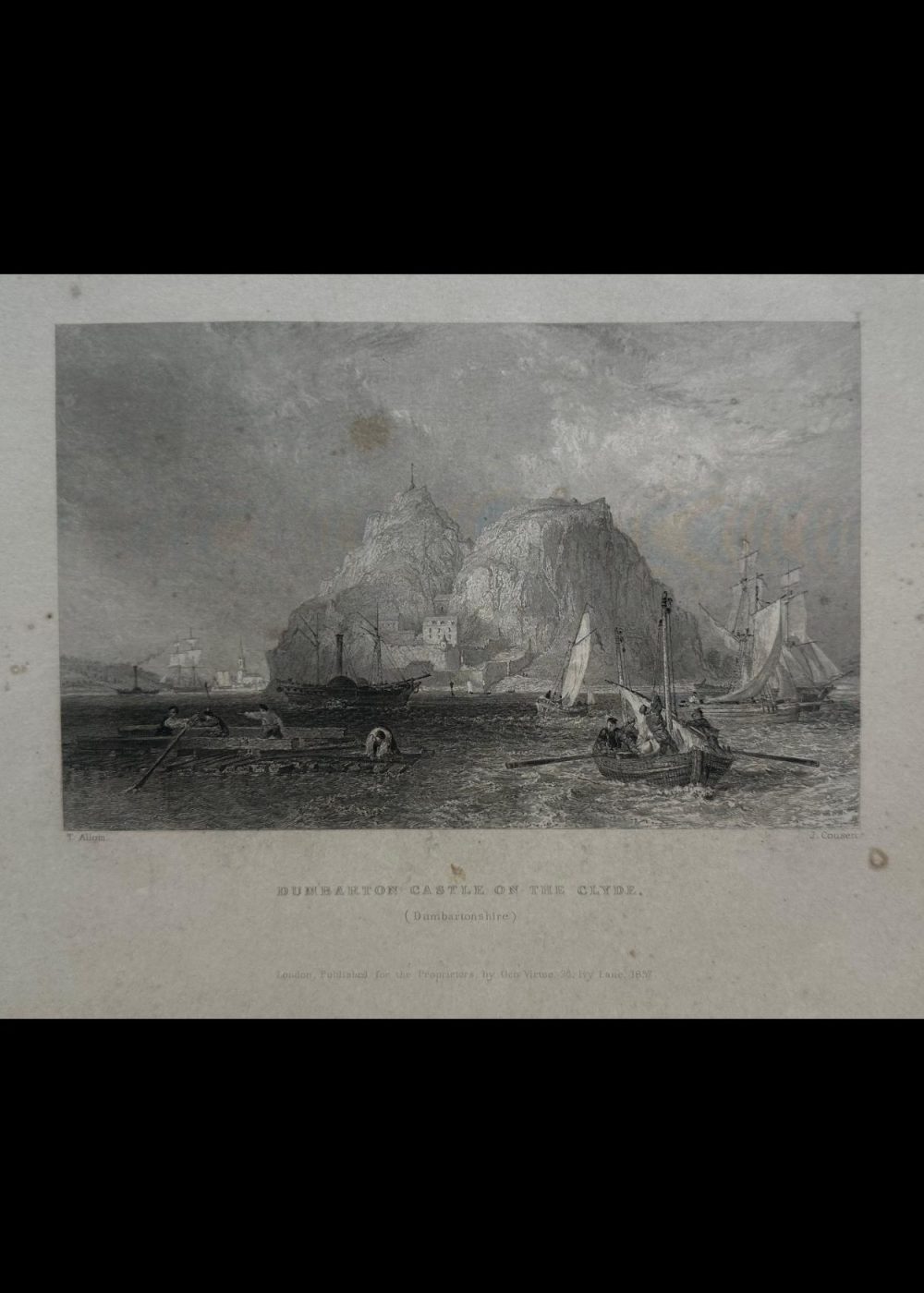 London, Published for the Proprietors, by Geo: Virtue, 26 Ivy Lane, 1837. This lively 19th-century engraving depicts the imposing Dumbarton Castle rising atop a dramatic volcanic rock formation on the banks of the River Clyde. At the foot of the rock, vessels of various kinds—sailing ships, rowboats, and working barges—animate the busy waters, reflecting the strategic and commercial significance of this historic site. The rugged prominence of the castle contrasts with the soft, cloud-streaked sky and the bustling human activity below, capturing a balance between military might and maritime livelihood in Dumbartonshire’s landscape.