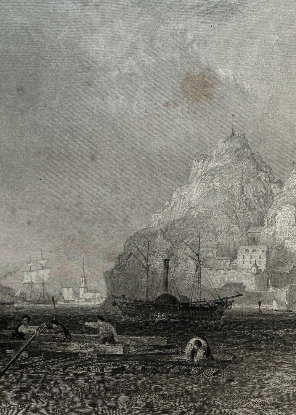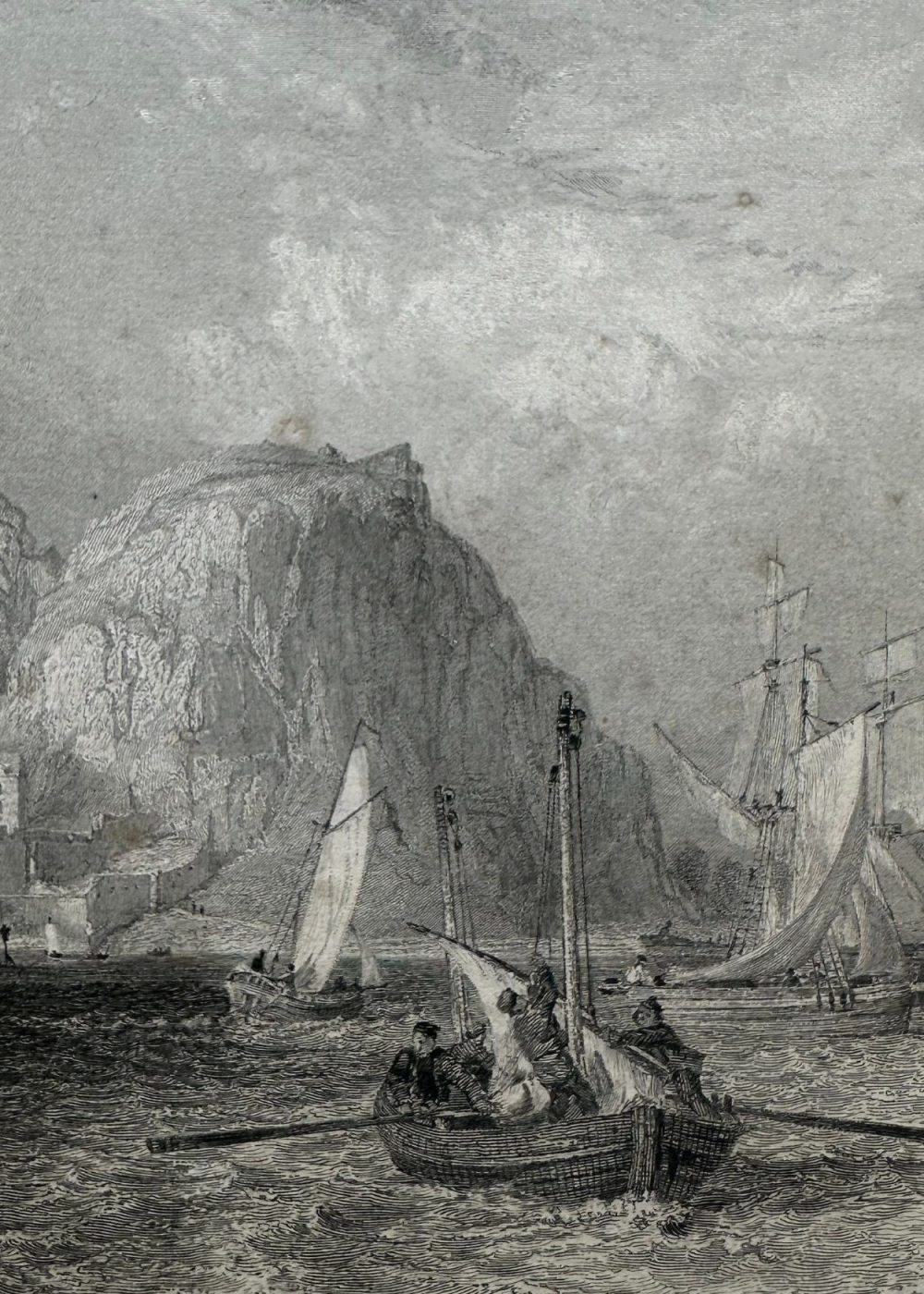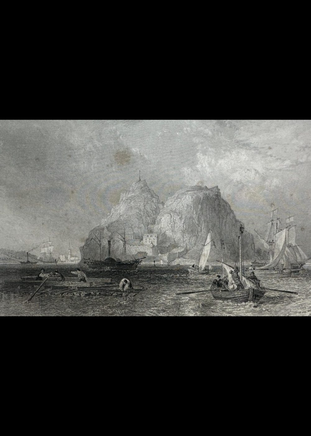 London, Published for the Proprietors, by Geo: Virtue, 26 Ivy Lane, 1837. This lively 19th-century engraving depicts the imposing Dumbarton Castle rising atop a dramatic volcanic rock formation on the banks of the River Clyde. At the foot of the rock, vessels of various kinds—sailing ships, rowboats, and working barges—animate the busy waters, reflecting the strategic and commercial significance of this historic site. The rugged prominence of the castle contrasts with the soft, cloud-streaked sky and the bustling human activity below, capturing a balance between military might and maritime livelihood in Dumbartonshire’s landscape.