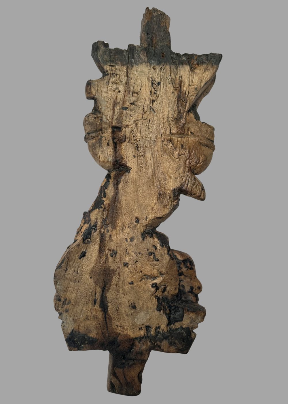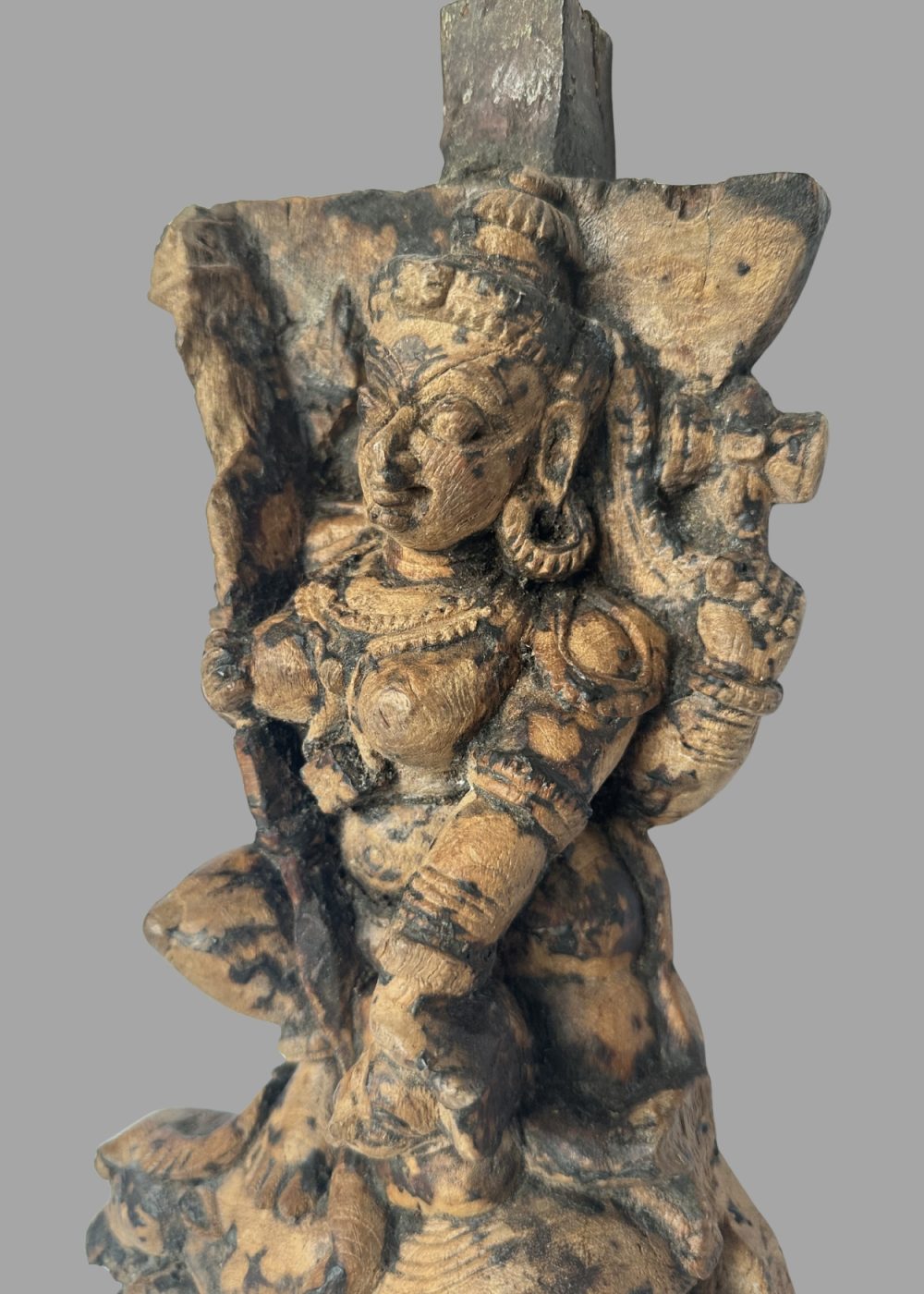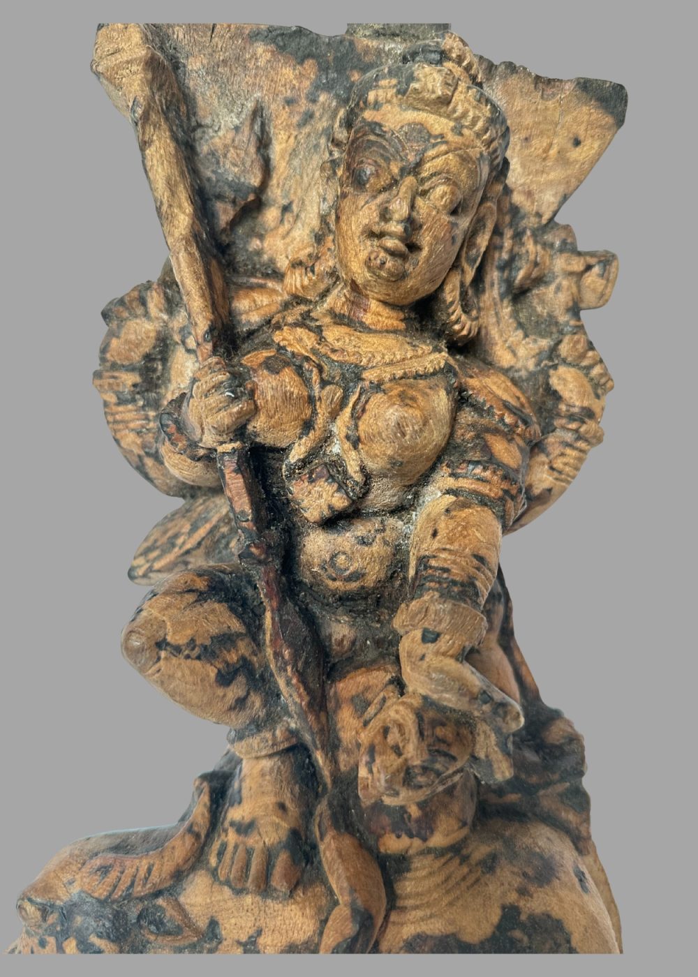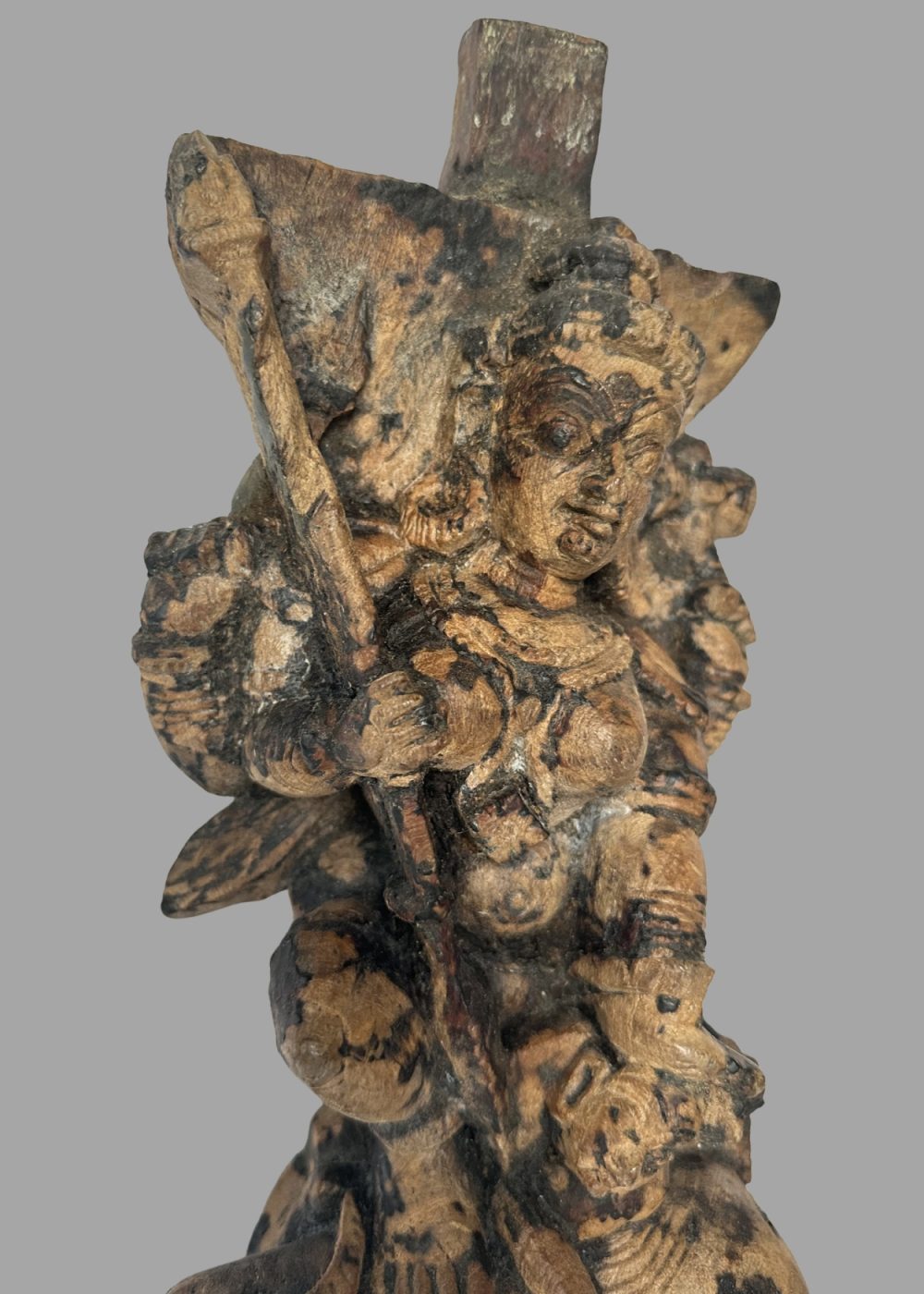 This intricately carved wooden chariot panel from 19th-century Tamil Nadu depicts Goddess Durga in a dynamic stance, engaged in battle with the buffalo demon Mahishasura. Wielding weapons and mounted on a stylized base representing the battlefield, the sculpture captures the fierce yet graceful energy of the goddess. A testament to the devotional artistry of the region, this panel was likely part of a ceremonial temple chariot, used in religious processions celebrating Durga’s victory over evil.