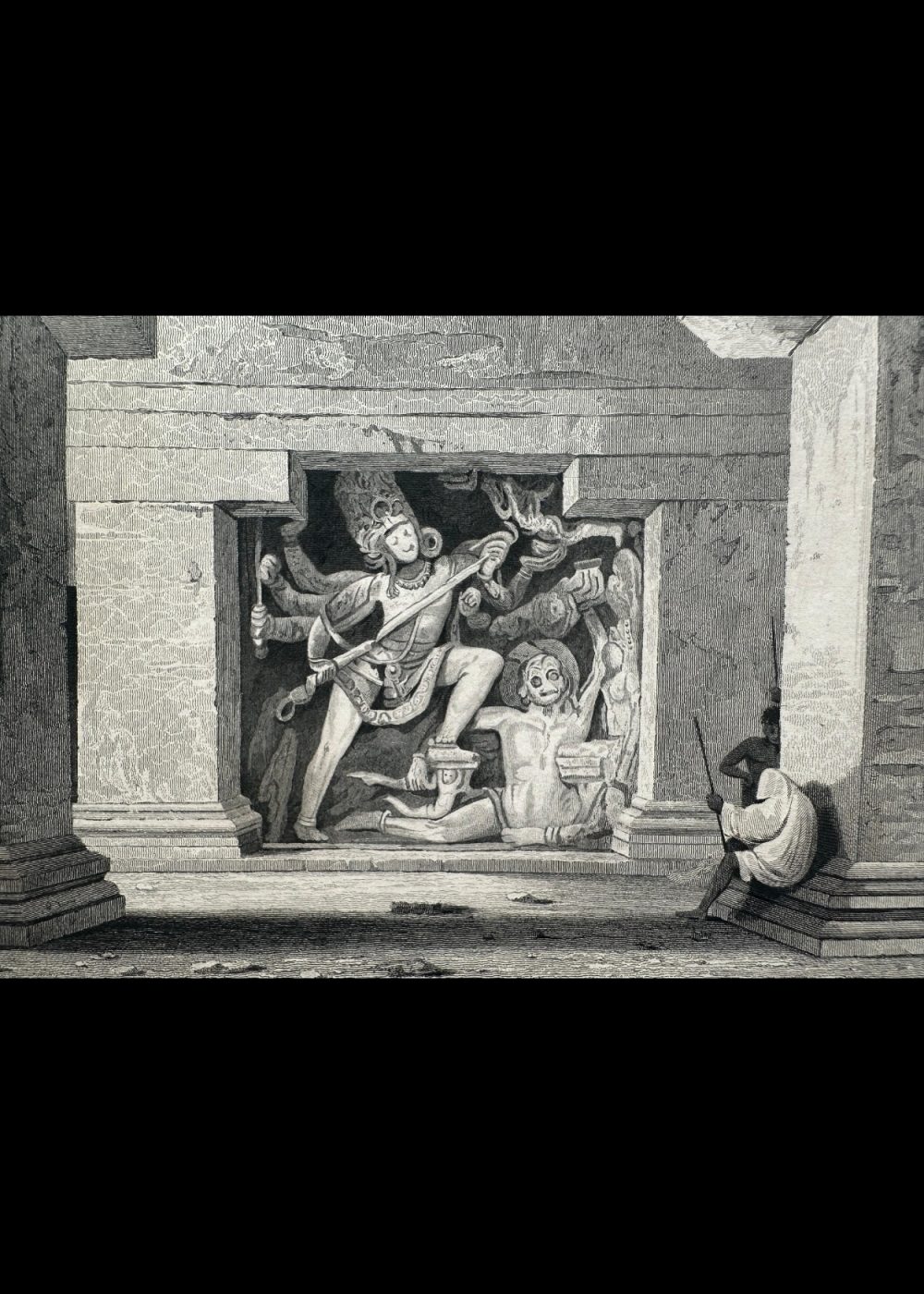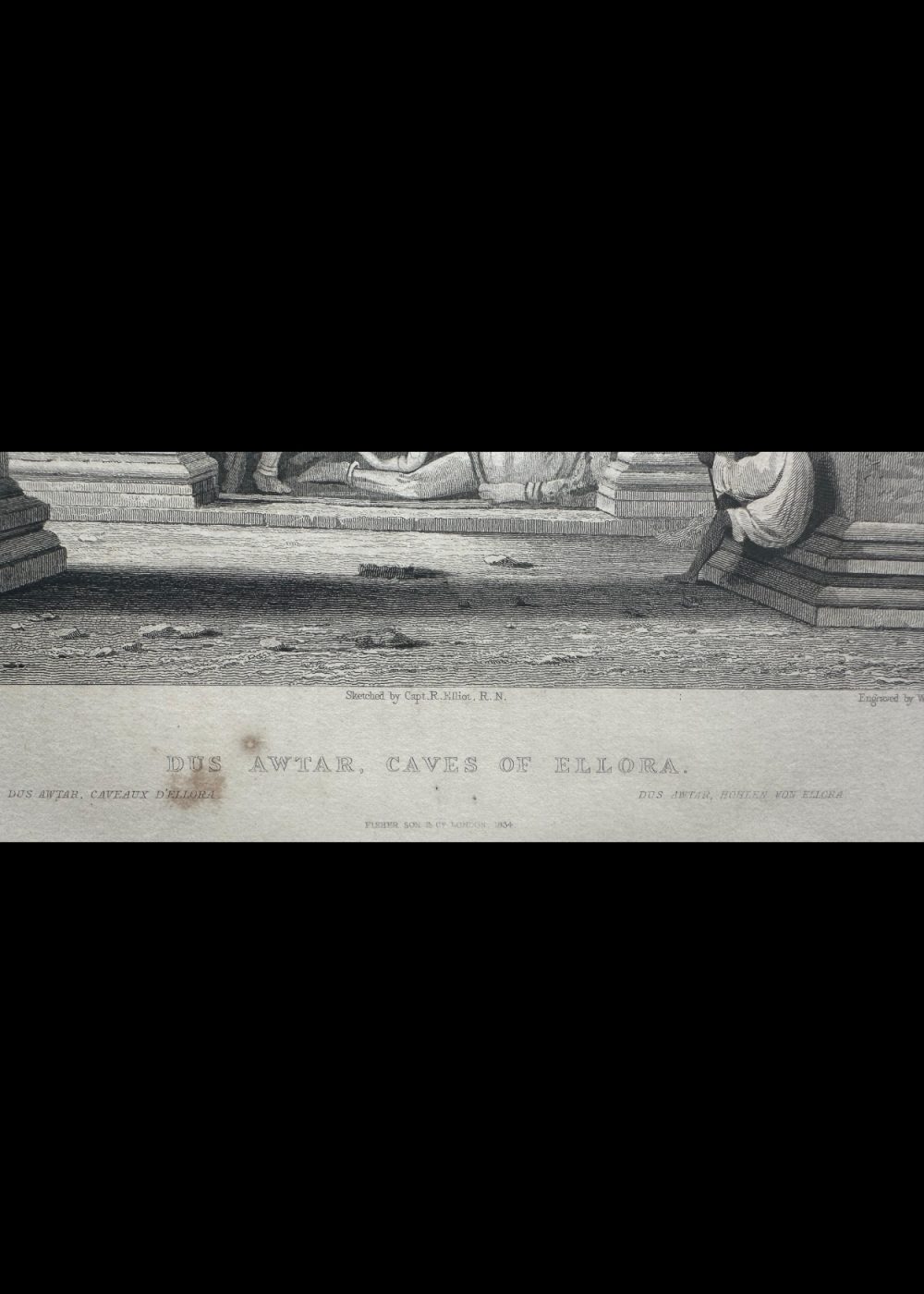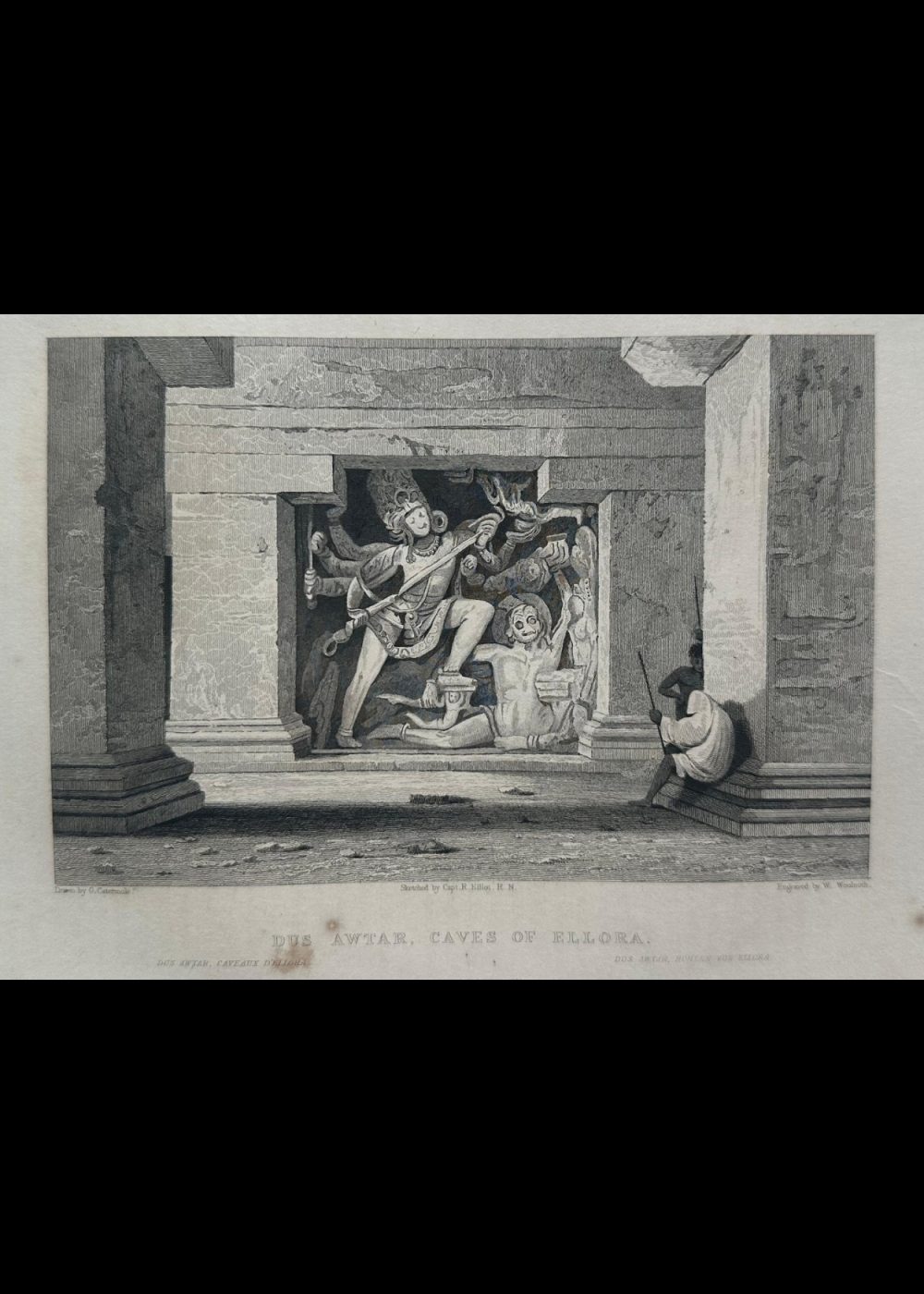 This engraving depicts the “Dus Avatar” (Ten Incarnations) scene from the Caves of Ellora, India. The image showcases a dramatic sculpture within a cave, illustrating a Hindu deity in one of its incarnations, surrounded by intricate figures. The powerful figure is shown in motion, wielding weapons and striking poses as it confronts adversaries. A person is seated on the ground, possibly in contemplation, next to the sculpture.This artwork is part of the “India China” book and was created by G. Catermole, with the sketch made by Captain R. Elliot, R.N., and engraved by W. Woolnoth. The engraving was published during the mid-19th century, capturing the artistic and spiritual significance of Ellora’s ancient cave temples.