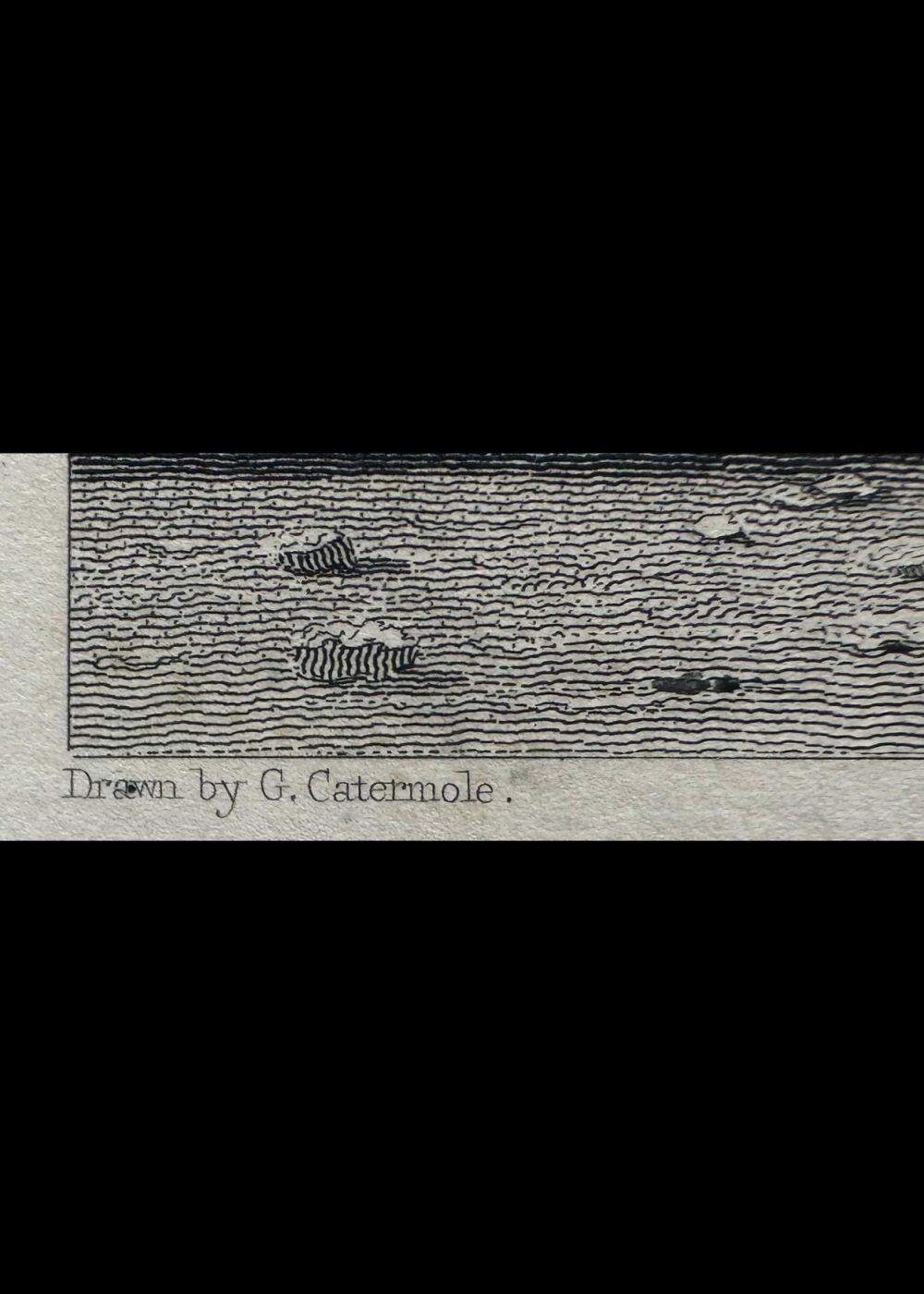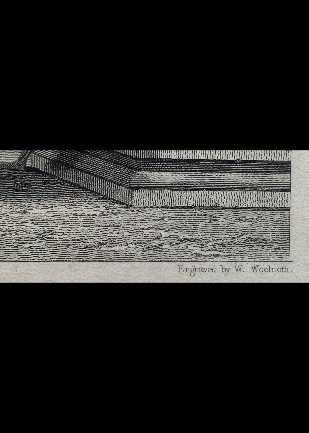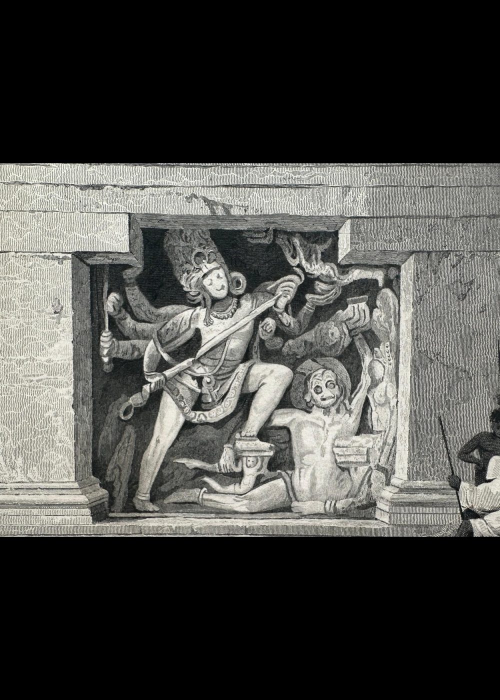 This engraving depicts the “Dus Avatar” (Ten Incarnations) scene from the Caves of Ellora, India. The image showcases a dramatic sculpture within a cave, illustrating a Hindu deity in one of its incarnations, surrounded by intricate figures. The powerful figure is shown in motion, wielding weapons and striking poses as it confronts adversaries. A person is seated on the ground, possibly in contemplation, next to the sculpture.This artwork is part of the “India China” book and was created by G. Catermole, with the sketch made by Captain R. Elliot, R.N., and engraved by W. Woolnoth. The engraving was published during the mid-19th century, capturing the artistic and spiritual significance of Ellora’s ancient cave temples.