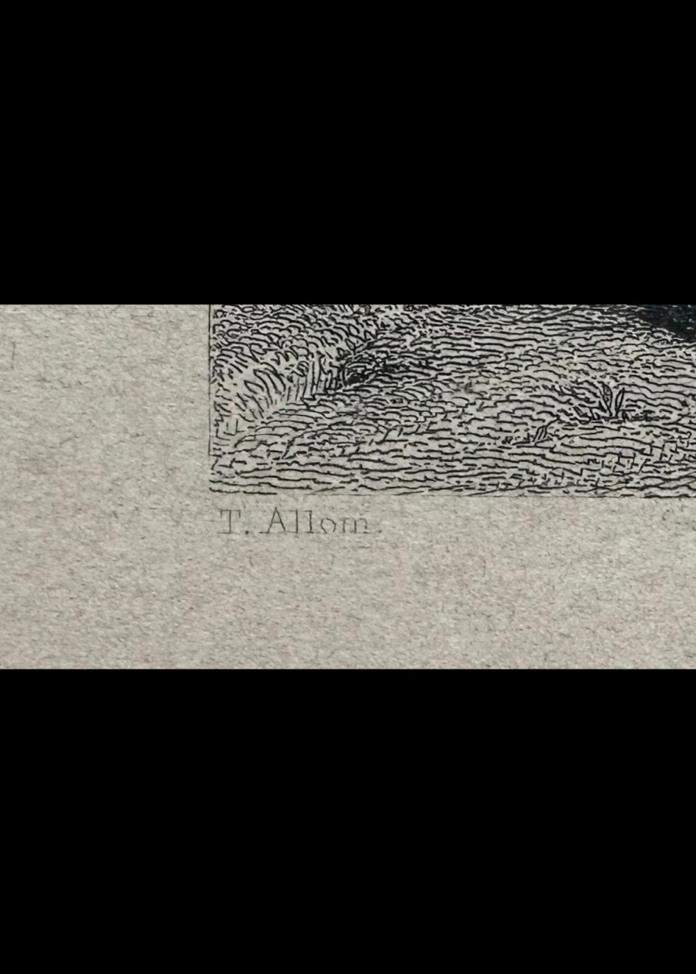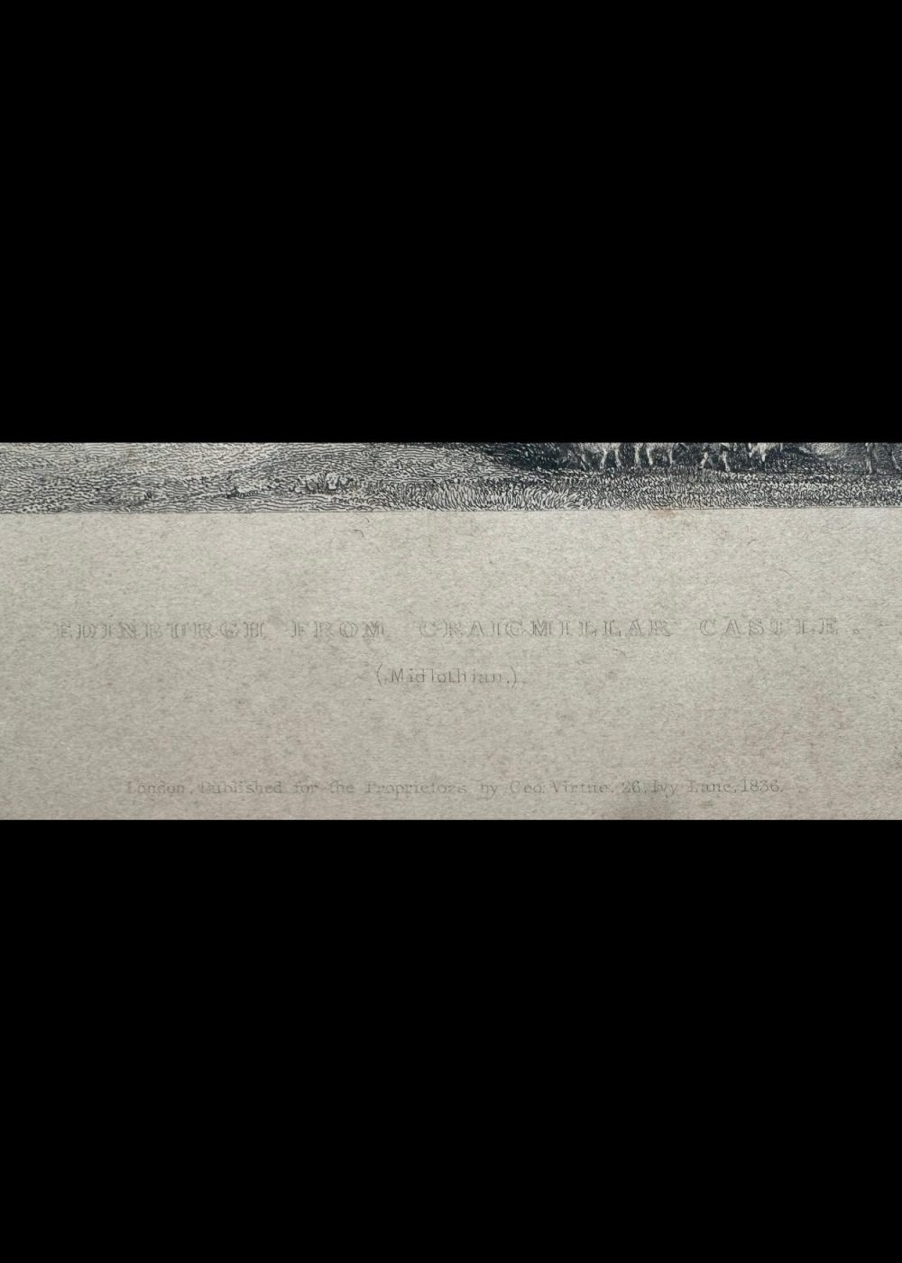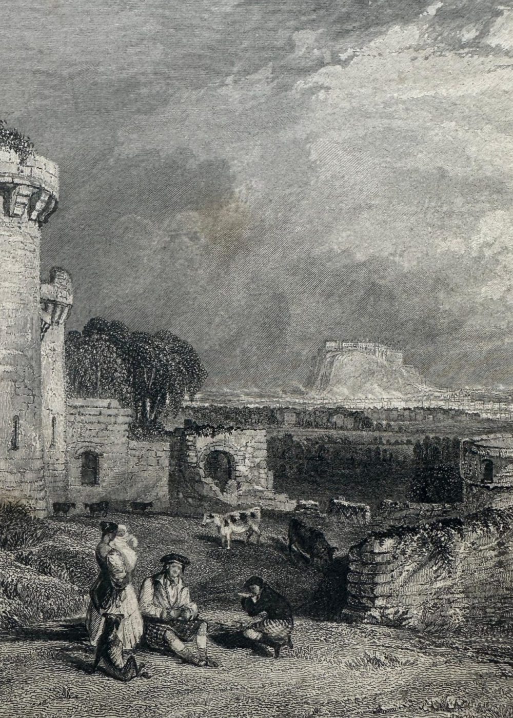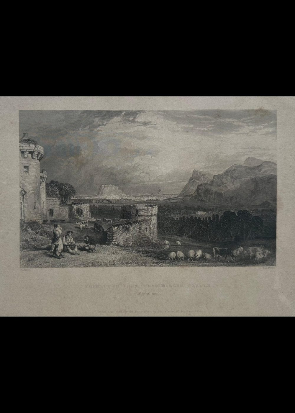This picturesque engraving presents a panoramic view of Edinburgh, as seen from the grounds of the historic Craigmillar Castle in Midlothian, Scotland. In the left foreground, the sturdy medieval towers and battlements of Craigmillar rise with weathered dignity, offering a quiet contrast to the expansive cityscape beyond. Groups of figures populate the castle’s foreground—peasants seated and conversing, a woman carrying a vessel, and animals grazing—bringing a touch of rustic life to the historical site. Beyond the ruins, the Edinburgh Castle looms in the middle distance, perched high upon Castle Rock, commanding the city below. The familiar silhouette of Arthur’s Seat and Salisbury Crags towers in the background, rendered in strong relief under the dramatic skies. Thomas Allom’s artistic vision is complemented by R. A. Prior’s precise engraving, together capturing both the romantic ruin of the castle and the vibrant life of the Scottish capital. This engraving is part of a 19th-century topographical series that celebrated the union of historical grandeur and natural beauty in British landscapes.