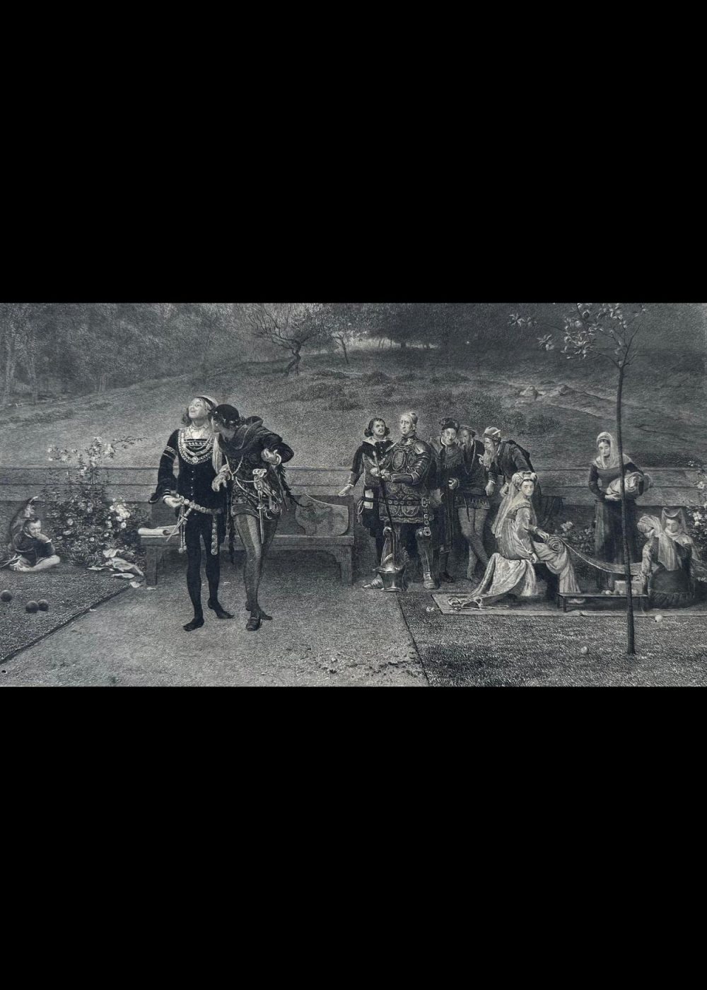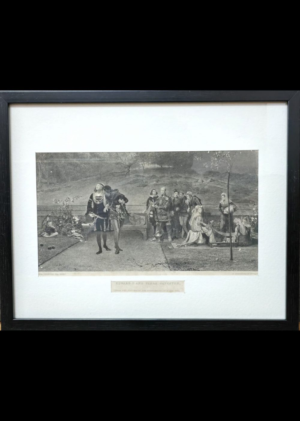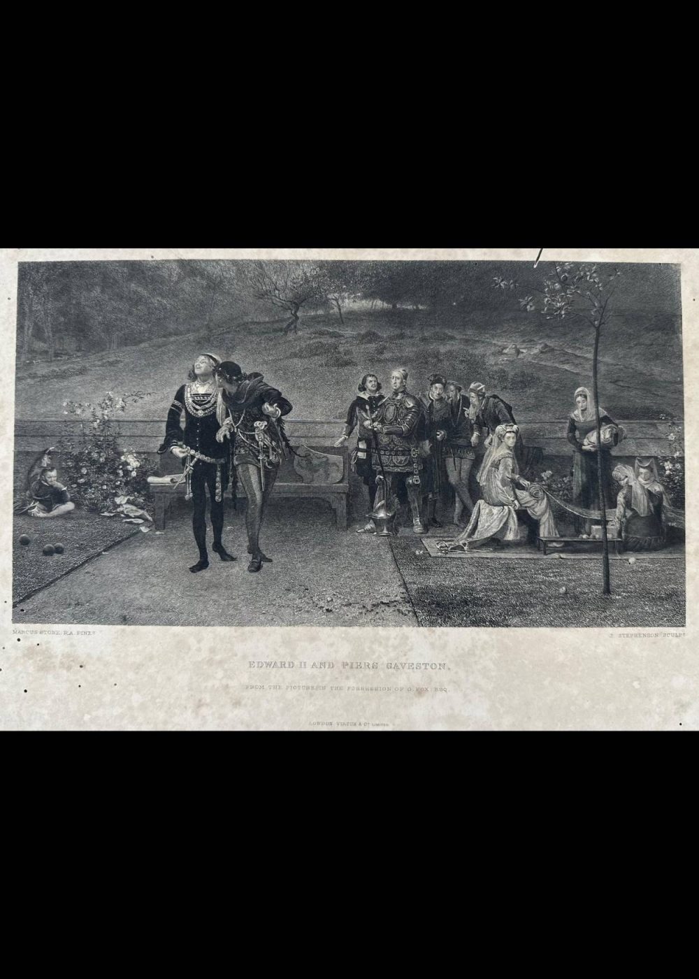 This engraving, after a painting by Marcus Stone, R.A., depicts King Edward II of England with his close companion Piers Gaveston. The scene captures a moment of intimacy and favoritism, as Gaveston leans toward the king while courtiers and nobles look on with mixed expressions of disapproval and intrigue. Ladies seated in the foreground add a sense of courtly refinement, while the detailed garden setting enhances the atmosphere of both elegance and tension. Engraved by J. Stephenson, the work reflects themes of loyalty, power, and scandal within medieval English history.