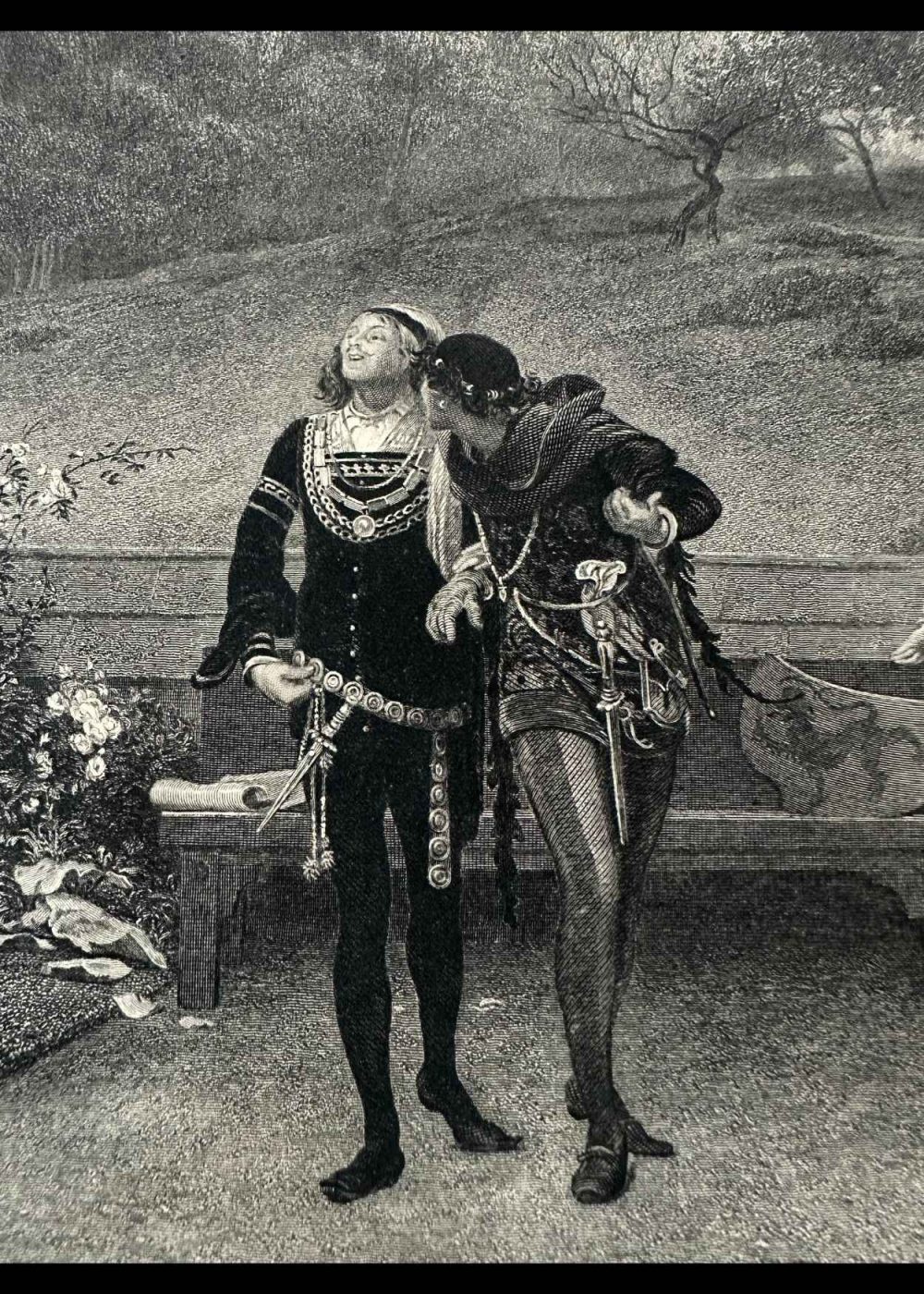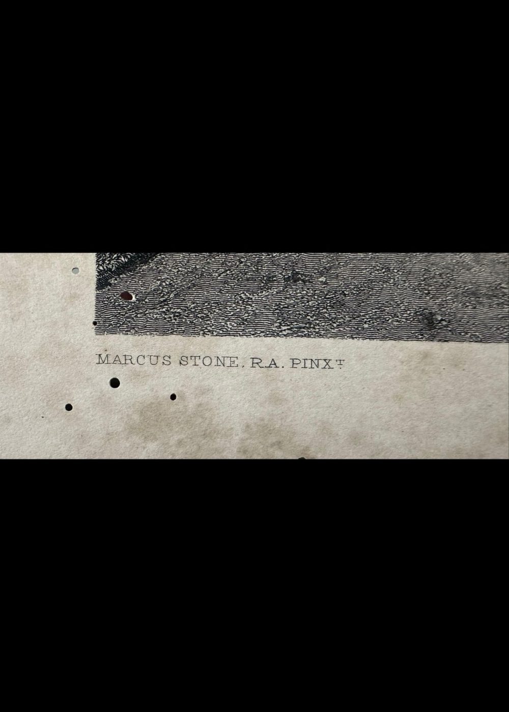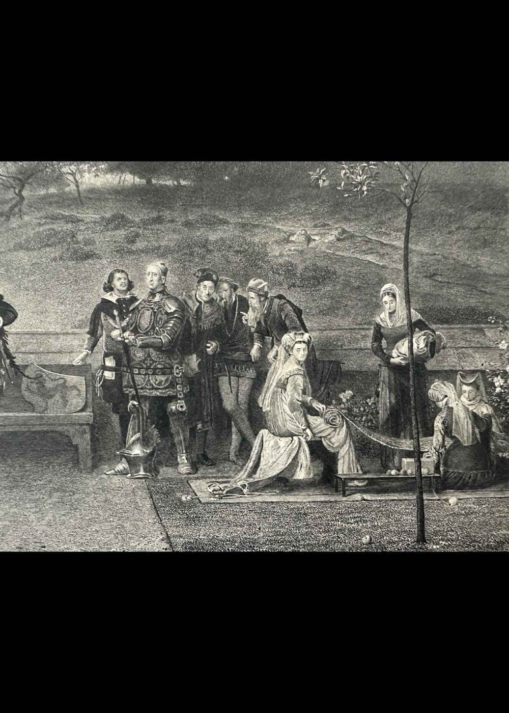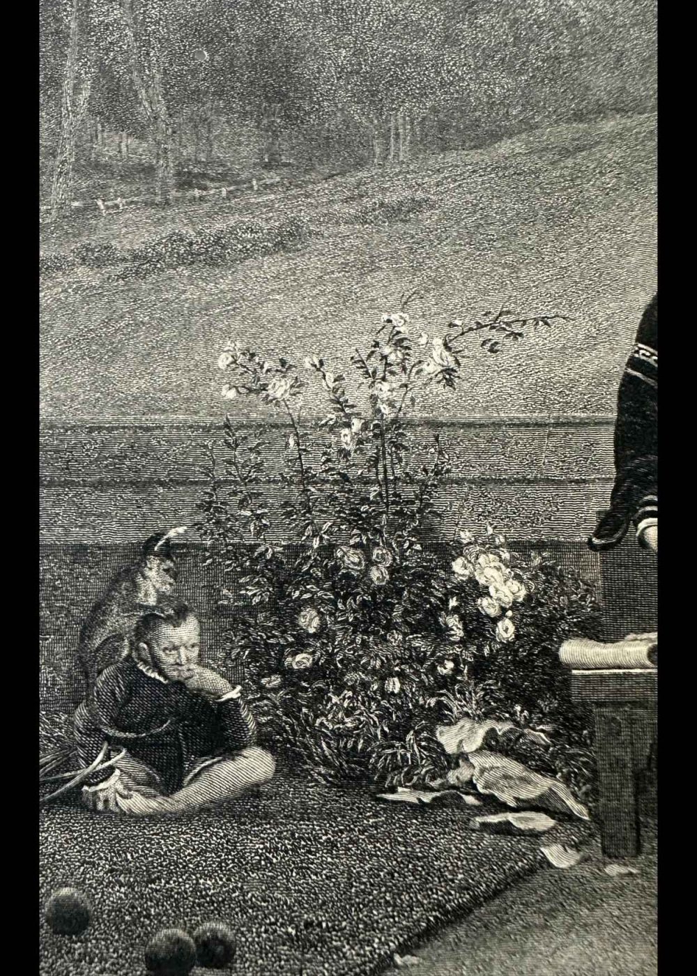 This engraving, after a painting by Marcus Stone, R.A., depicts King Edward II of England with his close companion Piers Gaveston. The scene captures a moment of intimacy and favoritism, as Gaveston leans toward the king while courtiers and nobles look on with mixed expressions of disapproval and intrigue. Ladies seated in the foreground add a sense of courtly refinement, while the detailed garden setting enhances the atmosphere of both elegance and tension. Engraved by J. Stephenson, the work reflects themes of loyalty, power, and scandal within medieval English history.