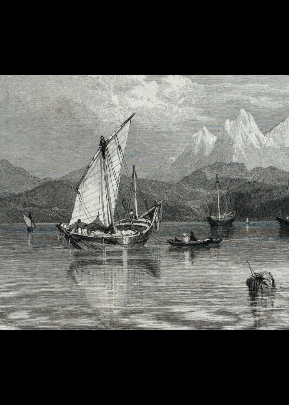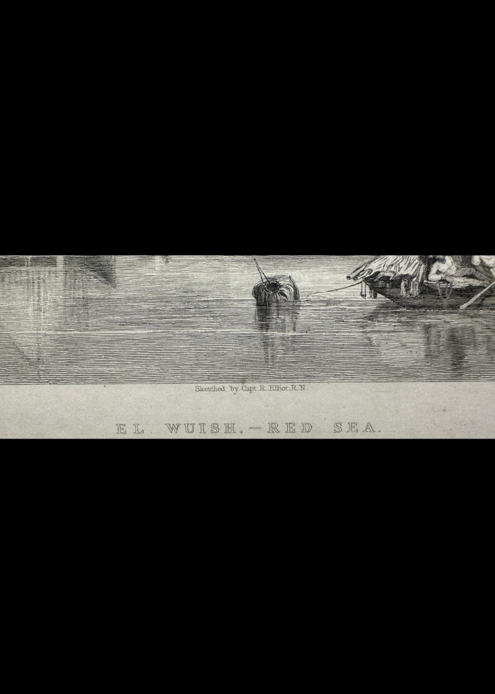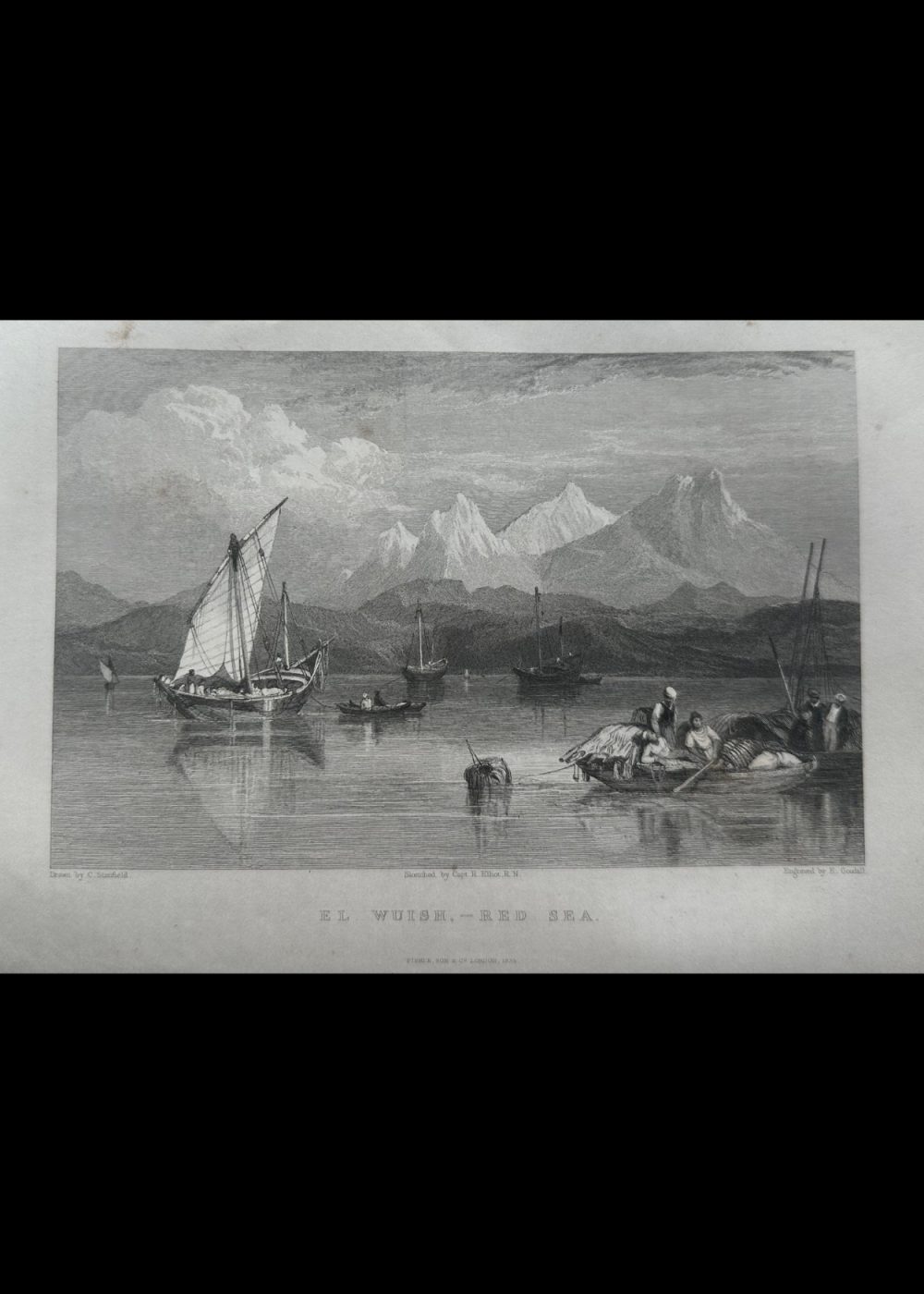 This engraving, titled El Wuisch – Red Sea, is part of the India and China book and captures a scene from the Red Sea. It depicts a group of traditional boats sailing on calm waters, with mountainous terrain in the background. In the foreground, figures on small boats are engaged in some sort of activity, possibly fishing or loading goods. The reflection of the boats and mountains in the water adds to the tranquility of the scene.The artwork was sketched by Captain R. Elliot, R.N., drawn by C. Stanfield, and engraved by E. Goodall. Published by Fisher, Son & Co. in 1836, this engraving offers a glimpse into life on the Red Sea, highlighting the natural beauty and daily activities in this region.