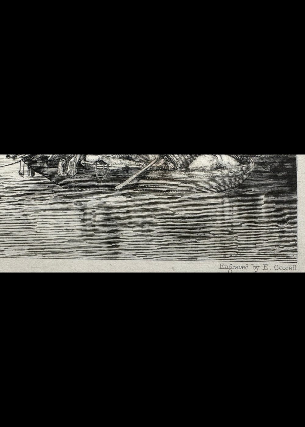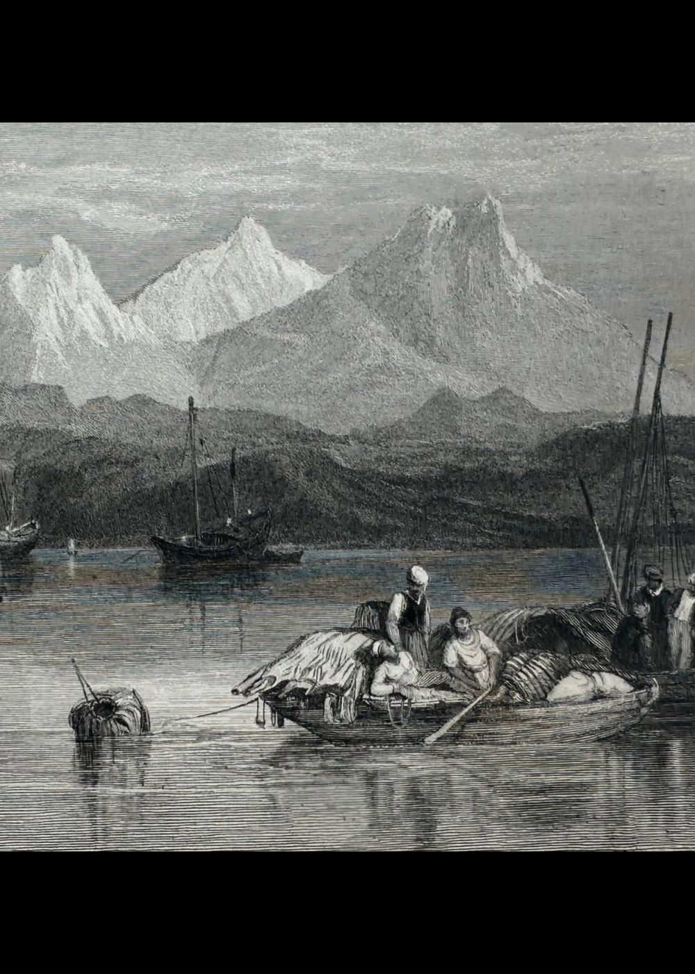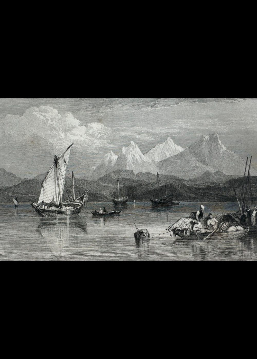 This engraving, titled El Wuisch – Red Sea, is part of the India and China book and captures a scene from the Red Sea. It depicts a group of traditional boats sailing on calm waters, with mountainous terrain in the background. In the foreground, figures on small boats are engaged in some sort of activity, possibly fishing or loading goods. The reflection of the boats and mountains in the water adds to the tranquility of the scene.The artwork was sketched by Captain R. Elliot, R.N., drawn by C. Stanfield, and engraved by E. Goodall. Published by Fisher, Son & Co. in 1836, this engraving offers a glimpse into life on the Red Sea, highlighting the natural beauty and daily activities in this region.