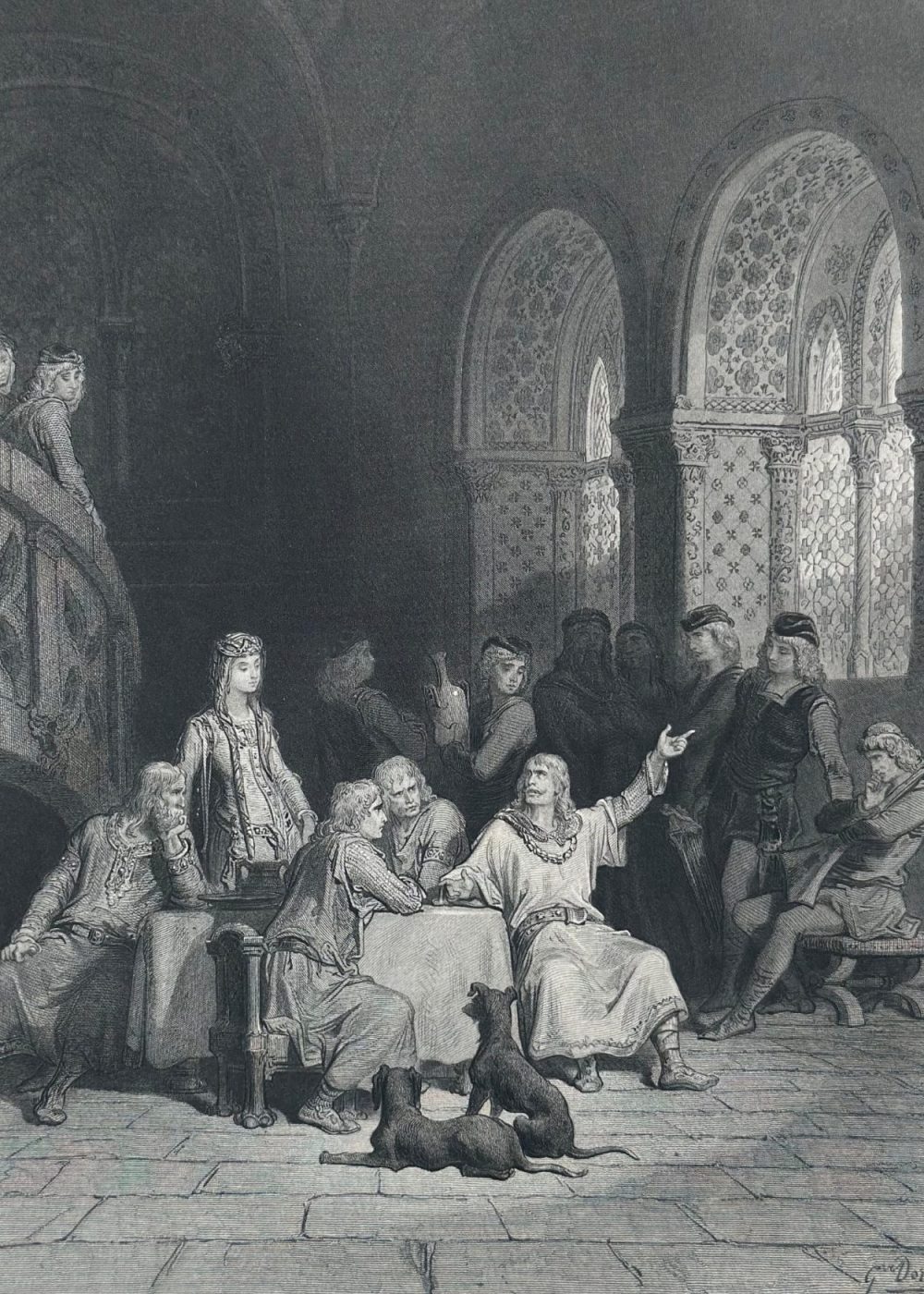 This intricate engraving by Henry Robinson, after a drawing by the celebrated French illustrator Gustave Doré, depicts a richly detailed scene from Alfred Lord Tennyson’s Idylls of the King, focusing on the character of Elaine. Set in a medieval hall with elaborate Gothic architecture and patterned arched windows, the composition centers on a dramatic moment involving Elaine and the Knights of the Round Table. The seated figures, deeply engaged in conversation, exude a mix of tension and narrative intensity, while Elaine stands among them with quiet dignity. The presence of two dogs at the foot of the table adds to the domestic realism of the setting. Doré’s dramatic contrasts of light and shadow heighten the emotional depth, capturing the romantic tragedy and nobility associated with Arthurian legend.