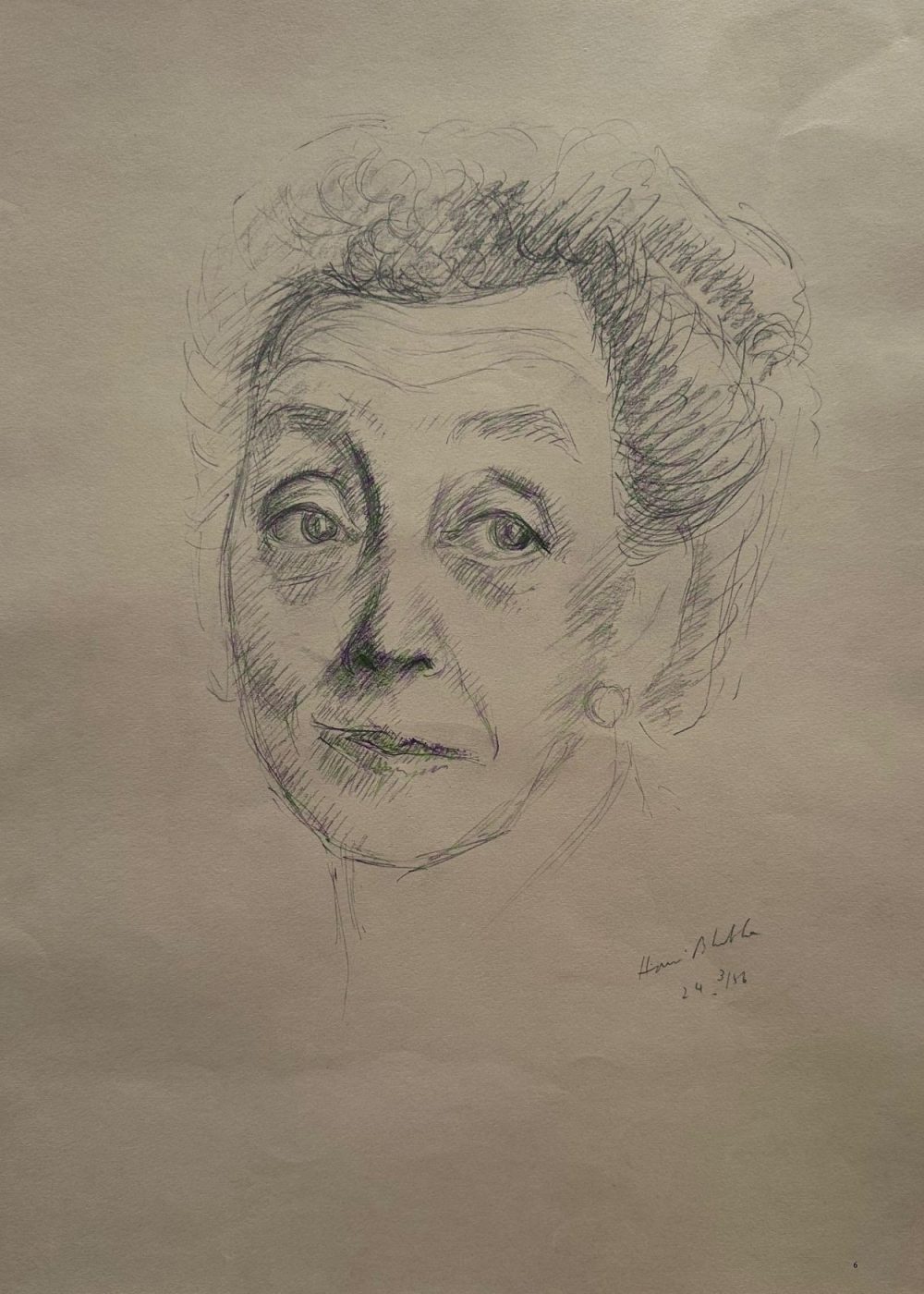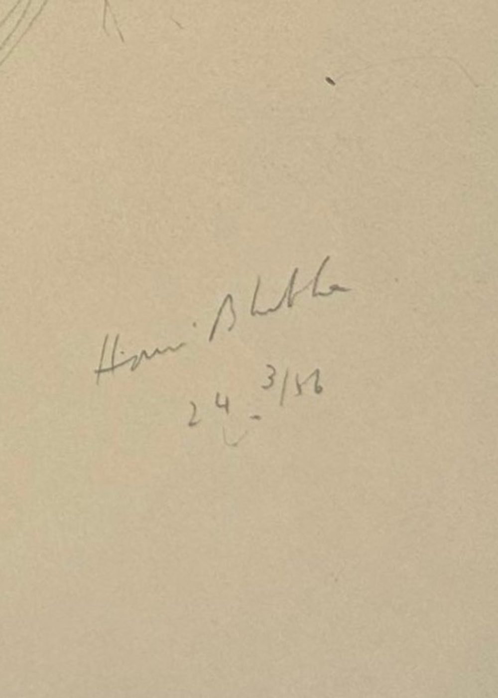 This expressive lithograph by Homi Bhabha presents the portrait of an elderly woman whose calm, inquisitive gaze draws the viewer into a moment of quiet reflection. Executed with a combination of delicate contour lines and intricate hatching, the drawing showcases Bhabha’s sensitivity to human emotion and facial nuance. Her slightly tilted head, raised brows, and softly parted lips suggest a mix of curiosity, gentleness, and age-worn wisdom. The sparse rendering of the neck and body contrasts with the meticulously worked face and hair, focusing attention on the psychological depth of the sitter. Signed and dated 24 March 1943, this work captures the enduring elegance and contemplative soul of its subject.
