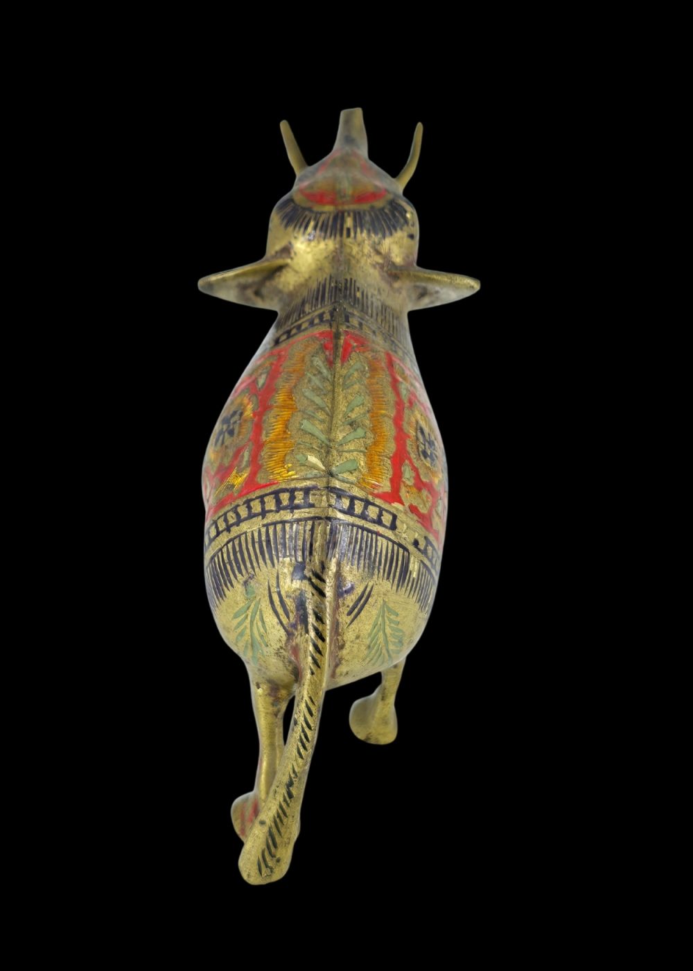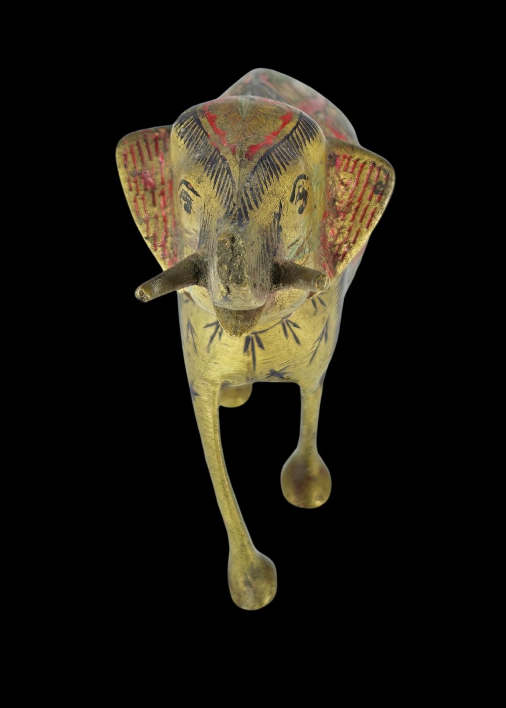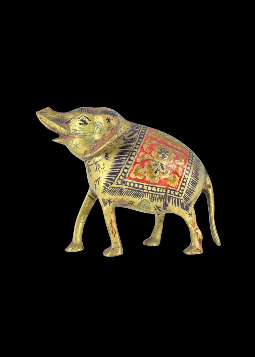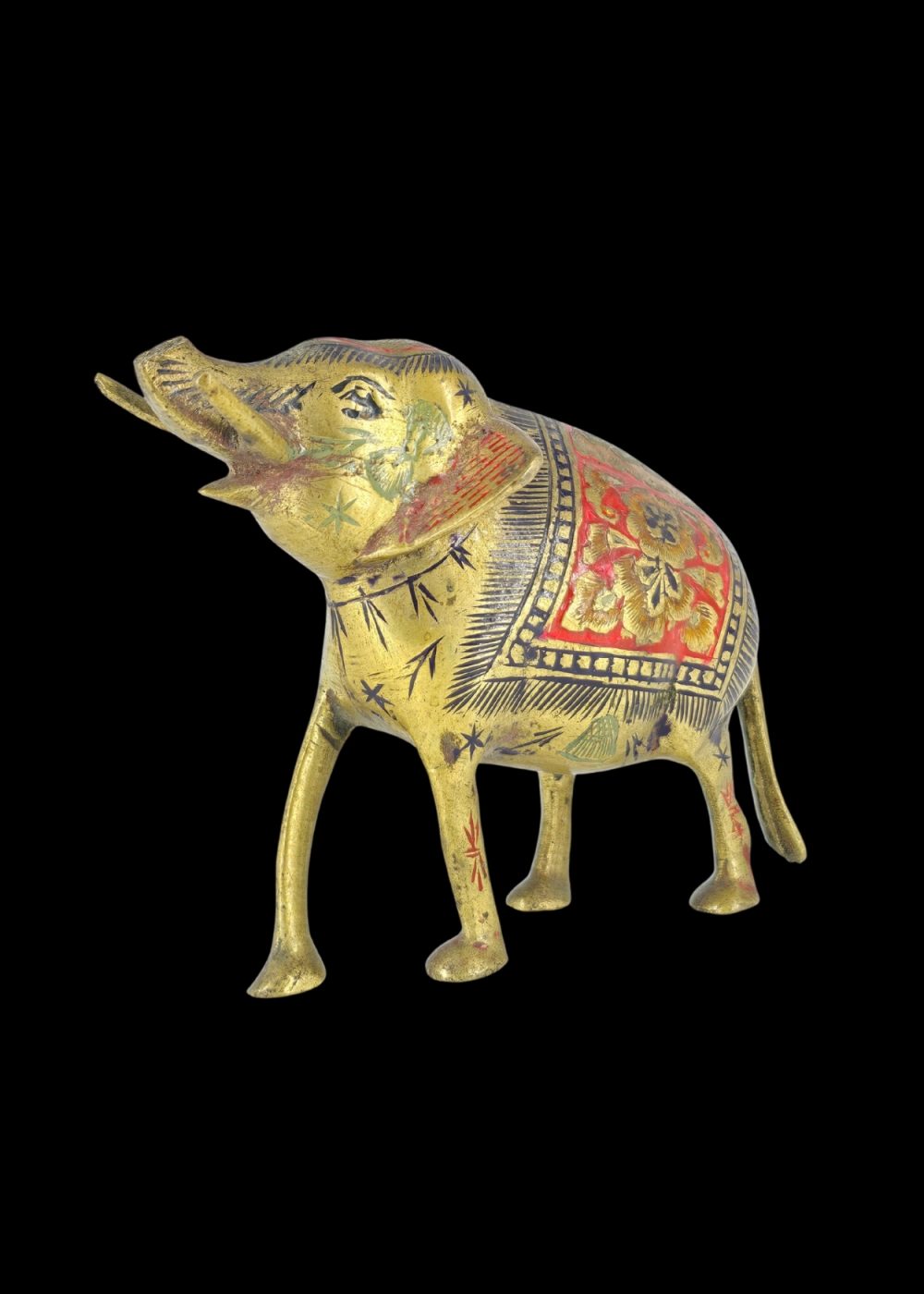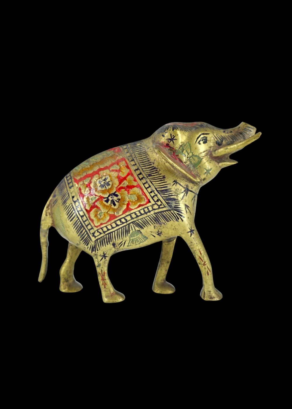 A finely crafted brass elephant adorned with intricate engraved patterns and colorful enamel work. The body features floral and geometric motifs in red, black, and gold, highlighting traditional decorative artistry. This piece symbolizes strength and good fortune, making it both a cultural artifact and a decorative collectible.