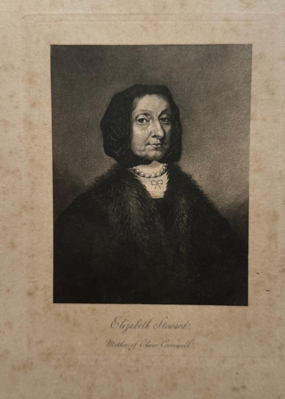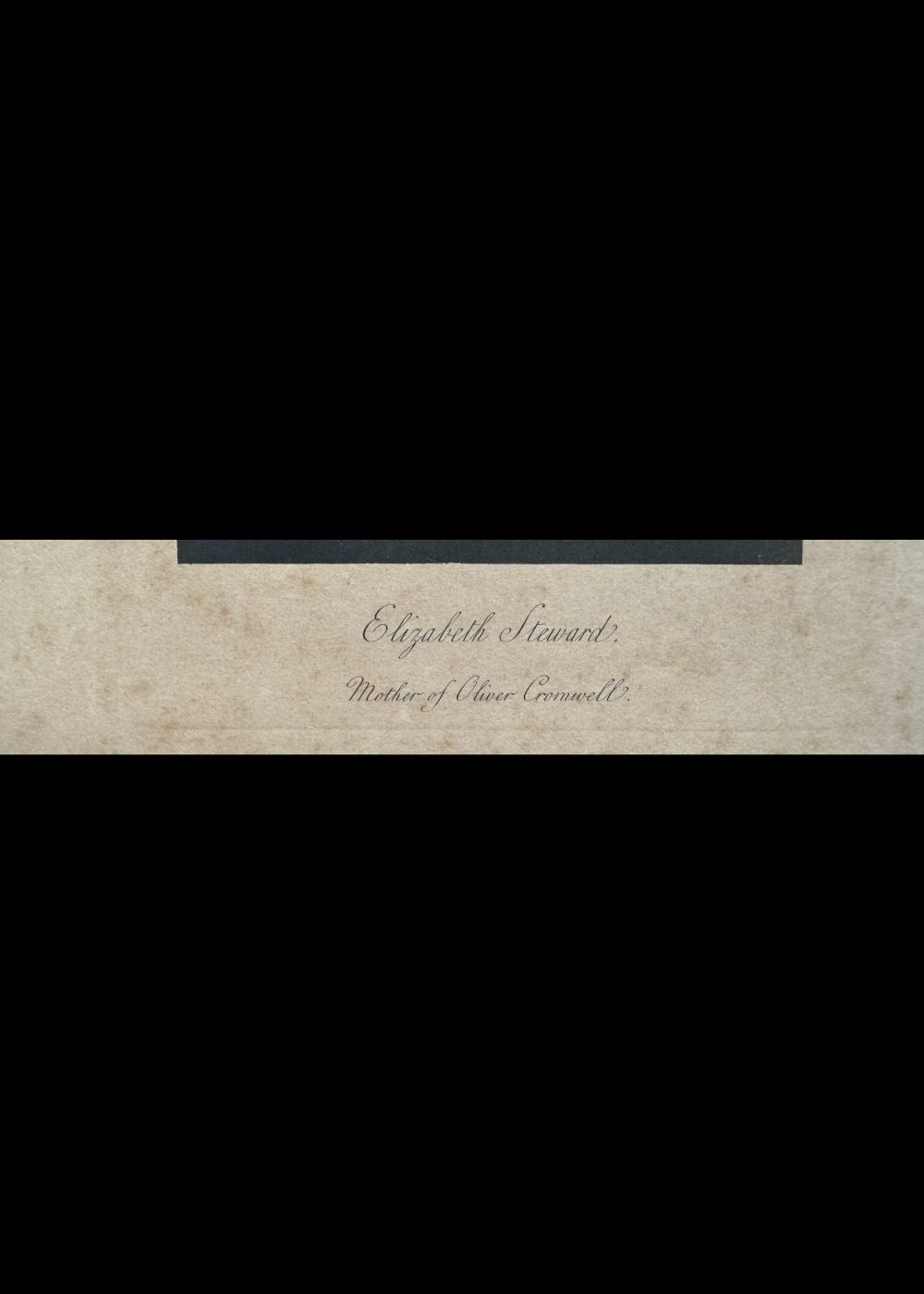 This engraved portrait depicts Elizabeth Steward, the mother of Oliver Cromwell, England’s 17th-century military and political leader. She is shown wearing a modest black headdress and fur-lined attire, with a composed and dignified expression. The style reflects the somber Puritan values associated with Cromwell’s family. The caption beneath the image identifies her clearly as “Elizabeth Steward, Mother of Oliver Cromwell.” This portrait not only offers a rare glimpse of a maternal figure behind a key historical figure but also embodies the reserved elegance of early modern English portraiture.