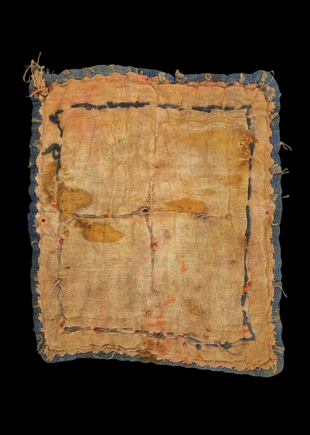 This is a traditional Banjara handcrafted textile, showcasing intricate embroidery and decorative elements. The design features a vibrant mix of geometric patterns in red, orange, and yellow, framed by a border adorned with cowrie shells and additional embellishments. The detailed stitching reflects the Banjara community’s rich cultural heritage and skilled craftsmanship, often used in garments or accessories. The textile’s vibrant colors and intricate patterns are characteristic of the Banjara style, which blends practicality with aesthetic beauty.