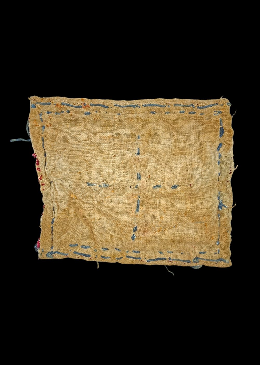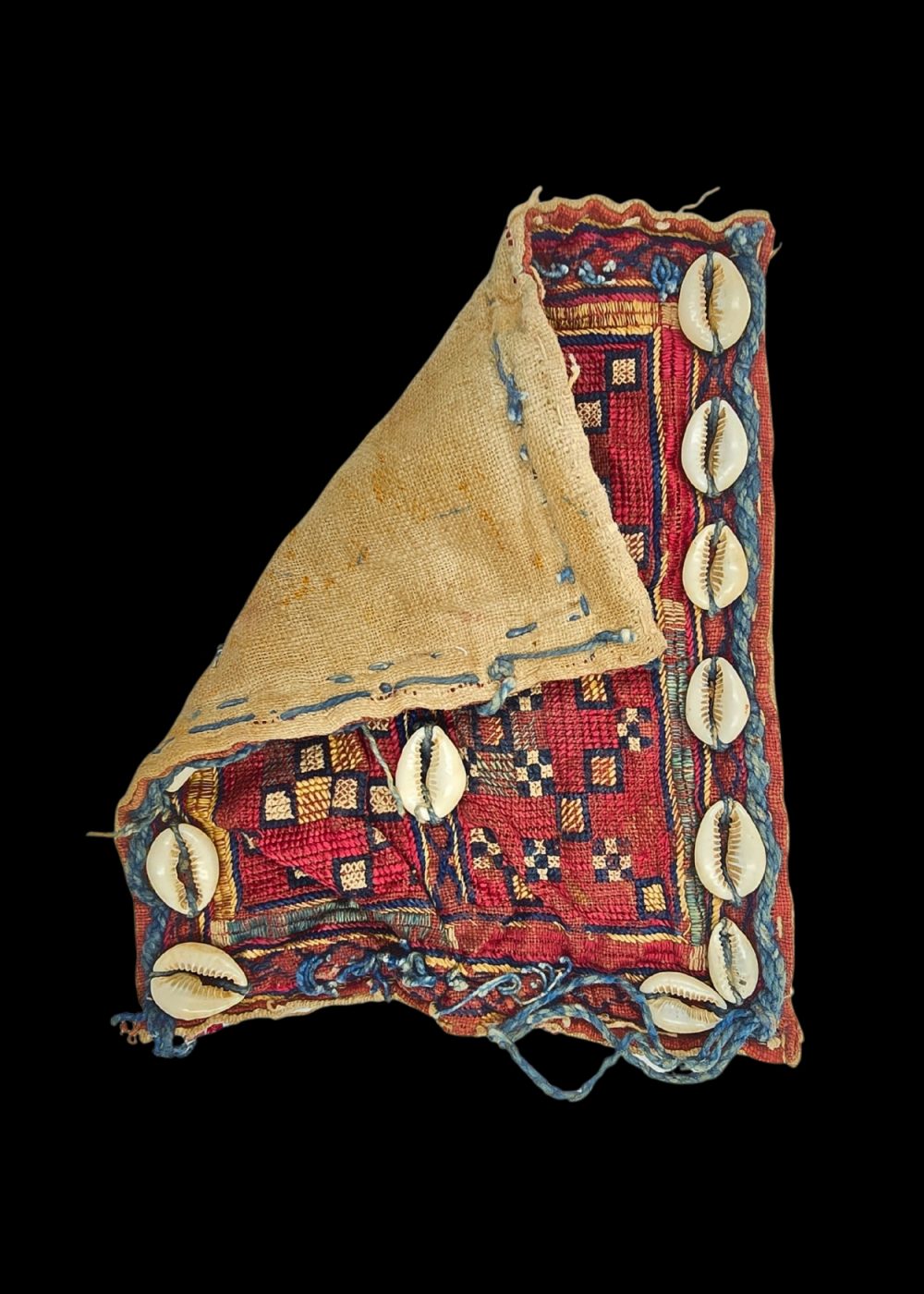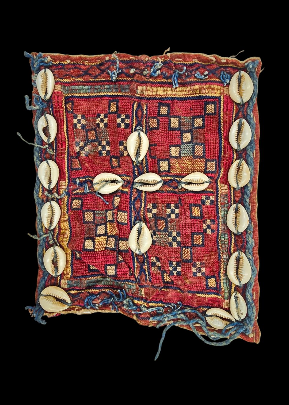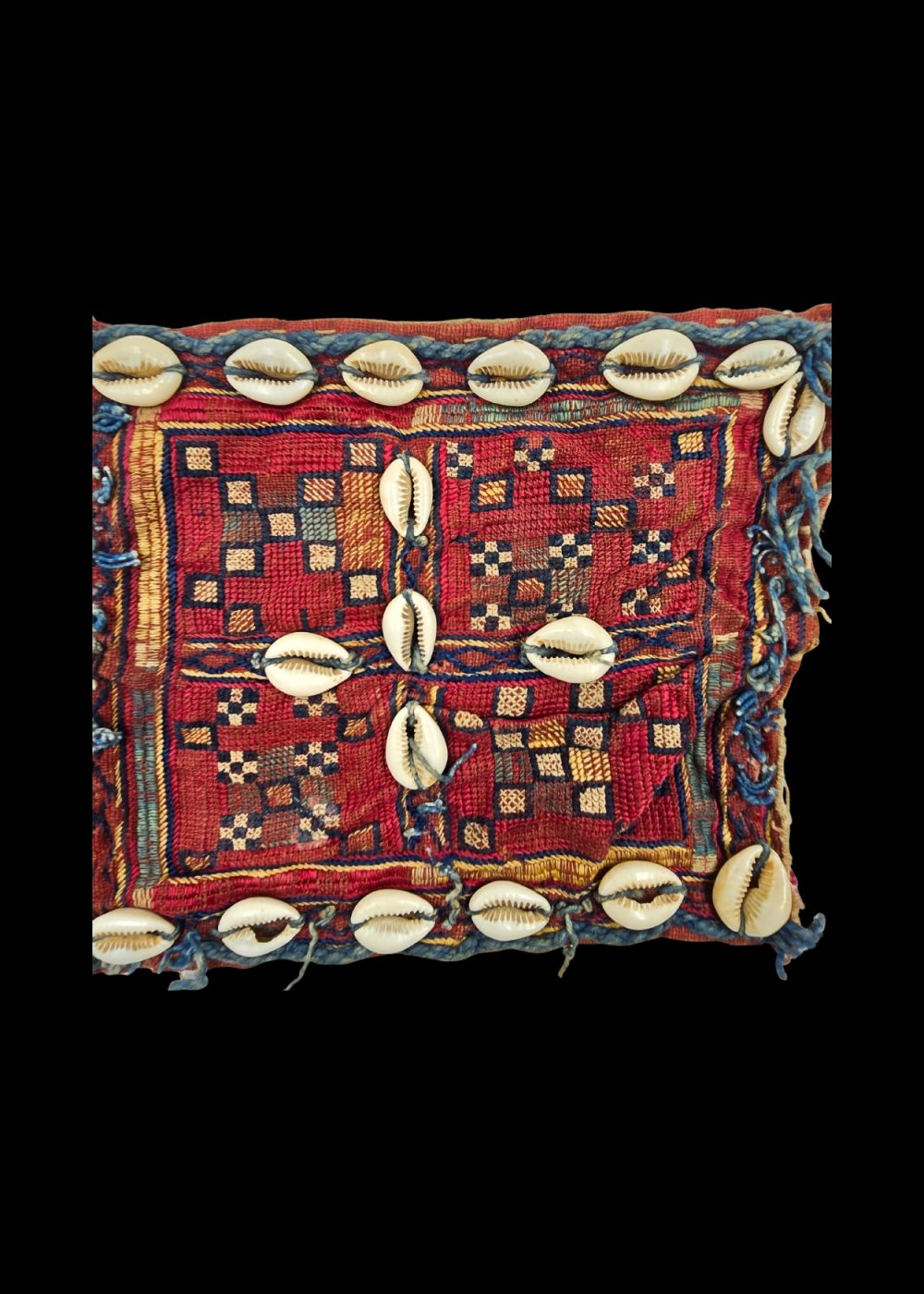 This is a vibrant, intricate piece of Banjara textile, showcasing the traditional handcrafts of the Banjara people of India. The design features geometric patterns in rich hues of red, yellow, and blue, woven into the fabric. The piece is adorned with cowrie shells, which are often used in Banjara embroidery to symbolize prosperity and protection. The edges are finished with twisted threads, adding texture and visual interest. This type of textile is commonly used in traditional attire and accessories, reflecting the Banjara’s cultural heritage and craftsmanship.