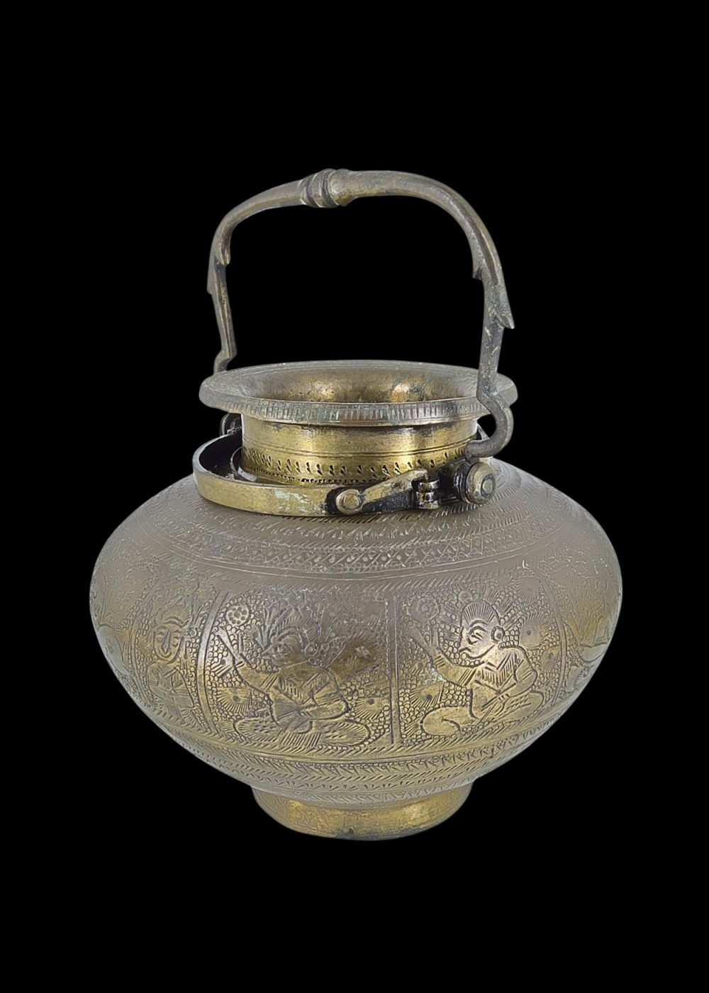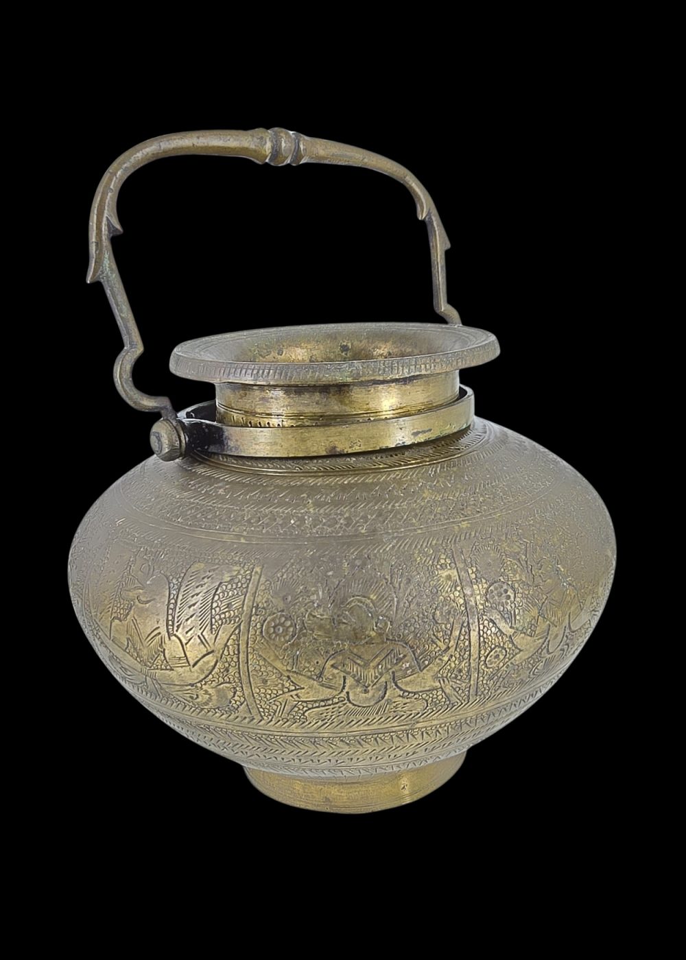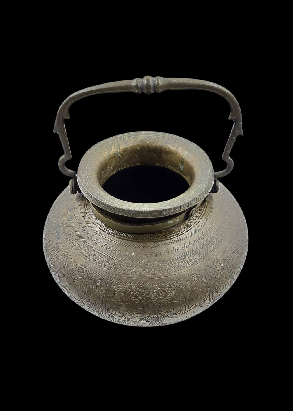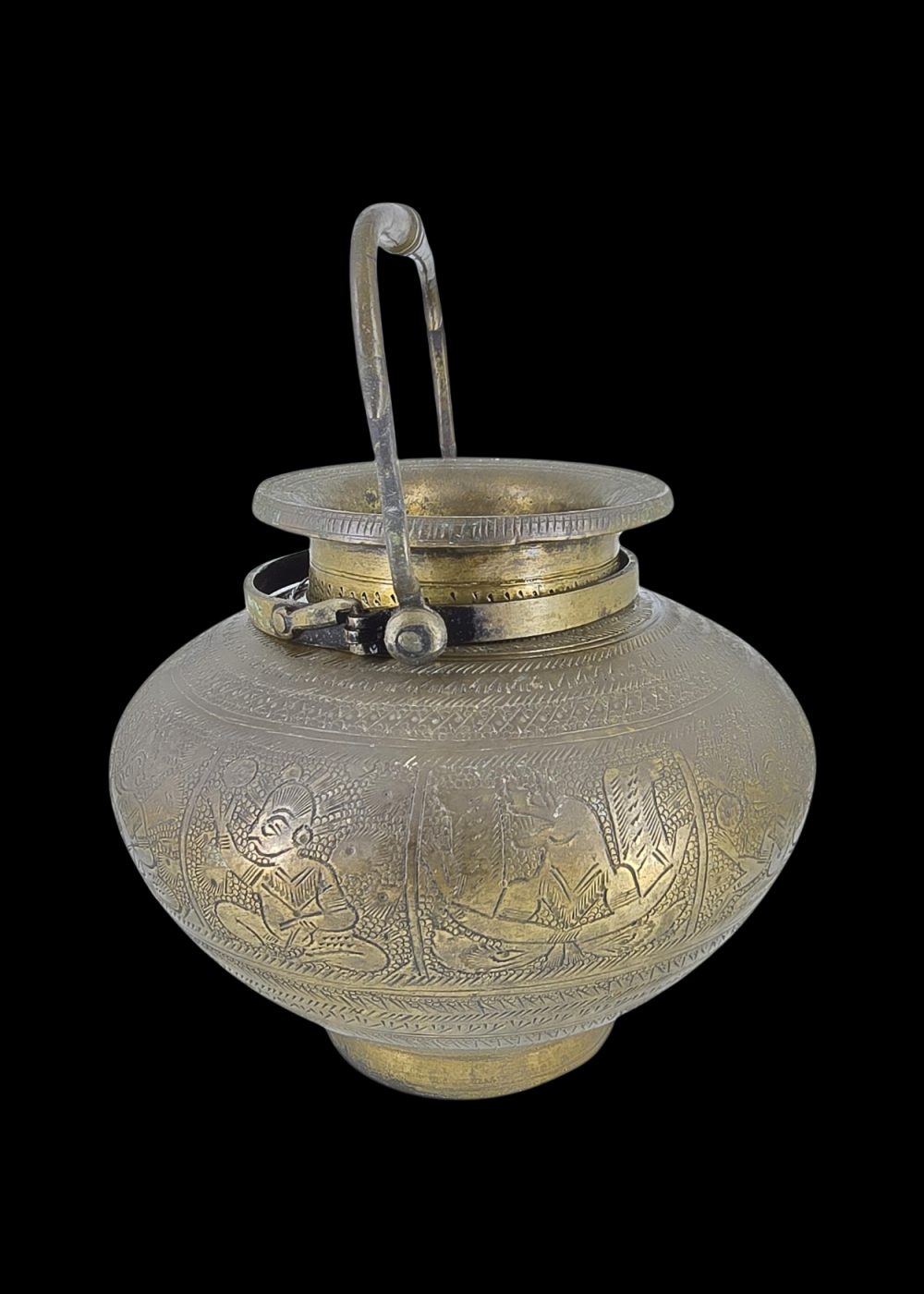 This is an antique brass water pot, known as a lota, featuring intricate etched designs and a gracefully arched handle. The vessel’s surface displays elaborate floral and figural motifs, reflecting skilled craftsmanship and traditional Indian metalwork. This lota was commonly used both decoratively and in daily rituals.