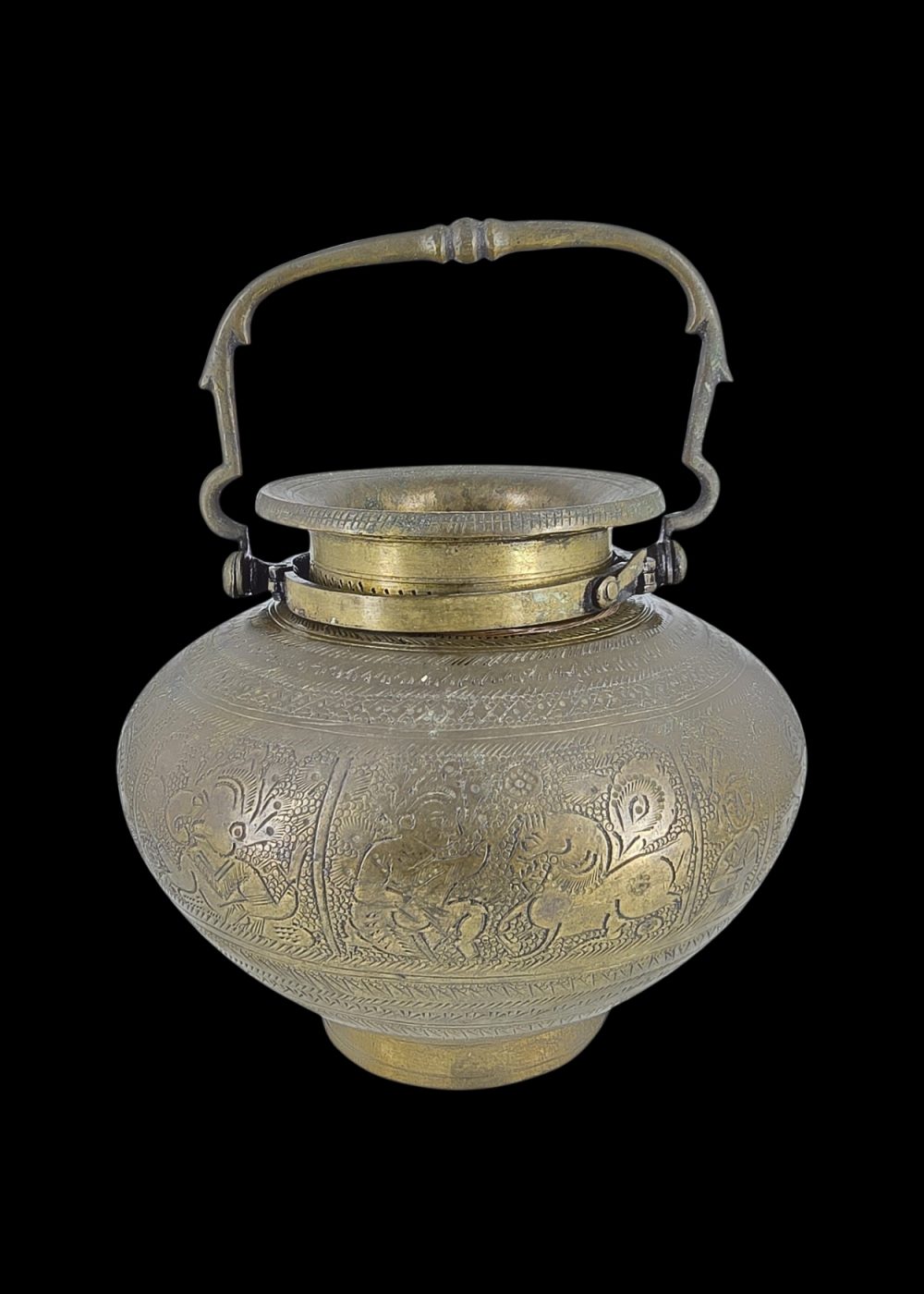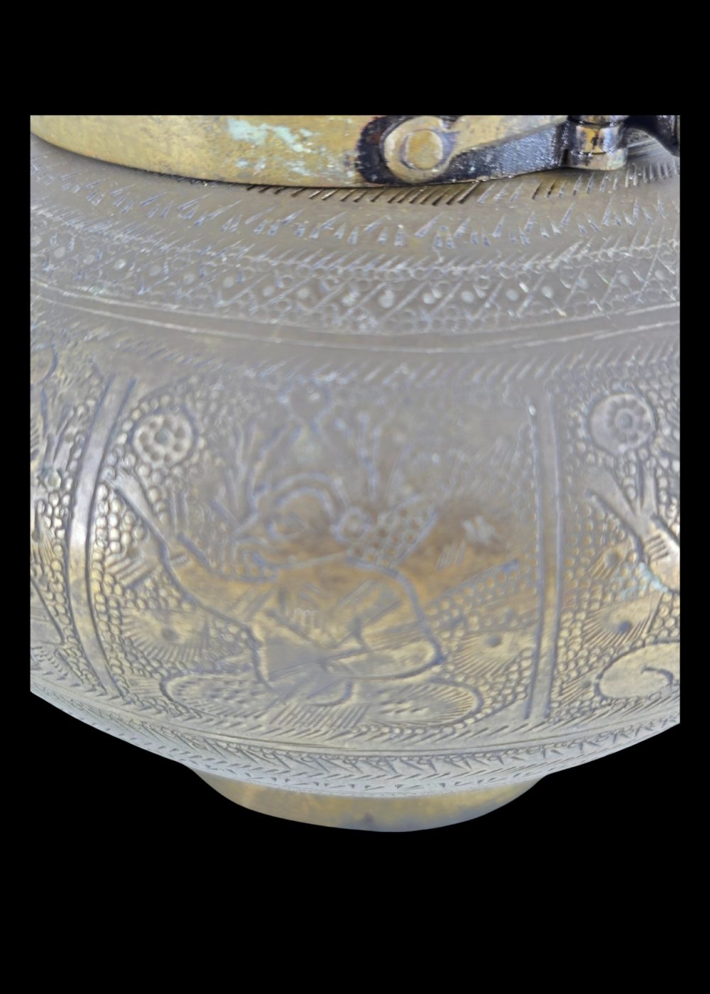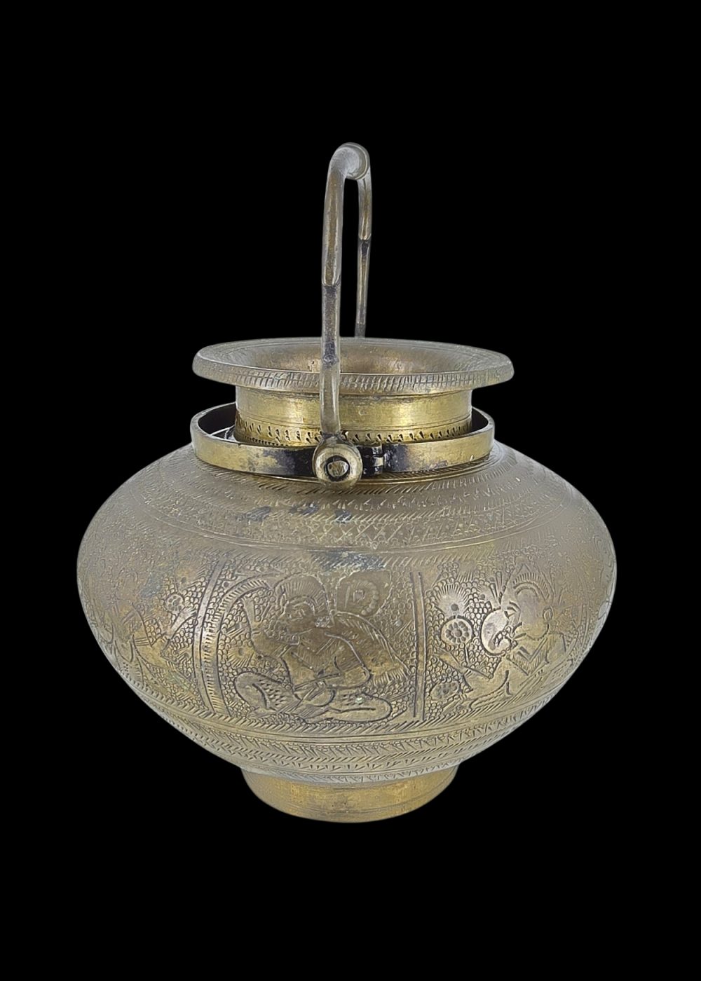 This is an antique brass water pot, known as a lota, featuring intricate etched designs and a gracefully arched handle. The vessel’s surface displays elaborate floral and figural motifs, reflecting skilled craftsmanship and traditional Indian metalwork. This lota was commonly used both decoratively and in daily rituals.