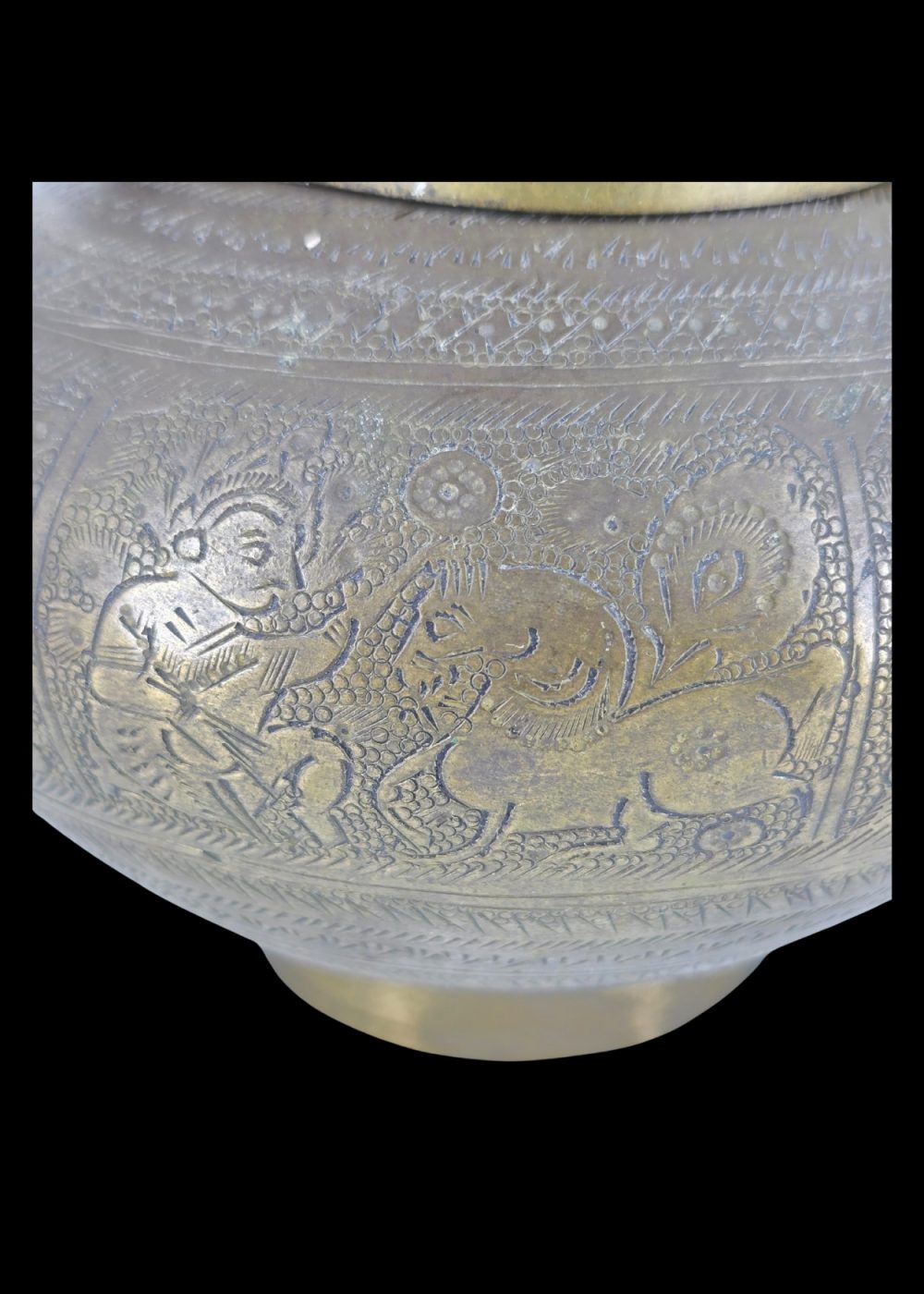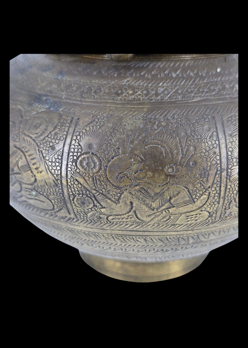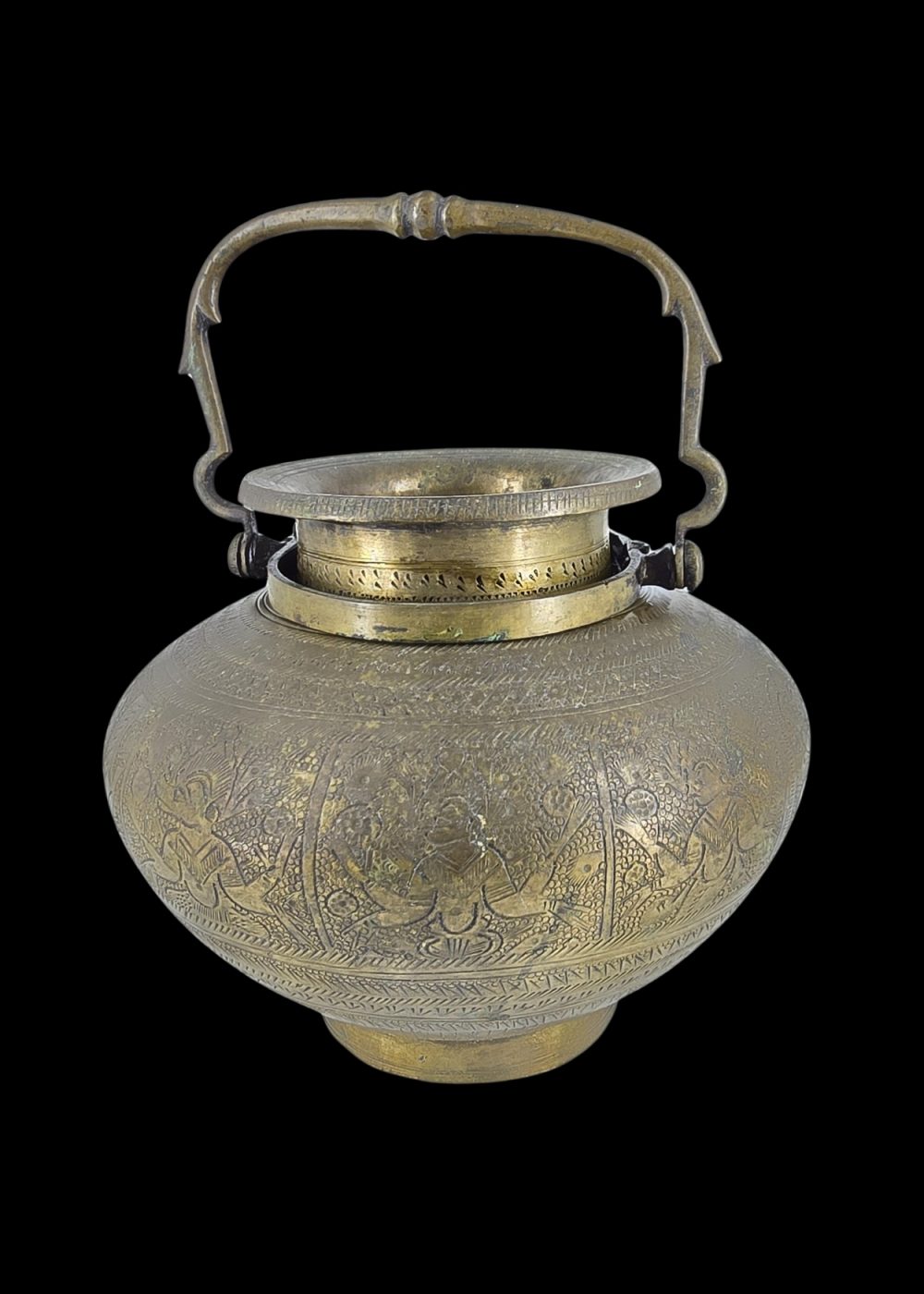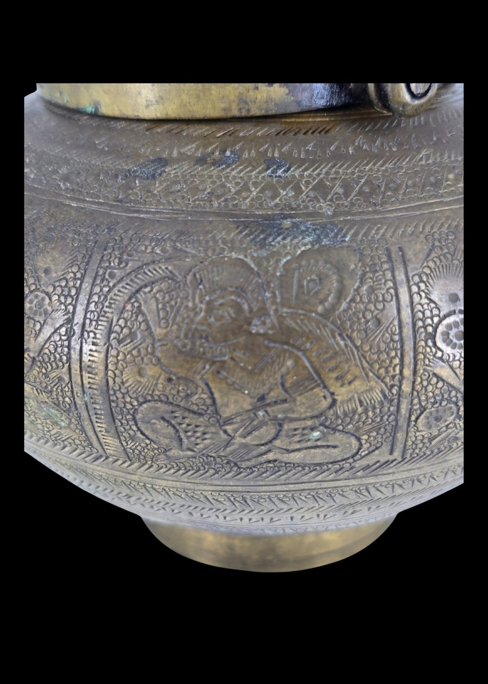 This is an antique brass water pot, known as a lota, featuring intricate etched designs and a gracefully arched handle. The vessel’s surface displays elaborate floral and figural motifs, reflecting skilled craftsmanship and traditional Indian metalwork. This lota was commonly used both decoratively and in daily rituals.