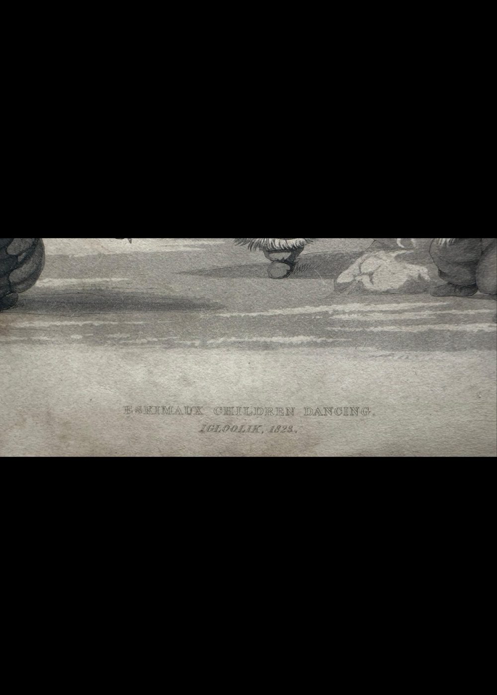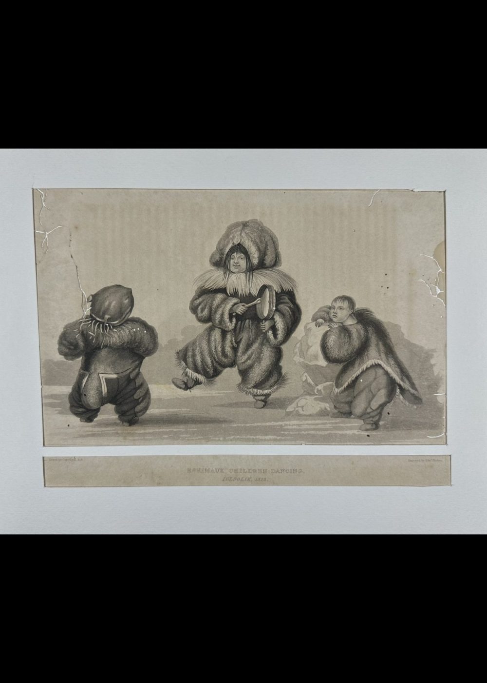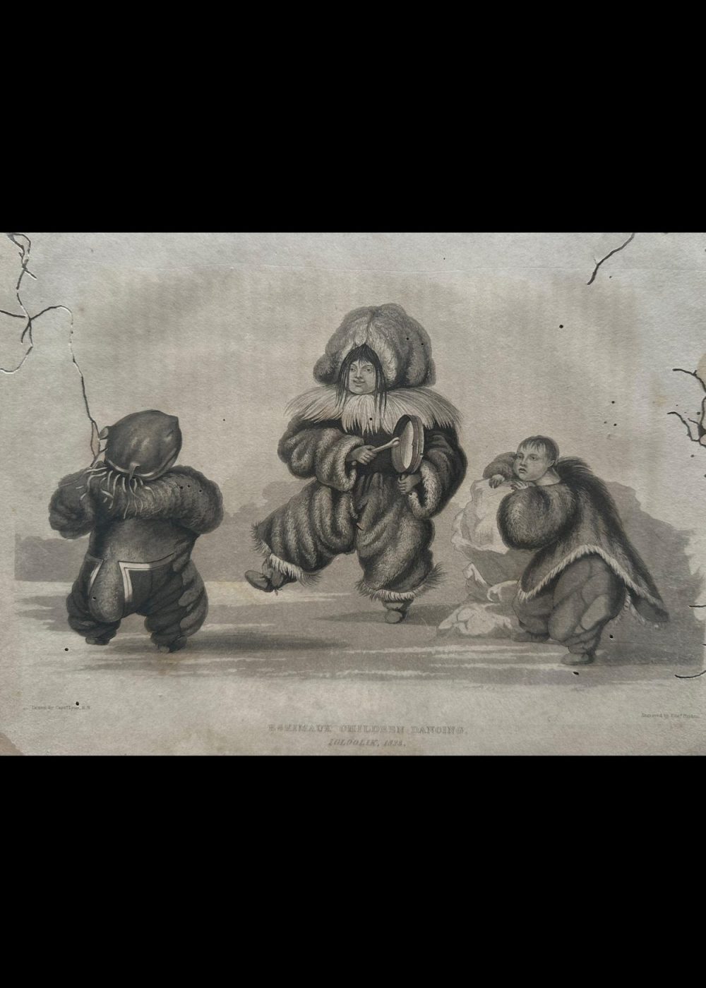 This charming 19th-century engraving, drawn by Capt. Lyon and engraved by Edw. Finden, depicts Inuit children joyfully dancing in traditional fur garments in Igloolik, 1823. One child beats a hand drum while others dance with animated expressions, capturing a lively moment of cultural expression and communal joy. The scene offers a rare and humanizing glimpse into Inuit childhood and the role of music and dance in their daily life
