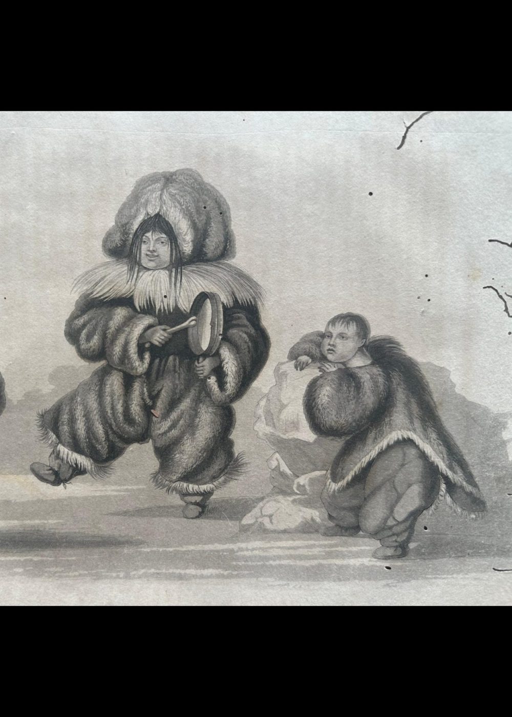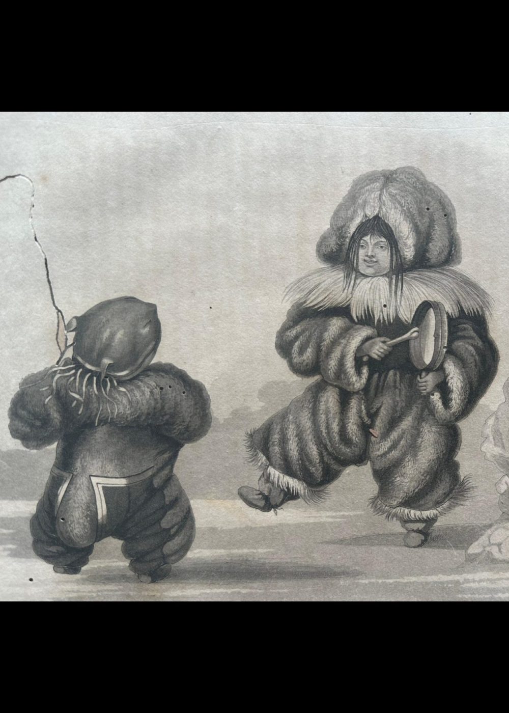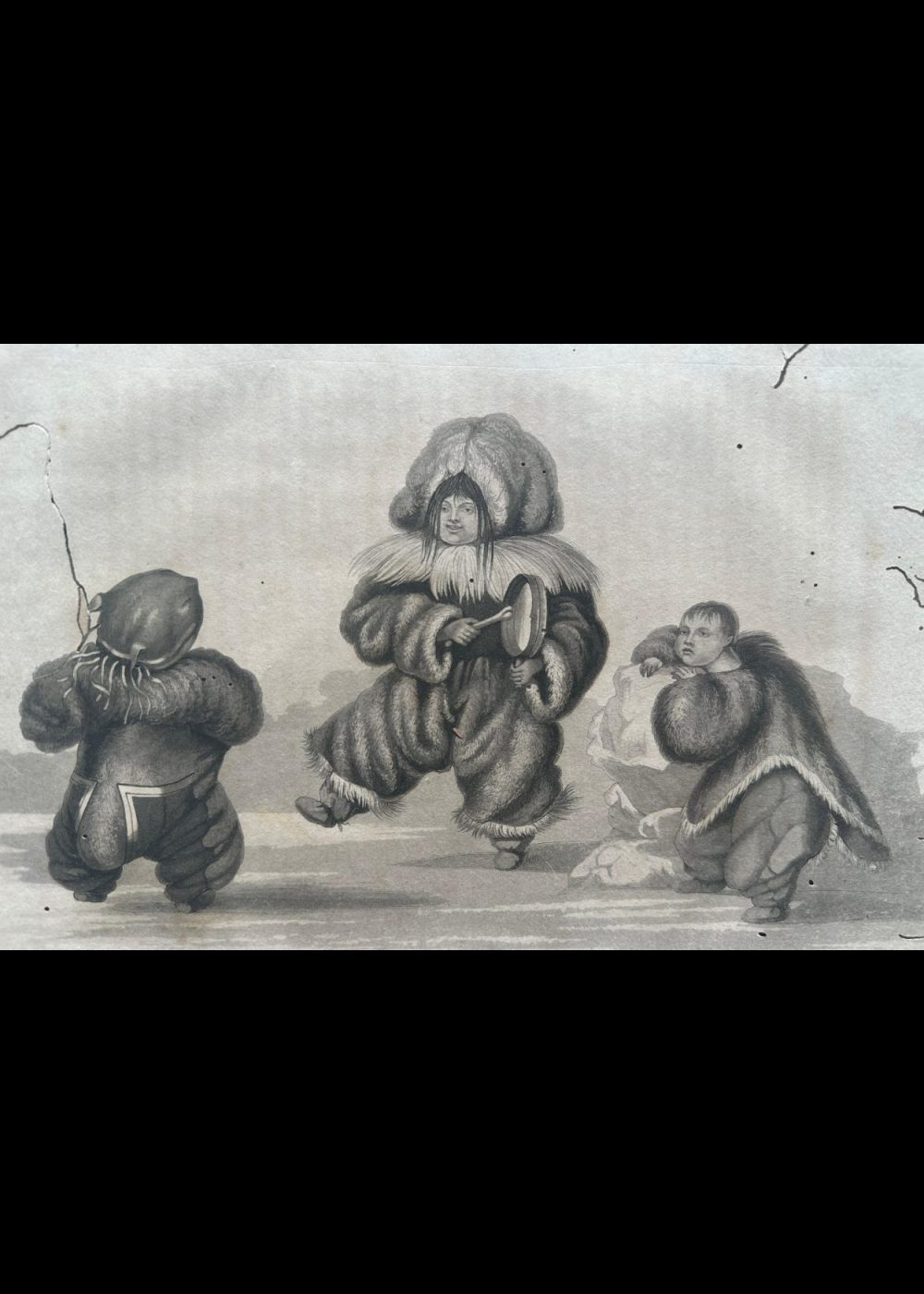 This charming 19th-century engraving, drawn by Capt. Lyon and engraved by Edw. Finden, depicts Inuit children joyfully dancing in traditional fur garments in Igloolik, 1823. One child beats a hand drum while others dance with animated expressions, capturing a lively moment of cultural expression and communal joy. The scene offers a rare and humanizing glimpse into Inuit childhood and the role of music and dance in their daily life