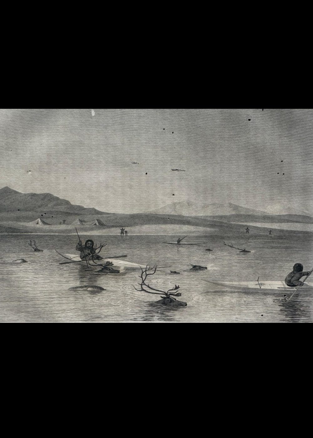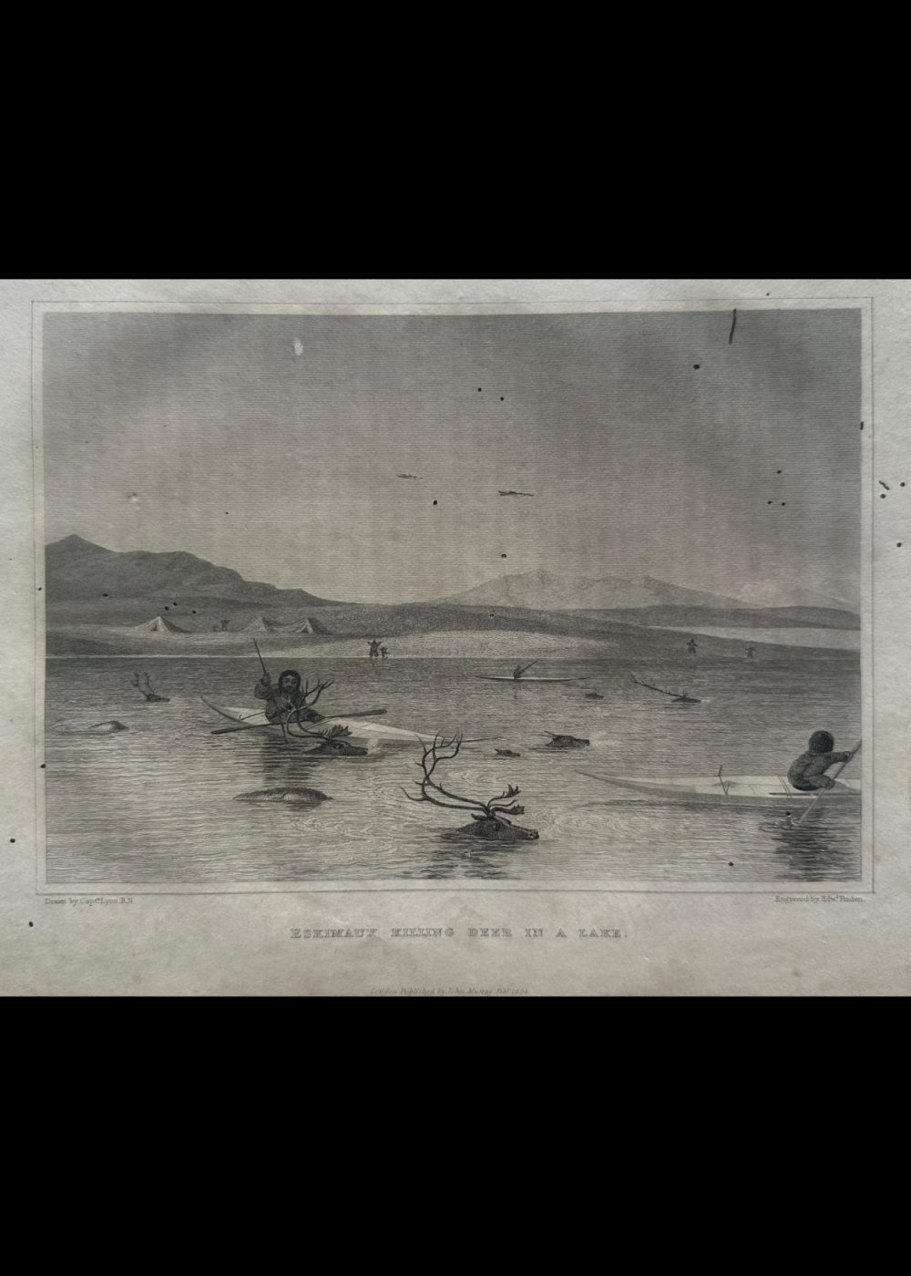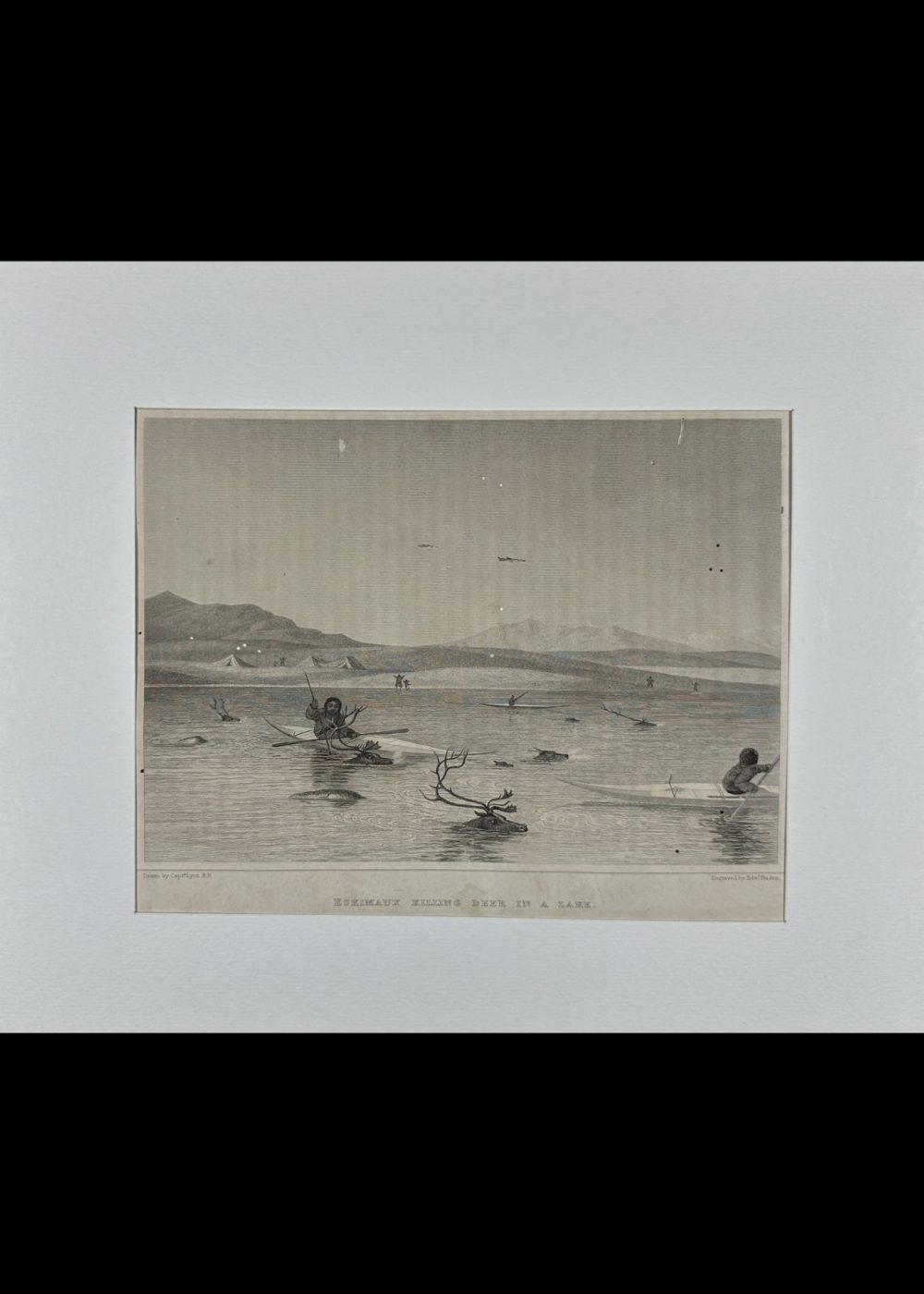 This 19th-century engraving, drawn by Capt. Lyon and engraved by Edw. Finden, illustrates Inuit hunters in kayaks pursuing deer across a shallow lake. The composition captures a dramatic moment of traditional hunting, with the figures using spears and paddles amid floating carcasses. In the background, distant tents and mountainous terrain evoke the vast Arctic landscape and the nomadic lifestyle of the Inuit people.