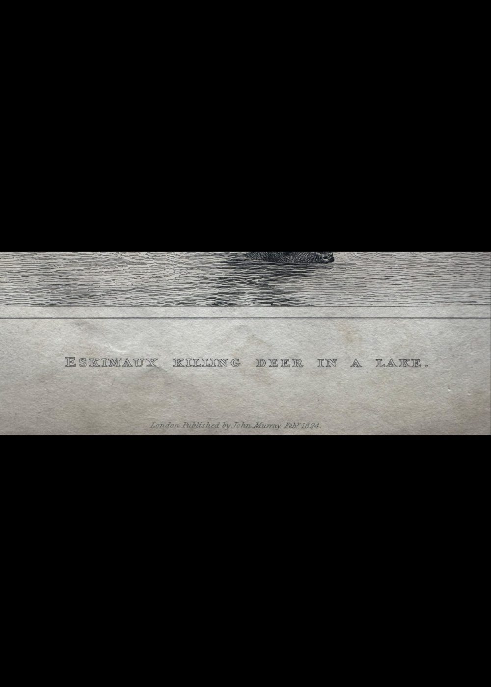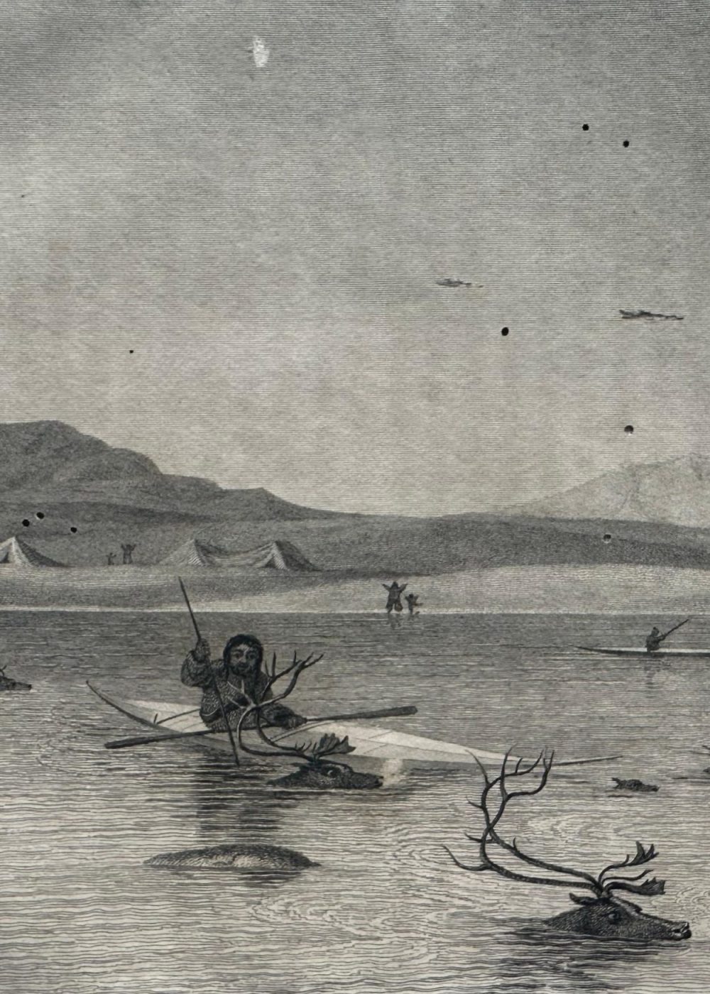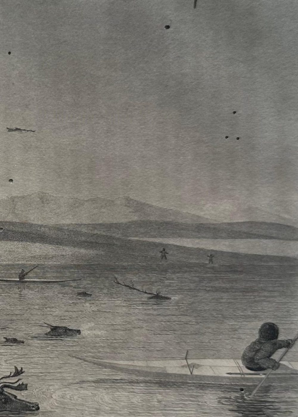 This 19th-century engraving, drawn by Capt. Lyon and engraved by Edw. Finden, illustrates Inuit hunters in kayaks pursuing deer across a shallow lake. The composition captures a dramatic moment of traditional hunting, with the figures using spears and paddles amid floating carcasses. In the background, distant tents and mountainous terrain evoke the vast Arctic landscape and the nomadic lifestyle of the Inuit people.