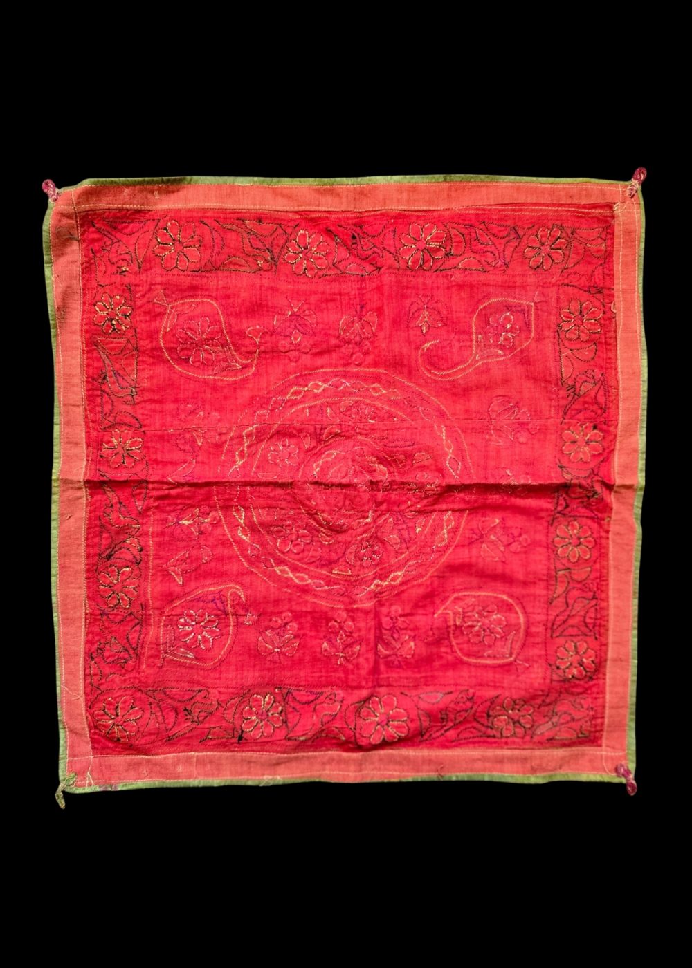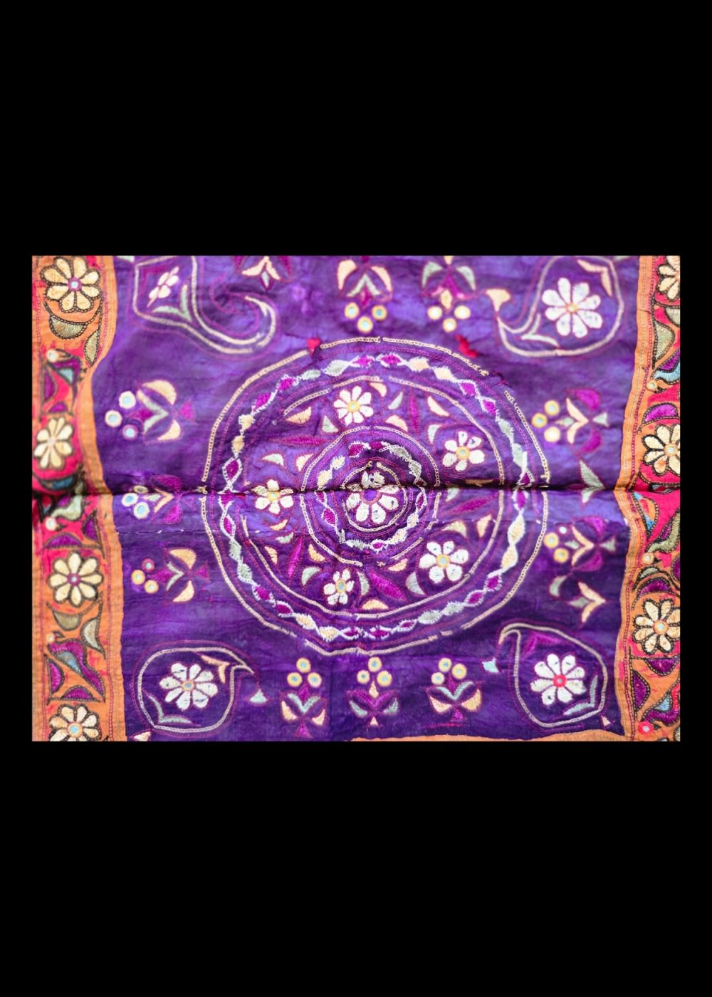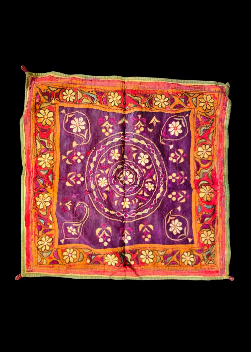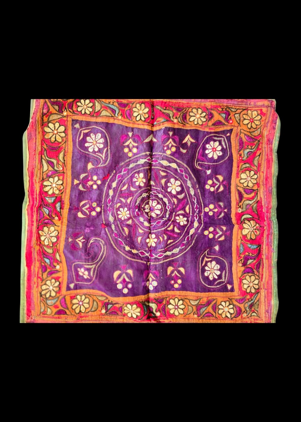 This vibrant Mochi work chakla showcases traditional embroidery from Gujarat, featuring fine chain stitch executed with aari (hook) work. The design highlights floral and vine motifs arranged in concentric circular and border patterns, rendered in bright hues of purple, orange, red, and yellow. Traditionally used as decorative cloths during rituals and festive occasions, this chakla reflects the skilled craftsmanship and cultural richness of Mochi embroidery.