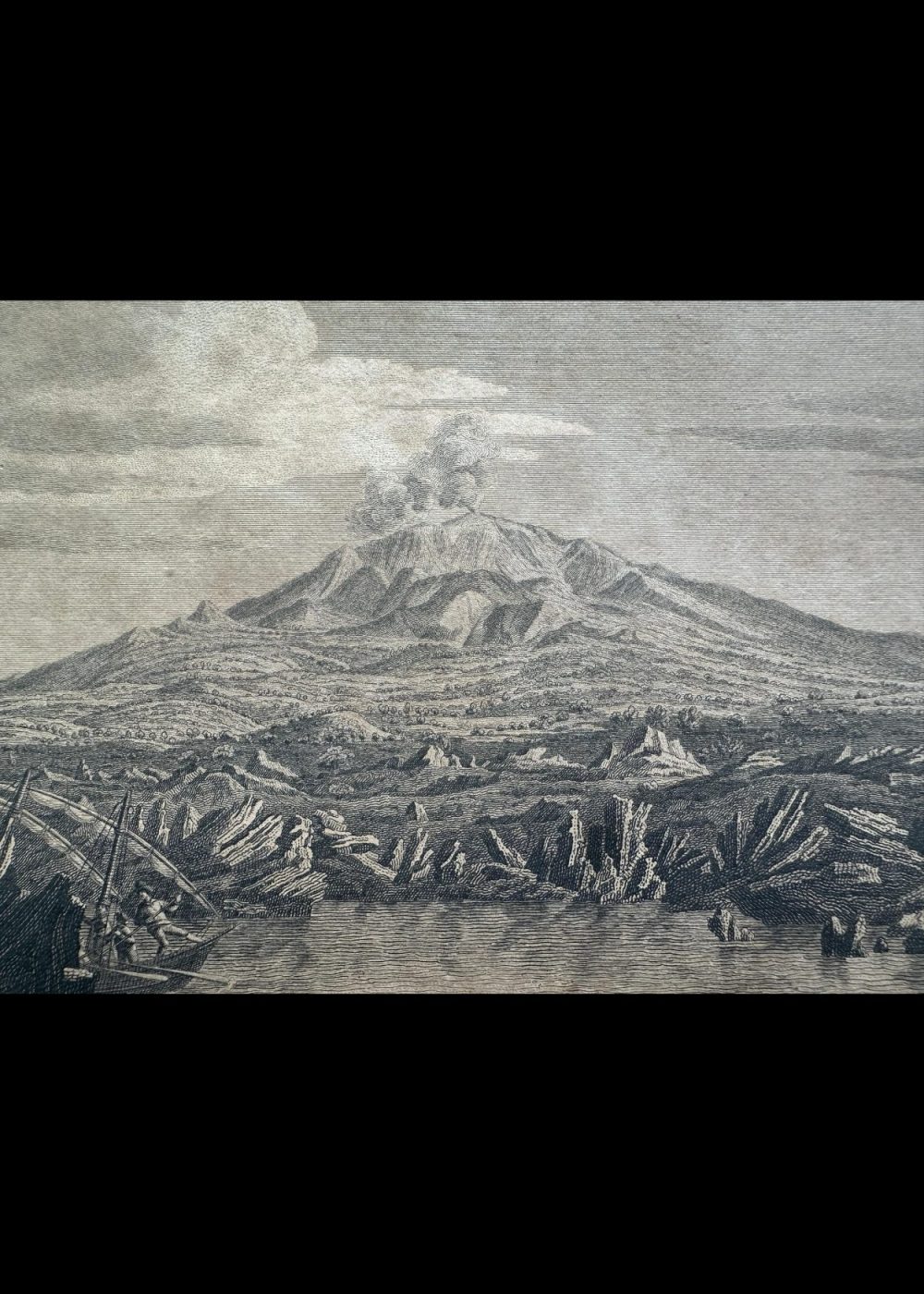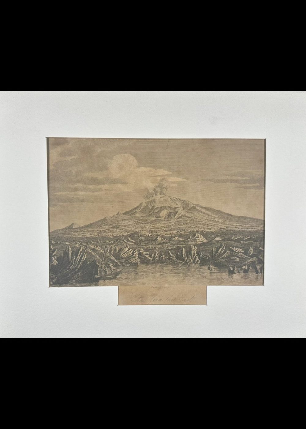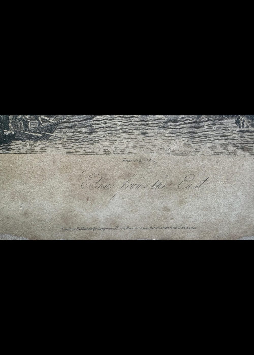 This is a historical engraving titled “Etna from the East,” depicting Mount Etna, the iconic stratovolcano located on the east coast of Sicily, Italy. The view shows the mountain from a low vantage point, emphasizing its grandeur as it rises above the surrounding landscape. Smoke curls upward from the summit, indicating volcanic activity. The foreground features a rocky shoreline with sharp, jagged lava formations, and a small sailboat moored in calm water, hinting at human presence and travel. The middle ground is filled with terraced slopes and cultivated fields that gradually ascend the mountain. Etna’s rugged summit dominates the background under a cloudy sky, adding drama to the composition. The engraving bears the signature “Engraved by W. Cooke” beneath the image and includes a publication line at the bottom: “London, Published by Longman, Hurst, Rees, Orme & Brown, Paternoster Row, Jan. 1, 1819.” This print is a fine example of early 19th-century landscape art, blending scientific observation with romantic aesthetics.