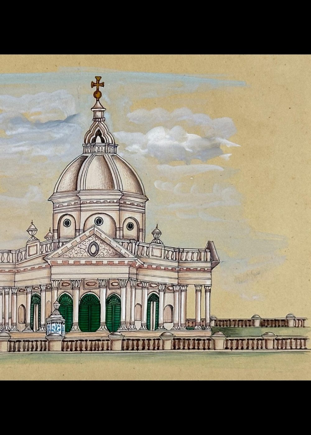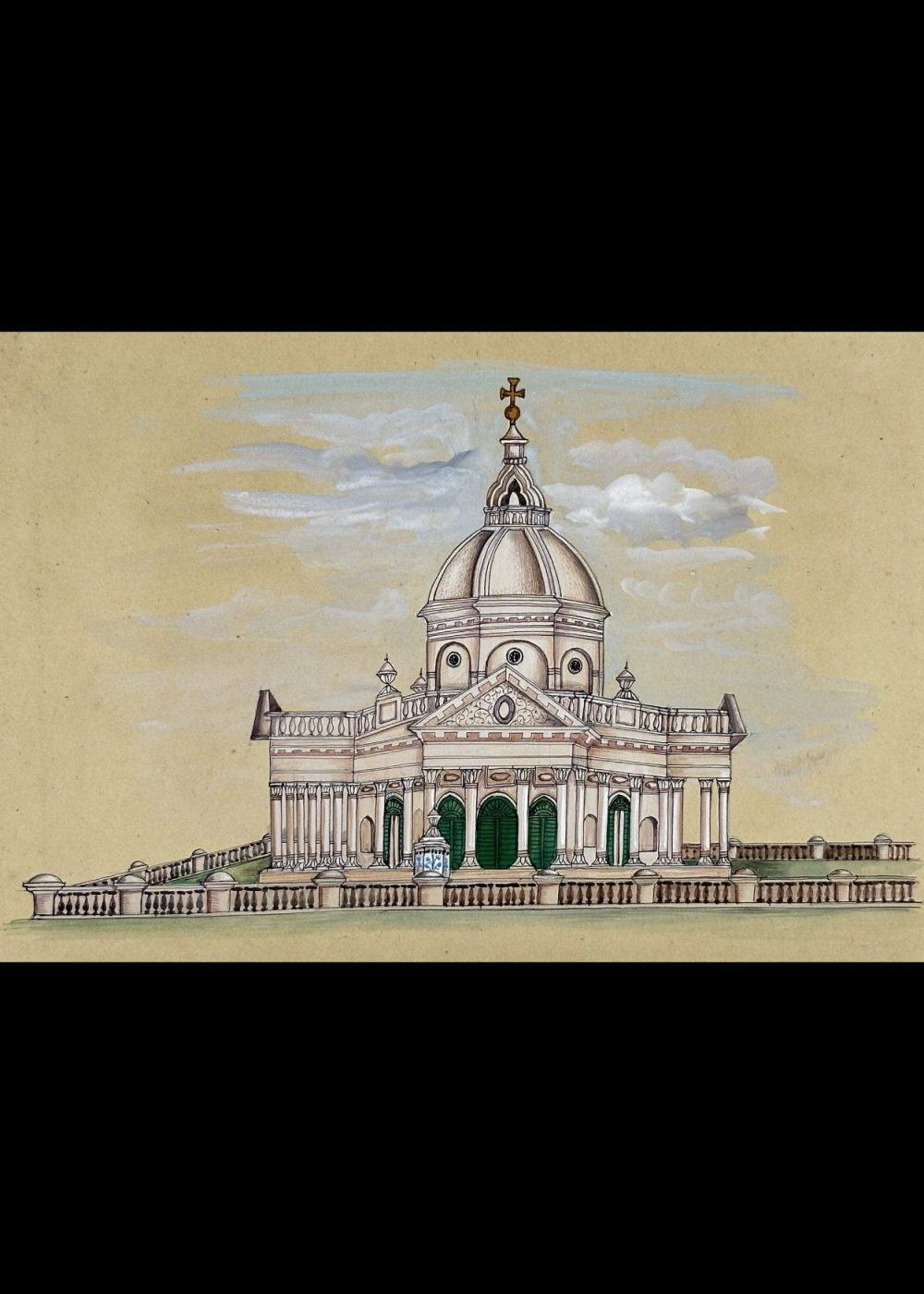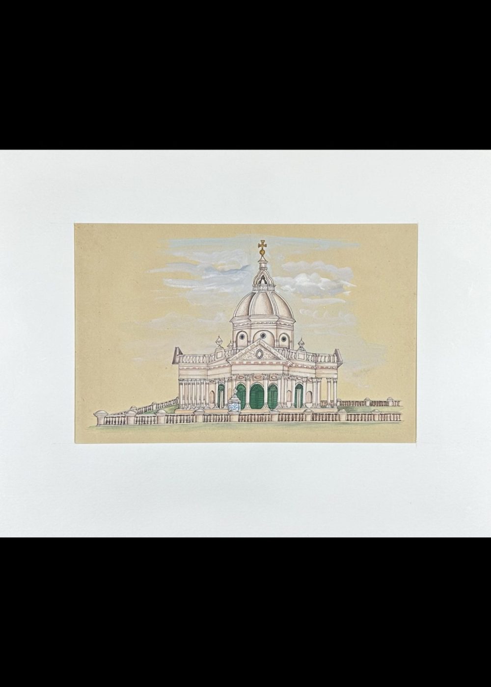 This elegant miniature painting depicts a European-style domed church, rendered with delicate linework and subtle shading. The architecture, influenced by Renaissance and Baroque styles, features a large central dome topped with a cross, flanked by classical columns, arched doorways, and a detailed balustrade enclosing the structure.
