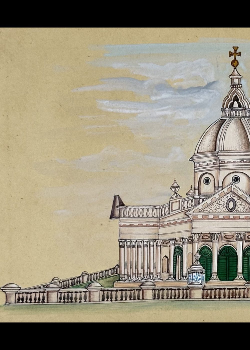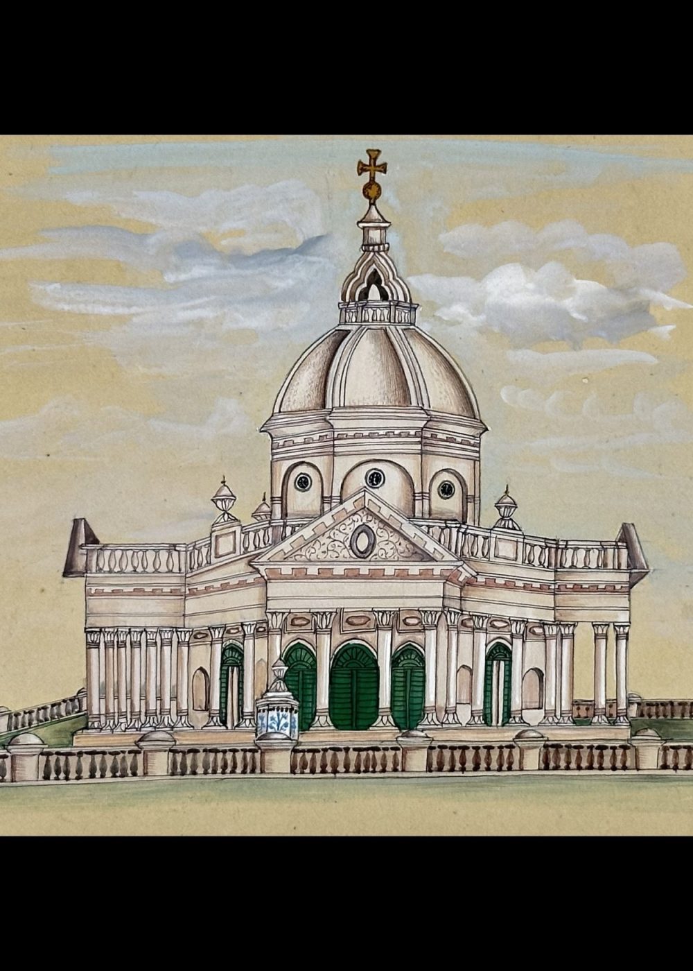 Likely painted during the colonial period in India, this work reflects the cultural intersections of the time—when Indian artists, trained in miniature traditions, turned their attention to documenting European-style civic and religious buildings. It stands as a unique blend of Western architecture and Indian artistic craftsmanship.