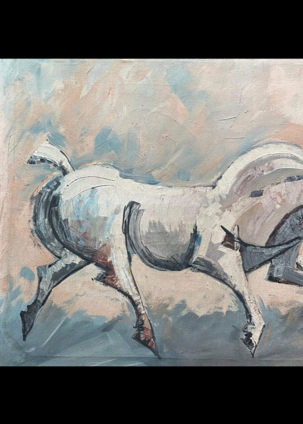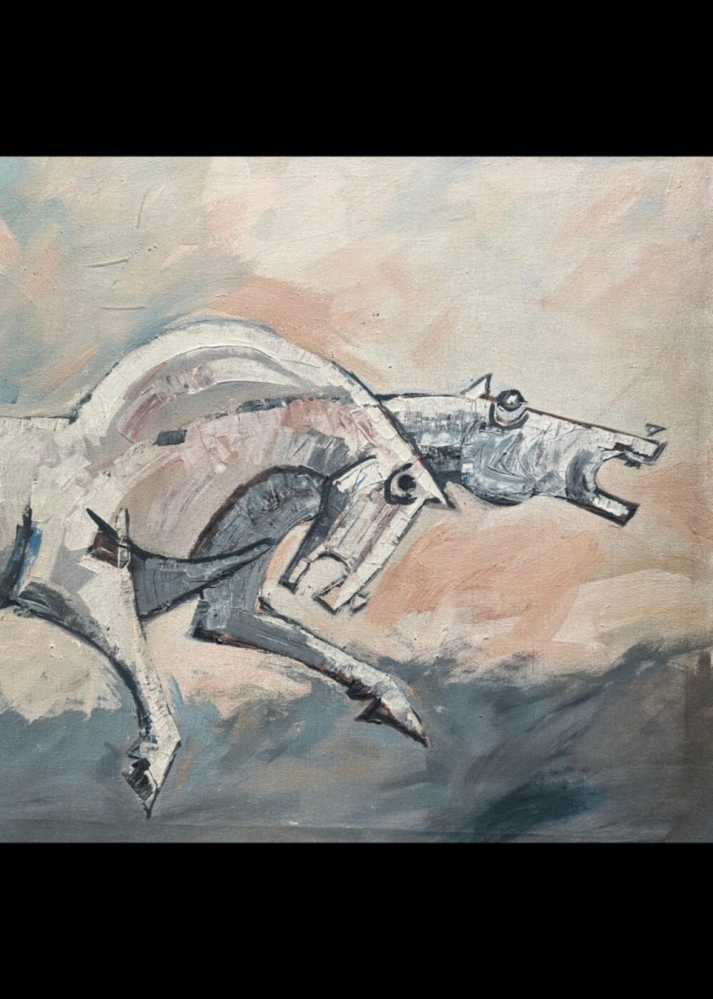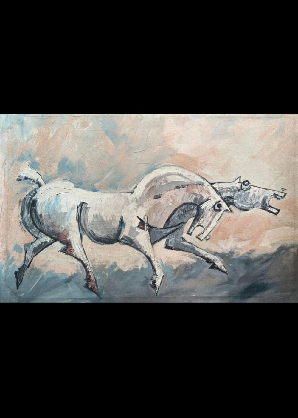 This dynamic modernist painting portrays two expressive horses in motion, rendered with bold, angular strokes and a muted earthy palette. The stylized forms and raw energy reflect influences of Indian expressionism, emphasizing emotion and movement over realism. The piece captures a sense of urgency and vitality, making it a striking example of 20th-century contemporary Indian art.