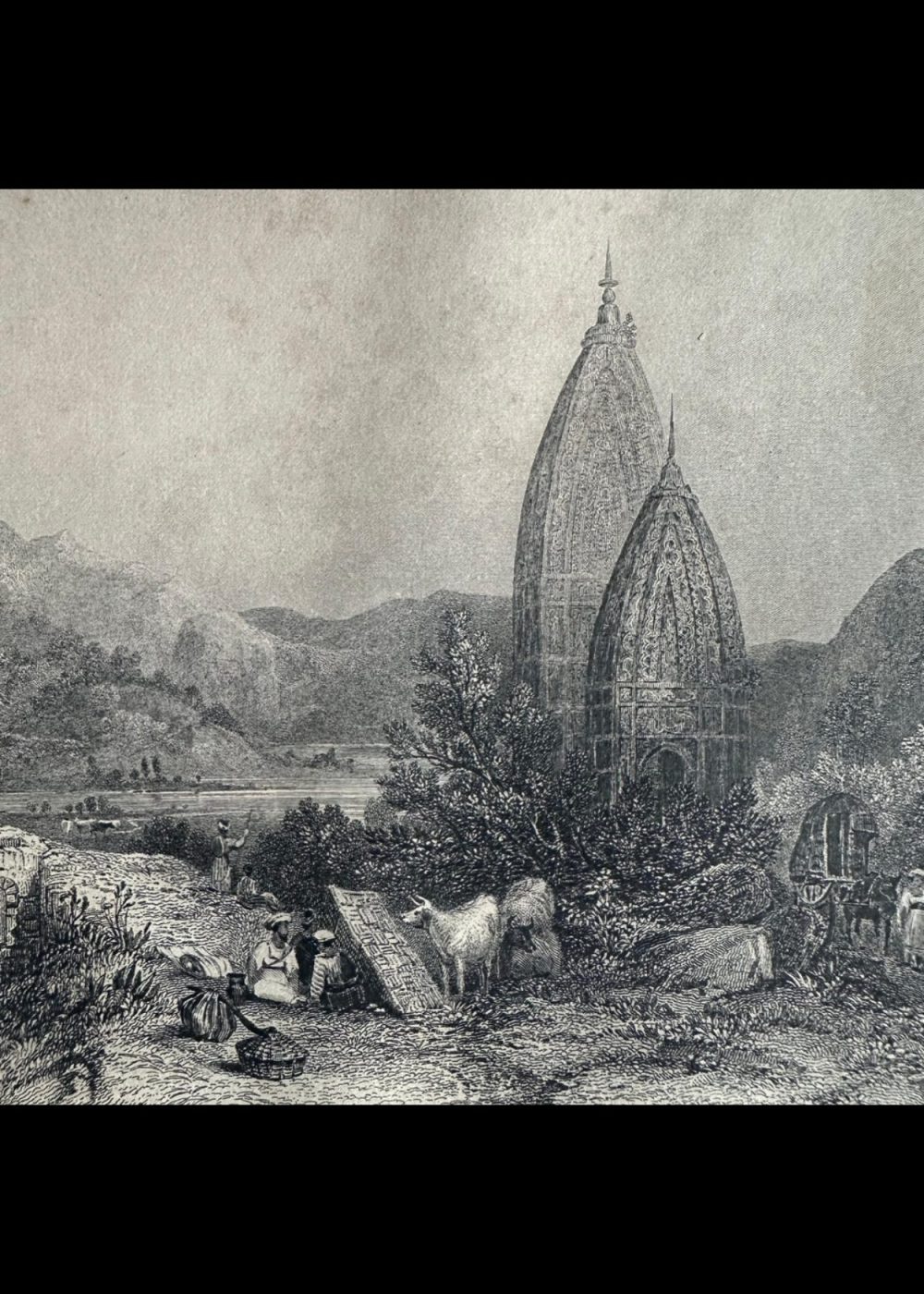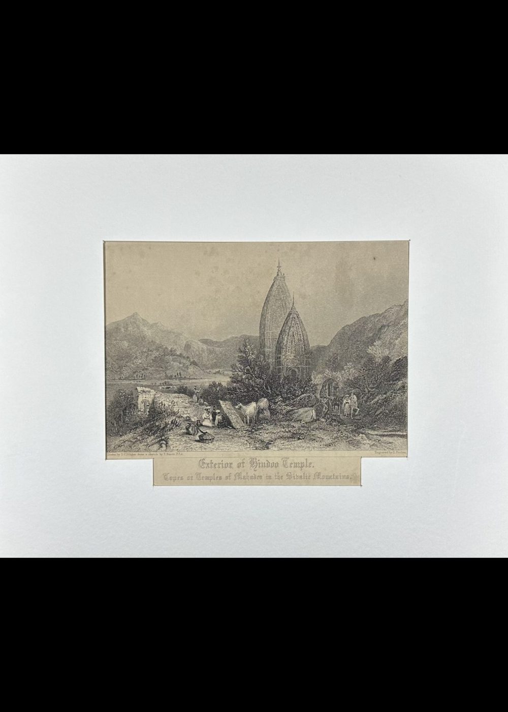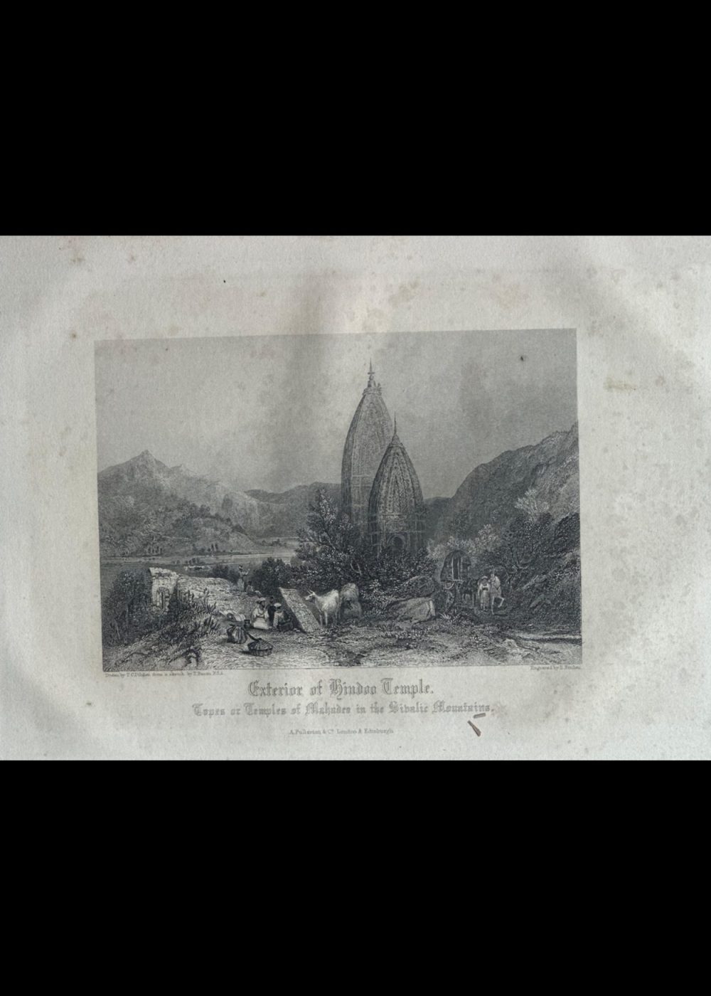 “THE FAITHS IN THE WORLD”. A dictionary of all religions and their religious sects. by The Rev. James Gardner. This 19th-century engraving illustrates the exterior of a Hindu temple complex dedicated to Mahadeo (a form of Lord Shiva) in the Sutlej mountain region. Dominated by towering shikharas (temple spires), the temple stands amidst a rugged and scenic Himalayan landscape. The foreground features daily village life with people, cattle, and an ox-drawn cart, creating a vivid contrast between the sacred and the pastoral. The artwork captures the spiritual isolation and natural beauty of temples nestled in the highlands of northern India.