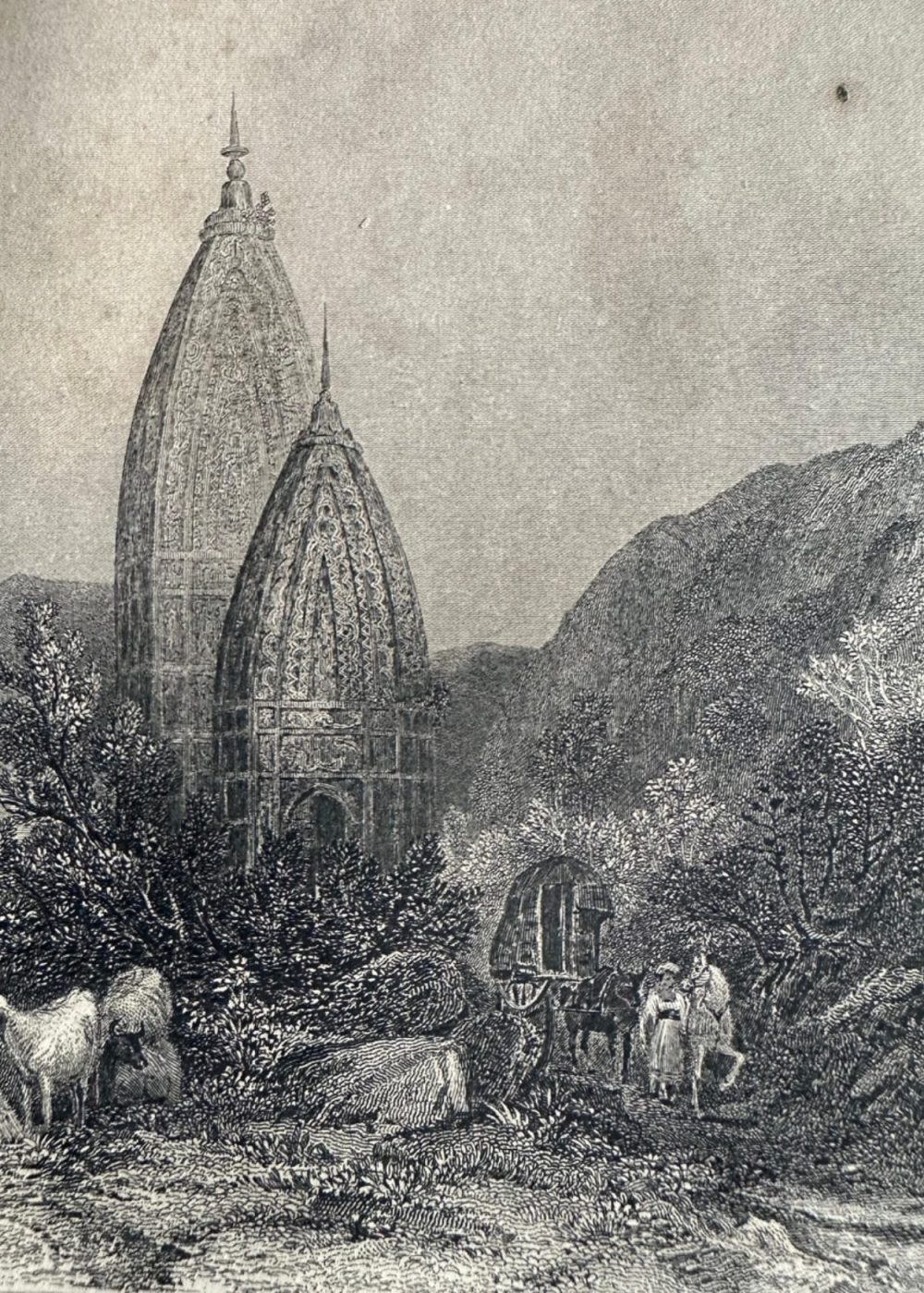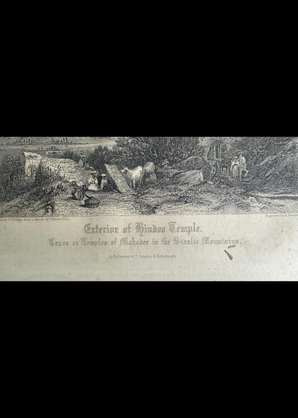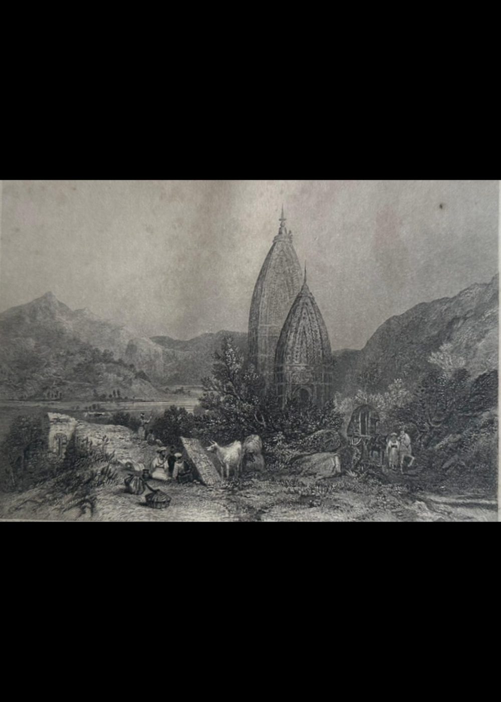 “THE FAITHS IN THE WORLD”. A dictionary of all religions and their religious sects. by The Rev. James Gardner. This 19th-century engraving illustrates the exterior of a Hindu temple complex dedicated to Mahadeo (a form of Lord Shiva) in the Sutlej mountain region. Dominated by towering shikharas (temple spires), the temple stands amidst a rugged and scenic Himalayan landscape. The foreground features daily village life with people, cattle, and an ox-drawn cart, creating a vivid contrast between the sacred and the pastoral. The artwork captures the spiritual isolation and natural beauty of temples nestled in the highlands of northern India.